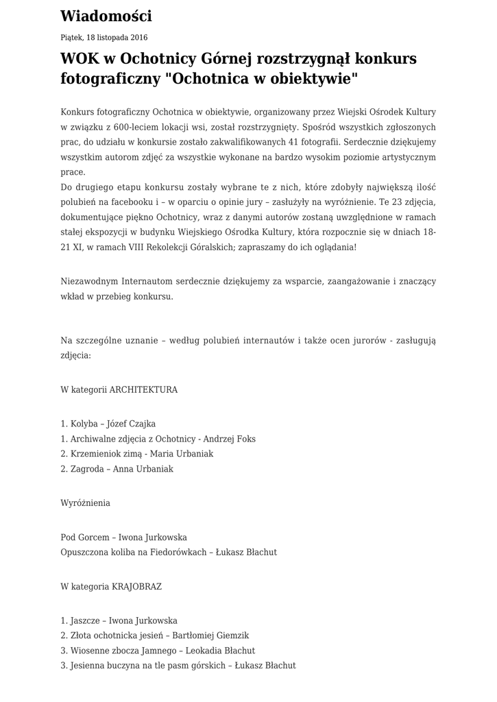 Wiadomości Piątek, 18 listopada 2016 WOK w Ochotnicy Górnej rozstrzygnął konkurs fotograficzny "Ochotnica w obiektywie" Konkurs fotograficzny Ochotnica w obiektywie, organizowany przez Wiejski Ośrodek Kultury w związku z 600-leciem lokacji wsi, został rozstrzygnięty. Spośród wszystkich zgłoszonych prac, do udziału w konkursie zostało zakwalifikowanych 41 fotografii. Serdecznie dziękujemy wszystkim autorom zdjęć za wszystkie wykonane na bardzo wysokim poziomie artystycznym prace. Do drugiego etapu konkursu zostały wybrane te z nich, które zdobyły największą ilość polubień na facebooku i – w oparciu o opinie jury – zasłużyły na wyróżnienie. Te 23 zdjęcia, dokumentujące piękno Ochotnicy, wraz z danymi autorów zostaną uwzględnione w ramach stałej ekspozycji w budynku Wiejskiego Ośrodka Kultury, która rozpocznie się w dniach 1821 XI, w ramach VIII Rekolekcji Góralskich; zapraszamy do ich oglądania! Niezawodnym Internautom serdecznie dziękujemy za wsparcie, zaangażowanie i znaczący wkład w przebieg konkursu. Na szczególne uznanie – według polubień internautów i także ocen jurorów - zasługują zdjęcia: W kategorii ARCHITEKTURA 1. Kolyba – Józef Czajka 1. Archiwalne zdjęcia z Ochotnicy - Andrzej Foks 2. Krzemieniok zimą - Maria Urbaniak 2. Zagroda – Anna Urbaniak Wyróżnienia Pod Gorcem – Iwona Jurkowska Opuszczona koliba na Fiedorówkach – Łukasz Błachut W kategoria KRAJOBRAZ 1. Jaszcze – Iwona Jurkowska 2. Złota ochotnicka jesień – Bartłomiej Giemzik 3. Wiosenne zbocza Jamnego – Leokadia Błachut 3. Jesienna buczyna na tle pasm górskich – Łukasz Błachut Wyróżnienia Cuda Natury- Iwona Jurkowska Pierwsze oznaki zimy w dolinie Jamnego - Anna Błachut Czekając na wschód – Bartłomiej Giemzik Przy szlaku - Aleksandra Urbaniak Autorom wyróżnionych fotografii serdecznie gratulujemy i prosimy spodziewać się przesyłki pocztowej. Poniżej prezentujemy wyróżnione fotografie z podpisem ich autorów, kolejność jest przypadkowa. 1. Skałka - Andrzej Foks 2. Skałka 1982 – Andrzej Foks 3. Skałka 1988 – Andrzej Foks 4. Magurki – Borsuczyny 1988 - Andrzej Foks 5. Dom B. Balcer – Andrzej Foks 6. Dom S. Szlagi (nieistniejący) – Andrzej Foks 7. Dom Janczurów i M. Jurkowskiej – Andrzej Foks 8. Dom A. Królczyk – Andrzej Foks 9. Cuda Natury – Iwona Jurkowska 10. Czekając na wschód – Bartłomiej Giemzik 11. Jaszcze - Iwona Jurkowska 12. Jesienna buczyna na tle pasm górskich – Łukasz Błachut 13. Krzemieniok zimą – Maria Urbaniak 14. Opuszczona koliba na Fiedorówkach – Łukasz Błachut 15. Pierwsze oznaki zimy w dolinie Jamnego – Anna Błachut 16. Pod Gorcem – Iwona Jurkowska 17. Podhale z Magurek – Leokadia Błachut 18. Przy szlaku – Aleksandra Urbaniak 19. Wiosenne zbocza Jamnego – Leokadia Błachut 20. Zagroda – Anna Urbaniak 21.Złota ochotnicka jesień – Bartłomiej Giemzik 22. Kolyba – Józef Czajka 23. Ponad chmury – Bartłomiej Giemzik Źródło: www.wokgorna.ochotnica.pl