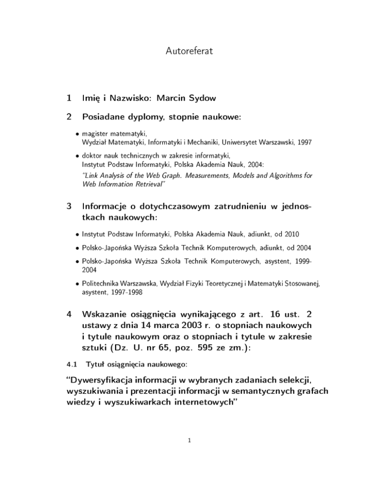 Autoreferat 1 Imi¦ i Nazwisko: Marcin Sydow 2 Posiadane dyplomy, stopnie naukowe: • magister matematyki, Wydziaª Matematyki, Informatyki i Mechaniki, Uniwersytet Warszawski, 1997 • doktor nauk technicznych w zakresie informatyki, Instytut Podstaw Informatyki, Polska Akademia Nauk, 2004: Link Analysis of the Web Graph. Measurements, Models and Algorithms for Web Information Retrieval 3 Informacje o dotychczasowym zatrudnieniu w jednostkach naukowych: • Instytut Podstaw Informatyki, Polska Akademia Nauk, adiunkt, od 2010 • Polsko-Japo«ska Wy»sza Szkoªa Technik Komputerowych, adiunkt, od 2004 • Polsko-Japo«ska Wy»sza Szkoªa Technik Komputerowych, asystent, 19992004 • Politechnika Warszawska, Wydziaª Fizyki Teoretycznej i Matematyki Stosowanej, asystent, 1997-1998 4 Wskazanie osi¡gni¦cia wynikaj¡cego z art. 16 ust. 2 ustawy z dnia 14 marca 2003 r. o stopniach naukowych i tytule naukowym oraz o stopniach i tytule w zakresie sztuki (Dz. U. nr 65, poz. 595 ze zm.): 4.1 Tytuª osi¡gni¦cia naukowego: Dywersykacja informacji w wybranych zadaniach selekcji, wyszukiwania i prezentacji informacji w semantycznych grafach wiedzy i wyszukiwarkach internetowych 1 4.2 1. Cykl 6 publikacji stanowi¡cych osi¡gni¦cie naukowe: [SPS13] M.Sydow, The Notion of Diversity in M.Pikuªa, R.Schenkel Graphical Entity Summarisation on Semantic Knowledge Graphs Journal of Intelligent Information Systems, Volume 41, Issue 2, pp. 109-149, ISSN 0925-9902, DOC: 10.1007/s10844-013-0239-6, Springer, 2013. (na li±cie JCR Wkªad wªasny: 20 cytowa« 2. [KKRS13] i w bazie 70% Web of Science, Impact Factor: 0.632) (M.Pikuªa: 20%, R.Schenkel: 10%) (Google Scholar), 2 cytowania (Web of Science) W.Kosi«ski, T.Ku±mierczyk, P.Rembelski, M.Sydow Appli- cation of Ant-Colony Optimisation to Compute Diversied Entity Summarisation on Semantic Knowledge Graphs , Science and Information Systems, Volume 1, pp. (also: Proc. of International IEEE AAIA 2013/FedCSIS Conference, ISBN 978-1-4673-4471-5), PTI/IEEE, 2013. (obecna w bazie Wkªad wªasny: 3. Annals of Computer 69-76, ISSN 2300-5963, 40% Web of Science) (W.Kosi«ski,T.Ku±mierczyk po 25%, P.Rembelski 10%) [Syd14a] M.Sydow Approximation Guarantees for Max Sum and Max Min Facility Dispersion with Parameterised Triangle Inequality and Applications in Result Diversication Mathematica Applicanda vol. 42(2), pp. (extended journal version) 241257, Print ISSN: 1730-2668, On-line ISSN: 2299-4009, DOI: 10.14708/ma.v42i0.547, PTM, 2014. Wkªad wªasny: 4. [MSS14] 100% S.Metzger, R.Schenkel, M.Sydow Aspect-based Similar En- tity Search in Semantic Knowledge Graphs with Diversity-awareness and Relaxation Proceedings of the IEEE/WIC/ACM WI-IAT 2014 (Intern. Joint Conference on Web Intelligence and Intell. Agent Techn.), pp. 60-69, ISBN 978-1-4799-4143-8, DOI 10.1109/WI-IAT.2014.17, IEEE Computer Society, 2014. Wkªad wªasny: 1 cytowanie 5. 25% (S.Metzger: 50%, R.Schenkel: 25%) (Google Scholar) [SBCD09] M.Sydow, F.Bonchi, C.Castillo, D.Donato ical Query Decomposition Proc. Optimising Top- of WSCD09 (collocated with ACM WSDM 2009 Conference) pp. 43-47, ISBN 978-1-60558-434-8, DOI: 10.1145/1507509.1507516, ACM, 2009. Wkªad wªasny: 5 cytowa« 6. 65% (F.Bonchi 15%, C.Castillo 10%, D.Donato 10%) (Google Scholar) [SCW12] M.Sydow, K.Ciesielski, J.Wajda Introducing Diversity to Log-based Query Suggestions to Deal with Underspecied User Queries , LNCS Vol. 7053, pp. 251-264 (Proc. of Intern. SIIS 2011 Con- ference, Revised Selected Papers), ISBN 978-3-642-25260-0, Springer, 2012. (Web of Science) 6 cytowa« Wkªad wªasny: (Google Scholar), 55% (K.Ciesielski: 20%, Wajda: 25%) 2 cytowania 2 (Web of Science) 4.3 Ogólne omówienie celu naukowego ww. prac, wyników oraz ich zastosowa«. Przedmiotem osi¡gni¦cia jest stworzenie i eksperymentalna ewaluacja nowych technik tzw. dywersykacji informacji, co ma zastosowanie w interaktywnych sys- temach informacyjnych, w których: • system ma dokona¢ selekcji i prezentacji u»ytkownikowi niewielkiego zbioru reprezentatywnych informacji, tak aby najlepiej speªni¢ jego potrzeb¦ informacyjn¡; • system musi dokona¢ selekcji spo±ród du»ej liczby obiektów potencjalnie speªniaj¡cych potrzeb¦ u»ytkownika, przy czym istnieje wiele mo»liwych interpretacji potrzeby informacyjnej u»ytkownika. Istotne jest to, »e liczba obiektów, które nale»y wybra¢ i zaprezentowa¢ jest niewielka w porównaniu z liczb¡ obiektów potencjalnie speªniaj¡cych potrzeb¦ u»ytkownika. Przykªadem takiego systemu jest wyszukiwarka WWW, gdzie u»ytkownik formuªuje zwykle krótkie i wieloznaczne zapytanie oczekuj¡c krótkiej listy (np. 10) dokumentów WWW, które w jak najwi¦kszej cz¦±ci trafnie speªni¡ jego potrzeb¦ informacyjn¡ wyra»on¡ przez zapytanie, przy czym liczba dost¦pnych dokumentów jest ogromna (np. rz¦du sposobów. 109 ) a zapytanie mo»e by¢ interpretowane na wiele Innym przykªadem jest system automatycznie podsumowuj¡cy tekst, gdzie zadaniem jest wygenerowanie krótkiego podsumowania skªadaj¡cego si¦ z niewielkiej w porównaniu z wyj±ciowym tekstem liczby zda«, które reprezentatywnie podsumuj¡ jak najwi¦cej jego aspektów. W zadaniach tego typu znajduj¡ zastosowanie techniki polegaj¡ce na celowej i kontrolowanej dywersykacji zwracanych wyników, tak aby niewielki zwracany u»ytkownikowi zbiór reprezentowaª jak najwi¦cej mo»liwych aspektów lub interpretacji potrzeby informacyjnej u»ytkownika, aby w efekcie w tym niewielkim zbiorze zawrze¢ obiekty, które faktycznie oka»¡ si¦ trafne dla u»ytkownika. Nowatorsko±¢ osi¡gni¦cia polega m.in. na rozwini¦ciu i adaptacji istniej¡cych technik dywersykacji do nowych zada«, w których techniki takie nie byªy do tej pory stosowane, a tak»e na zaproponowaniu nowych pomysªów. W szczególno±ci, w pracach innych badaczy dywersykacji podlegaªy do tej pory gªównie obiekty tekstowe (dokumenty, zdania) natomiast zaproponowane przez autora rozwi¡zani