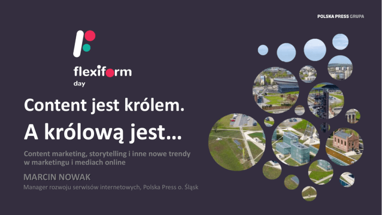 Content jest królem. A królową jest… Content marketing, storytelling i inne nowe trendy w marketingu i mediach online MARCIN NOWAK Manager rozwoju serwisów internetowych, Polska Press o. Śląsk CO TO JEST CONTENT MARKETING? 2 Strategia budowy sieci połączonych ze sobą treści, związanych z marką, produktem, usługą czy wręcz… branżą Ekosystem | Pajęczyna | Przegrupowanie wojska | Scenariusz sztuki | Kampania wojenna | Dwór królewski Z CZEGO SIĘ SKŁADA I GDZIE FUNKCJONUJE CM? Treści pisane Treści graficzne SM UU @ PV Treści audio Treści wideo Treści wizualne 3 Eventy Produkty i aplikacje Gdzie łączymy formy? Reportaż interaktywny | storytelling | grywalizacja | social media | blogosfera, # POMYSŁ I DYSTRYBUCJA TREŚCI. ZASADA PARETO Koncept Zasięg Koncept Zasięg Zły koncept - nieudana dystrybucja Zły koncept - udana dystrybucja (np. $$$) Dobry koncept - nieudana dystrybucja Dobry Koncept - udana dystrybucja Jak badać efektywność? Badania wizerunkowe | dotarcie, zasięg treści | aktywacje (konkurs, newsletter, zakup produktu po trackingu) | Jakość odbiorcy (Czas przebywania na stronie, Liczba przejść CTR) 4 JAK PRACUJĄ TREŚCI W CZASIE I PORZE? 8 Pn 15 21 sb Dopasuj treść do odbiorcy Dopasuj rodzaj treści do odbiorcy Dopasuj czas do zachowania odbiorcy Dopasuj kanał dystrybucji do odbiorcy 5 54% firm w 2016 przeznaczyło na CM więcej niż 1000 pln / mc 50% firm w 2016 zaplanowało większy budżet na CM Jak sprostać takiemu wyzwaniu? Skuteczna strategia budowy ruchu i zasięgów na treściach to dywersyfikacja i multikanałowość CM w Polsce 2016 – raport WhitePress JAK PRACUJĄ TREŚCI W PRZESTRZENI ONLINE? 6 Np. zbliżające się wydarzenie ruch narastający ruch opadający + długi ogon Np. news, buzz Np. poradnik, usługa stała Np. przepis, usługa sezonowa ruch stały ruch sezonowy JAK ZMIENIA SIĘ ZACHOWANIE I JEZYK ODBIORCÓW?7 Krótszy czas uwagi Uproszczenie języka Nie używaj metafor, zwrotów branżowych oraz specjalistycznych tytułów czy nagłówków. Wczuj się w odbiorcę Precyzyjność wyborów płaszcze jesienne granatowe, męskie płaszcze jesienne Zasada dwóch odpowiedzi Kto? Co? | Co? Kiedy? | Co? Dla Kogo? 255 tys. Zasięg / 88 tys. odtworzeń Najwięcej decyzji: Pomiędzy 3 a 9 sekundą (wśród swiadomie odtwarzających) Mianownikowanie języka Borelioza objawy leczenie Intrygowanie zajawką, stymulowanie decyzji Nie sprzedawaj za dużo w nagłówkach płaszcze NAJCZĘSTSZE BŁĘDY MARKETERÓW W KONTEKŚCIE CM Hermetyczny język Brak warstwy wizualnej Temat nie jest „proczytelniczy” Brak wiedzy SEO Niedopasowanie kanału do odbiorcy Złe lub brak badania efektów 8 BARDZO DOBRE PRZYKŁADY CONTENT MARKETINGU Lidl - Kuchnia Lidla HOTEL NA JURZE - Przewodnik dla par Przewodnik dla rodzin Artykuł w prasie branżowej Product placement SEO na precyzyjną frazę Wizyta infulencera Sponsoring konkursu Ebook po konwersji w bazie Legendy Polskie Allegro DEWELOPER - Fotogaleria zdjęć z drona Paczka wizualizacji osiedla Wirtualny spacer po mieszkaniu Ranking Top10 inwestycji Raport dobrych miejsc do życia Wypowiedzi eksperckie Film poklatkowy z budowy Kanał na YT z ciekawostkami DIY Lasy Państwowe CENTRUM HANDLOWE - Newsletter z promocjami dnia Aplikacja „push up” Cykl filmów ze środka obiektu Raport o wyprzedażach Mecenat cyklu o historii okolicy Blog firmowy Plebiscyt na nową markę w galerii 9 WZNOSZĄCE TRENDY MARKETINGOWE, TOWARZYSZĄCE CM WIDEO MARKETING REAL-TIME, LIVE MARKETING INFLUENCER MARKETING STORYTELLING 10 TRENDY W MEDIACH, POMAGAJĄCE DOBREMU CM PERSONALIZACJA GEOLOKALIZACJA BIGDATA WIDEOSTORY/WIDEONEWS 11 GOTOWY PRZEPIS NA STRATEGIĘ CONTENTOWĄ 10% 70% 30% Treści w dystrybucji zewnętrznej Treści w dystrybucji wewnętrznej Działania wizerunkowe i PR Poradniki, raporty, media, SEO, materiały graficzne, wideo, konkursy, product plecement, obce SM, artykuły spons. E-mail marketing, aplikacje, własne kanały social media, blog firmowy, grywalizacja, Materiały prasowe, patronaty, mecenaty, partnerstwa strategiczne, brand story, storytelling 12 WRÓĆ DO SWOJEGO ZESPOŁU I ZAPLANUJ STRATEGIĘ CM NA 2017 RODZAJ - POMYSŁ - DOBÓR KANAŁÓW - BUDŻET - PRODUKCJA - DYSTRYBUCJA - ANALIZA Potencjał mediów POLSKA PRESS GRUPY: Ponad 27 mln unikalnych użytkowników Ponad 400 mln odsłon Ponad 3,6 mln czytelników Ponad 2,8 mln fanów facebook 13 CONTENT JEST KRÓLEM. TO W TAKIM RAZIE KTO JEST KRÓLOWĄ? Wikimedia Commons / cc by 3.0 Flickr.com / cc by 3.0 Strategia czy Dystrybucja? Dziękuję za uwagę fb.com/marcin.nowak25 TT @marcinnowak_eu [email protected]
