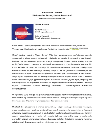 Streszczenie i Wnioski World Nuclear Industry Status Report 2014 www.WorldNuclearReport.org Główni autorzy: Mycle Schneider Email: [email protected] Antony Froggatt Email: [email protected] Pełna wersja raportu po angielsku na stronie http://www.worldnuclearreport.org/-2014-.html Tłumaczenie: Rafał Jantarski na zlecenie Fundacji im. Heinricha Bölla World Nuclear Industry Status Report 2014 jest kompleksowym omówieniem danych związanych z elektrowniami jądrowymi i obejmuje informacje dotyczące ich eksploatacji, budowy oraz produkowanej przez nie energii elektrycznej. Raport zawiera analizę nowych projektów jądrowych, zarówno w państwach dysponujących obecnie energią jądrową, jak i tych, które jej jak dotąd nie posiadają. W dwudziestostronicowym rozdziale, poświęconym ekonomicznemu aspektowi energii jądrowej, skupiono się na gwałtownie zmieniających się warunkach rynkowych dla projektów jądrowych, zarówno tych pozostających w eksploatacji, znajdujących się w budowie, jak i będących dopiero na etapie planowania. Raport zawiera także analizę strategii przyjmowanych przez dostawców technologii jądrowych, skupiając się w szczególności na przykładzie kontraktu dla angielskiej elektrowni Hinkley Point C. Autorzy raportu przedstawili również kondycję finansową najważniejszych koncernów energetycznych. W raporcie z 2013 roku po raz pierwszy zawarto rozdział poświęcony sytuacji w Fukuszimie, który spotkał się z szerokim zainteresowaniem mediów i analityków. W tegorocznym raporcie informacje przedstawione w tym rozdziale zostały zaktualizowane. Rozdział „Energia jądrowa a energia odnawialna”, będący analizą porównawczą inwestycji, mocy zainstalowanej i poziomu produkcji tych źródeł energii, został uzupełniony o fragment dotyczący zagadnień związanych z całokształtem systemu elektroenergetycznego. Autorzy raportu odpowiadają na pytanie, jak energia jądrowa daje sobie radę w systemach o wysokim udziale energii odnawialnej, a także czy jesteśmy świadkami zmierzchu myślenia w kategoriach dostawy pasmowej czy obciążenia szczytowego. Wreszcie, liczący 45 stron Aneks nr 1 stanowi przegląd wszystkich 31 krajów dysponujących energią jądrową, ze szczególnym uwzględnieniem Chin, Japonii i Stanów Zjednoczonych. Eksploatacja i budowa elektrowni jądrowych (stan na 1 lipca 2014 roku)1 Eksploatacja. W chwili obecnej elektrownie jądrowe posiada 31 państw na świecie2. Całkowita liczba reaktorów wynosi 388 jednostek o łącznej mocy zainstalowanej 333 GW 3. Tylko dwie japońskie jednostki (Ohi-3 i Ohi-4) produkowały energię elektryczną w 2013 roku. Autorzy raportu sklasyfikowali 43 japońskie reaktory4 jako pozostające w stanie „długoterminowego odłączenia od sieci” (Long-Term Outage - LTO)5. Oprócz reaktorów japońskich, do kategorii LTO zaliczono także jeden reaktor indyjski i jeden południowokoreański. Dziesięć reaktorów w elektrowniach Fukushima Daiichi i Daini uważa się za nieodwołanie zamknięte, stąd nie zostały one wliczone do ogólnej liczby elektrowni jądrowych pozostających w eksploatacji. W chwili pisania niniejszego raportu (w połowie lipca 2014 roku) wydaje się prawdopodobne, że dwa japońskie reaktory (Sendai-1 i Sendai-2 w prefekturze Kiusiu) wznowią pracę jeszcze przed końcem roku. Przemysł jądrowy przeżywa dziś kryzys: na świecie pracuje obecnie 388 reaktorów, czyli o 50 jednostek mniej niż w szczytowym okresie, który przypadł na rok 2002. Pod względem łącznej mocy zainstalowanej reaktorów szczyt osiągnięty został w 2010 roku i wyniósł 367 GW. Od tego czasu moc zainstalowana reaktorów spada i obecnie sytuuje się na poziomie sprzed dwudziestu lat. Roczna produkcja energii elektrycznej reaktorów najwyższa była w 2006 roku i wyniosła 2.660 TWh. W 2013 roku reaktory wyprodukowały 2.359 TWh, 1 Patrz Aneks nr 7, stanowiący przegląd reaktorów pozostających w eksploatacji lub w budowie w rozbiciu na poszczególne kraje, a także udział energii jądrowej tych krajów w produkcji zarówno energii elektrycznej, jak i energii pierwotnej. 2 Jeśli nie wskazano inaczej, dane te odzwierciedlają stan na 1 lipca 2014 roku. 3 Wszystkie liczby podane są dla nominalnej mocy zainstalowanej netto. Skrót „GW” oznacza gigawat lub tysiąc megawatów. 4 W tym reaktor Monju, wyłączony od 1995 roku, w bazie danych IAEA-PRIS figurujący w rubryce „długoterminowe wyłączenie”. 5 Autorzy raportu przyjęli założenie, że jednostce przyznawany jest status LTO, gdy w poprzednim roku kalendarzowym oraz pierwszej połowie roku obecnego nie wyprodukowała ona żadnej ilości energii elektrycznej. Okres, w którym jednostce przyznany jest status LTO, liczony jest od dnia odłączenia jej od sieci. Autorzy raportu przyjmują, że rozruch reaktora następuje w dniu przyłączenia do sieci, a jego zamknięcie w dniu odłączenia od sieci. Kategoria LTO pojawia się w raporcie po raz pierwszy i stanowi alternatywną propozycję wobec statystyk pochodzących z innych źródeł, które w coraz większym stopniu zniekształcają rzeczywisty obraz światowego przemysłu jądrowego. Oprócz reaktorów japońskich, kryteria LTO spełnia jeden reaktor indyjski i jeden południowokoreański. co należy postrzegać jako ustabilizowanie poziomu produkcji (+ 0,6 procent) po dwóch kolejnych latach znaczących spadków (-4 procent w 2011 roku, -7 procent w 2012 roku). Odpowiada to poziomowi produkcji odnotowanemu w 1999 roku. Udział energii jądrowej w globalnej produkcji energii elektrycznej stopniowo maleje. Od szczytu, wynoszącego 17,6 procent i przypadającego na rok 1996, spadł on do 10,8 procent w roku 20136. Z kolei udział energii jądrowej w komercyjnej produkcji energii pierwotnej spadł z 4,5 procent w 2012 roku (poziomu po raz ostatni odnotowanego w 1984 roku7) do rekordowo niskich 4,4 procent8. W 2013 roku, podobnie jak w roku poprzednim, 68 procent energ