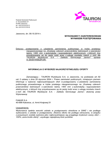 Wydział Zamówień Publicznych ul. Grunwaldzka 37 43-600 Jaworzno tel. +48 32 618 50 31 fax.+48 32 615 59 42 Jaworzno, dn. 09.10.2014 r. WYKONAWCY ZAINTERESOWANI WYNIKIEM POSTĘPOWANIA Dotyczy: postępowania o udzielenie zamówienia publicznego w trybie przetargu nieograniczonego na „Dostawę czterech przenośników taśmowych o szerokości taśmy 1400 mm z automatyką i wyposażeniem elektrycznym, z których trzy przystosowane są do jazdy ludzi wraz z usługą montażu trzech z nich dla TAURON Wydobycie S.A. - Zakładu Górniczego Janina”- sprawa nr 20/2014/EEZP/JW. INFORMACJA O WYBORZE NAJKORZYSTNIEJSZEJ OFERTY Zamawiający - TAURON Wydobycie S.A. w Jaworznie, na podstawie art. 92 ust. 2 ustawy z dnia 29 stycznia 2004 r. Prawo zamówień publicznych, niniejszym pismem informuje o wyborze najkorzystniejszych ofert w postępowaniu o udzielenie zamówienia publicznego prowadzonego w trybie przetargu nieograniczonego na „Dostawę czterech przenośników taśmowych o szerokości taśmy 1400 mm z automatyką i wyposażeniem elektrycznym, z których trzy przystosowane są do jazdy ludzi wraz z usługą montażu trzech z nich dla TAURON Wydobycie S.A. - Zakładu Górniczego Janina”, złożonej przez Wykonawcę: FAMUR S.A. 40-698 Katowice, ul. Armii Krajowej 51 Uzasadnienie: Wykonawca spełnia warunki udziału w postępowaniu określone w SIWZ i nie podlega wykluczeniu z udziału w postępowaniu. Złożona oferta nie podlega odrzuceniu, w związku z powyższym została wybrana jako najkorzystniejsza wg przyjętego kryterium oceny ofert – 100% „cena brutto oferty”, uzyskując największą ilość punktów. STRESZCZENIE OCENY I PORÓWNANIA ZŁOŻONYCH OFERT Firma (nazwa) lub nazwisko oraz adres wykonawcy Numer oferty Liczba punktów w kryterium: „cena brutto” (waga – 100%) Konsorcjum firm: 1. Lider konsorcjum: Alta Partner konsorcjum: a.s., 602 00 Brno, ul. Stefanikowa 110/41 99,77 Maxtor Karliński Sp. jawna, 97-300 Piotrków Trybunalski, ul. Wiślana 1i 2. FAMUR S.A., 40-698 Katowice, ul. Armii Krajowej 51 100 3. KOPEX Machinery S.A., 41-800 Zabrze, ul. 3-go Maja 89 92,10 4. MIFAMA Sp. z o. o., 43-190 Mikołów, ul. Żwirki i Wigury 4 Oferta odrzucona 5. MMC Poland Sp. z o. o., 40-172 Katowice, ul. Grabowa 2 Wykluczony 6. PATENTUS S.A., 43-200 Pszczyna, ul. Górnośląska 11 90,06 7. LINTER S.A., 32-340 Wolbrom, ul. Piłsudskiego 57a 93,06 Zamawiający informuje, że na podstawie art. 94 ust. 1 pkt 1 ustawy Prawo zamówień publicznych może zawrzeć umowę w terminie nie krótszym niż 10 dni od dnia przesłania zawiadomienia o wyborze najkorzystniejszej oferty.