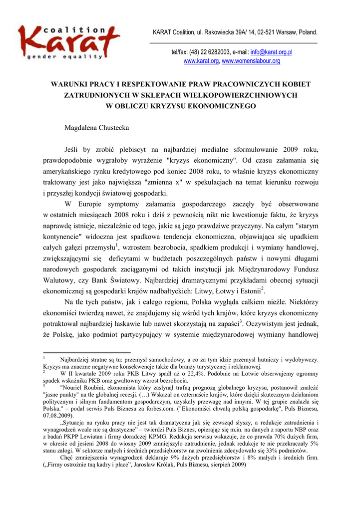 KARAT Coalition, ul. Rakowiecka 39A/ 14, 02-521 Warsaw, Poland. tel/fax: (48) 22 6282003, e-mail: [email protected] www.karat.org, www.womenslabour.org WARUNKI PRACY I RESPEKTOWANIE PRAW PRACOWNICZYCH KOBIET ZATRUDNIONYCH W SKLEPACH WIELKOPOWIERZCHNIOWYCH W OBLICZU KRYZYSU EKONOMICZNEGO Magdalena Chustecka Jeśli by zrobić plebiscyt na najbardziej medialne sformułowanie 2009 roku, prawdopodobnie wygrałoby wyrażenie "kryzys ekonomiczny". Od czasu załamania się amerykańskiego rynku kredytowego pod koniec 2008 roku, to właśnie kryzys ekonomiczny traktowany jest jako największa "zmienna x" w spekulacjach na temat kierunku rozwoju i przyszłej kondycji światowej gospodarki. W Europie symptomy załamania gospodarczego zaczęły być obserwowane w ostatnich miesiącach 2008 roku i dziś z pewnością nikt nie kwestionuje faktu, że kryzys naprawdę istnieje, niezależnie od tego, jakie są jego prawdziwe przyczyny. Na całym "starym kontynencie" widoczna jest spadkowa tendencja ekonomiczna, objawiająca się upadkiem całych gałęzi przemysłu1, wzrostem bezrobocia, spadkiem produkcji i wymiany handlowej, zwiększającymi się deficytami w budżetach poszczególnych państw i nowymi długami narodowych gospodarek zaciąganymi od takich instytucji jak Międzynarodowy Fundusz Walutowy, czy Bank Światowy. Najbardziej dramatycznymi przykładami obecnej sytuacji ekonomicznej są gospodarki krajów nadbałtyckich: Litwy, Łotwy i Estonii2. Na tle tych państw, jak i całego regionu, Polska wygląda całkiem nieźle. Niektórzy ekonomiści twierdzą nawet, że znajdujemy się wśród tych krajów, które kryzys ekonomiczny potraktował najbardziej łaskawie lub nawet skorzystają na zapaści3. Oczywistym jest jednak, że Polskę, jako podmiot partycypujący w systemie międzynarodowej wymiany handlowej 1 Najbardziej stratne są tu: przemysł samochodowy, a co za tym idzie przemysł hutniczy i wydobywczy. Kryzys ma znaczne negatywne konsekwencje także dla branży turystycznej i reklamowej. 2 W II kwartale 2009 roku PKB Litwy spadł aż o 22,4%. Podobnie na Łotwie obserwujemy ogromny spadek wskaźnika PKB oraz gwałtowny wzrost bezrobocia. 3 "Nouriel Roubini, ekonomista który zasłynął trafną prognozą globalnego kryzysu, postanowił znaleźć "jasne punkty" na tle globalnej recesji. (…) Wskazał on czternaście krajów, które dzięki skutecznym działaniom politycznym i silnym fundamentom gospodarczym, uzyskały przewagę nad innymi. W tej grupie znalazła się Polska." – podał serwis Puls Biznesu za forbes.com. ("Ekonomiści chwalą polską gospodarkę", Puls Biznesu, 07.08.2009). „Sytuacja na rynku pracy nie jest tak dramatyczna jak się zewsząd słyszy, a redukcje zatrudnienia i wynagrodzeń wcale nie są drastyczne” – twierdzi Puls Biznes, opierając się m.in. na danych z raportu NBP oraz z badań PKPP Lewiatan i firmy doradczej KPMG. Redakcja serwisu wskazuje, że co prawda 70% dużych firm, w okresie od jesieni 2008 do wiosny 2009 zmniejszyło zatrudnienie, jednak redukcje te nie przekraczały 5% stanu załogi. W sektorze małych i średnich przedsiębiorstw na zwolnienia zdecydowało się 33% podmiotów. Chęć zmniejszenia wynagrodzeń deklaruje 9% dużych przedsiębiorstw i 8% małych i średnich firm. („Firmy ostrożnie tną kadry i płace”, Jarosław Królak, Puls Biznesu, sierpień 2009) i finansowej, konsekwencje kryzysu nie omijają. Jednoznacznie wskazują na to różne prognozy dotyczące wartości PKB w 2009 roku. Wahają się one między wersją optymistyczną – 0,5%, a najbardziej pesymistyczną – minus 1,5%4. Będzie to najgorszy wynik od czasów zapaści ekonomicznej w latach 1990 – 1991 (oficjalnie minus 11,6% w 1990 r. i minus 7% w 1991 r.). Informacje o rozmiarach kryzysu i jego obserwowanych i przewidywanych skutkach nie są jednoznaczne. W codziennych przekazach medialnych pojawia się wiele, często sprzecznych, analiz i wypowiedzi różnych ekspertów na temat spowolnienia ekonomicznego. Osobie, która nie jest znawcą tematu, trudno stwierdzić, które z przewidywań oparte są na rzetelnej, ekonomicznej wiedzy, które zaś są przejawem "globalnej paniki". Sytuację komplikuje fakt, że w obecnej chwili niemalże każda zmiana warunków pracy na niekorzyść pracownika uzasadniana jest przez pracodawcę ową "niewidzialną ręką rynku". Czy rzeczywiście jest tak, że ogólnoświatowy kryzys ekonomiczny "po równo" karze wszystkich? A może istnieją jakieś konkretne gałęzie i branże gospodarki bardziej narażone na negatywne oddziaływanie kryzysu, podczas gdy inne egzystują bez większych wahań? Jak to wygląda w branży, która leży w centralnym punkcie naszych rozważań – detalicznym handlu spożywczym?5 Niniejszy tekst będzie próbą odpowiedzi na te kluczowe pytania. W pierwszej części przyjrzę się, czy globalny kryzys ekonomiczny wpływa na sytuację wielkich sieci handlowych i, jeśli tak, w jakim stopniu i w jakich obszarach jest widoczny. W drugiej części artykułu przeanalizuję aktualne źródła dotyczące warunków pracy i przestrzegania praw pracowniczych w sklepach wielkopowierzchniowych. Wskażę także na te istotne zmiany w prawie pracy, które mogą mieć wpływ na sytuację pracowników omawianej branży. Na końcu artykułu, w głównych wnioskach, zawrę przewidywania, w jaki sposób przyjmowane przez zarządy sklepów wielkopowierzchniowych strategie antykryzysowe mogą wpłynąć na obniżenie standardów przestrzegania praw pracowniczych. Detaliczny handel spożywczy w czasach kryzysu "Pomimo spowolnienia gospodarczego, spożywczy rynek detaliczny w Polsce będzie rozwijać się w tempie blisko 6 % w latach 2009 – 2011" – takie wnioski płyną z raportu firmy PMR "Handel detaliczny artykułami spożywczymi w Polsce 2008"6. Z kolei, według najnowszej prognozy Euromonitor International, dynamika wzrostu tej branży będzie 4 Latem 2009 roku rząd przyjął następujące prognozy warto