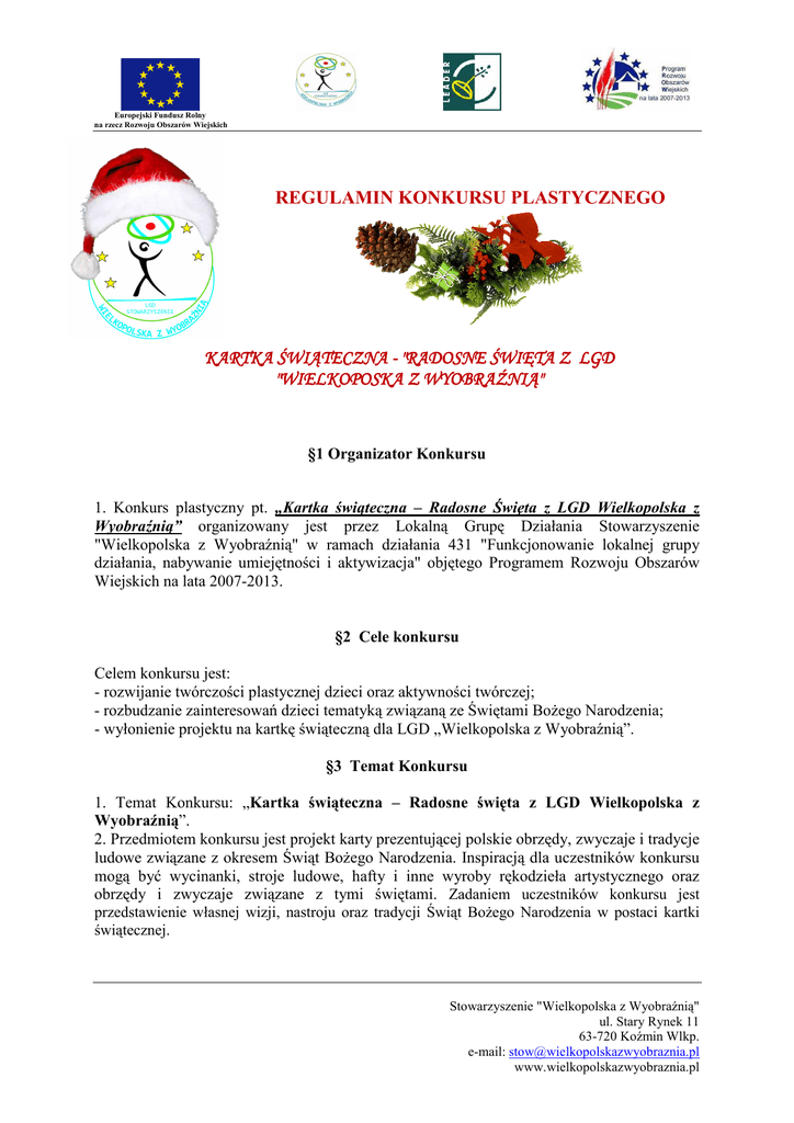 Europejski Fundusz Rolny na rzecz Rozwoju Obszarów Wiejskich REGULAMIN KONKURSU PLASTYCZNEGO KARTKA ŚWIĄTECZNA - "RADOSNE ŚWIĘTA Z LGD "WIELKOPOSKA Z WYOBRAŹNIĄ" §1 Organizator Konkursu 1. Konkurs plastyczny pt. „Kartka świąteczna – Radosne Święta z LGD Wielkopolska z Wyobraźnią” organizowany jest przez Lokalną Grupę Działania Stowarzyszenie "Wielkopolska z Wyobraźnią" w ramach działania 431 "Funkcjonowanie lokalnej grupy działania, nabywanie umiejętności i aktywizacja" objętego Programem Rozwoju Obszarów Wiejskich na lata 2007-2013. §2 Cele konkursu Celem konkursu jest: - rozwijanie twórczości plastycznej dzieci oraz aktywności twórczej; - rozbudzanie zainteresowań dzieci tematyką związaną ze Świętami BoŜego Narodzenia; - wyłonienie projektu na kartkę świąteczną dla LGD „Wielkopolska z Wyobraźnią”. §3 Temat Konkursu 1. Temat Konkursu: „Kartka świąteczna – Radosne święta z LGD Wielkopolska z Wyobraźnią”. 2. Przedmiotem konkursu jest projekt karty prezentującej polskie obrzędy, zwyczaje i tradycje ludowe związane z okresem Świąt BoŜego Narodzenia. Inspiracją dla uczestników konkursu mogą być wycinanki, stroje ludowe, hafty i inne wyroby rękodzieła artystycznego oraz obrzędy i zwyczaje związane z tymi świętami. Zadaniem uczestników konkursu jest przedstawienie własnej wizji, nastroju oraz tradycji Świąt BoŜego Narodzenia w postaci kartki świątecznej. Stowarzyszenie "Wielkopolska z Wyobraźnią" ul. Stary Rynek 11 63-720 Koźmin Wlkp. e-mail: [email protected] www.wielkopolskazwyobraznia.pl Europejski Fundusz Rolny na rzecz Rozwoju Obszarów Wiejskich §4 Uczestnicy Konkursu 1. Konkurs adresowany jest do uczniów szkół podstawowych z terenu Lokalnej Grupy Działania (LGD) Stowarzyszenie "Wielkopolska z Wyobraźnią" obejmującej gminy: Borek Wlkp., Koźmin Wlkp., Pogorzela i RozdraŜew oraz uczniów szkół podstawowych zamieszkałych na terenie LGD, a uczących się poza terenem LGD. 2. Do Konkursu przystępuje dowolna liczba uczniów z danej klasy i szkoły. 3. Osoby niepełnoletnie mogą wziąć udział w konkursie za zgodą rodziców lub opiekunów prawnych. §5 Warunki uczestnictwa w konkursie 1. Udział w konkursie jest bezpłatny. 2. Przystąpienie do Konkursu następuje poprzez zgłoszenie za pomocą formularza zgłoszeniowego stanowiącego załącznik do niniejszego Regulaminu. 3. Uczestnicy wykonują prace plastyczne indywidualnie, techniką dowolną (prócz komputerowej), format pracy – maksymalnie A4. 4. KaŜdy uczestnik moŜe zgłosić do Konkursu maksymalnie 3 prace. 5. Na odwrocie pracy naleŜy wpisać: imię i nazwisko autora oraz wiek/klasę i pełną nazwę placówki, do której uczęszcza autor, imię i nazwisko opiekuna. 6. KaŜda kartka ma zawierać logo LGD Stowarzyszenia „Wielkopolska z Wyobraźnią”, gdyŜ zwycięska praca będzie wykorzystana jako kartka świąteczna LGD. 7. Prace (wraz z dołączonym formularzem zgłoszeniowym) naleŜy złoŜyć osobiście lub przesyłać w terminie do 6 grudnia 2012 r. na adres: Stowarzyszenie „Wielkopolska z Wyobraźnią” Ul. Stary Rynek 11 63-720 Koźmin Wielkopolski Z dopiskiem: „Kartka świąteczna – Radosne Święta z LGD Wielkopolska z Wyobraźnią” 8. Uczestnik, zgłaszając się do konkursu oświadcza, iŜ przysługują mu wyłączne i nieograniczone prawa autorskie do nadesłanych prac. Ponadto oświadcza, Ŝe wyraŜa zgodę na wielokrotne, nieodpłatne publikowanie nagrodzonej kartki oraz opublikowanie jego imienia, nazwiska oraz miejscowości zamieszkania w materiałach promocyjnych związanych z konkursem, w wydawnictwach oraz na stronach internetowych LGD oraz Gmin Stowarzyszenie "Wielkopolska z Wyobraźnią" ul. Stary Rynek 11 63-720 Koźmin Wlkp. e-mail: [email protected] www.wielkopolskazwyobraznia.pl Europejski Fundusz Rolny na rzecz Rozwoju Obszarów Wiejskich wchodzących w skład LGD, a takŜe na ich wykorzystywanie w celach promocyjnych i marketingowych. Ponadto wyraŜa zgodę na druk zwycięskiej kartki jako kartki świątecznej Stowarzyszenia na rok 2012. 9. Uczestnicy wyraŜają zgodę na przetwarzanie swoich danych osobowych zgodnie z ustawą o ochronie danych osobowych (Dz. U. z 2002 r. Nr 101 pozycja 926 j.t ) w zakresie niezbędnym do realizacji konkursu. 10. Prace plastyczne przechodzą na własność Organizatora i nie będą odsyłane. 11. Nadesłanie prac jest jednoznaczne z akceptacją niniejszego Regulaminu. 12. Organizator konkursu ma prawo odrzucić prace niezgodne z Regulaminem. 13. Organizator konkursu nie bierze odpowiedzialności za uszkodzenie lub zaginięcie prac w trakcie przesyłki. §6 Komisja Konkursowa 1. O wyłonieniu zwycięzców Konkursu decyduje Komisja Konkursowa powołana przez Organizatora, zwana dalej „Komisją”. 2. Komisja zobowiązana jest do zachowania bezstronności podczas oceny poszczególnych prac. 3. Konkurs jest jednoetapowy. 4. Zakończenie Konkursu i przyznanie nagród odbędzie się podczas imprezy promocyjnej „Spotkanie z tradycją na Wielkopolską Nutę – Cztery Świece Adwentu” – termin imprezy: 16 grudnia 2012 – Rynek w Borku Wielkopolskim. 5. Decyzje Komisji Konkursowej są ostateczne i nie przysługuje od nich odwołanie. §7 Nagrody 1. Spośród zgłoszonych do Konkursu prac Komisja wybierze jedną pracę zwycięską. Ponadto komisji przysługuje prawo do nadania wyróŜnień. 2. Autorzy wyróŜnionych prac otrzymają nagrody rzeczowe. 3. Kryterium wyróŜnienia prac konkursowych będzie oryginalność i odzwierciedlenie tematu Konkursu. 4. Komisja moŜe wyróŜnić równieŜ inne – szczególnie ciekawe – indywidualne prace wyłonione w Konkursie. 6. Nagrody zostaną wręczone laureatom podczas imprezy promocyjnej „Spotkanie z tradycją na Wielkopolską Nutę – Cztery Świece Adwentu” – termin imprezy: 16 grudnia 2012 – Rynek w Borku Wielkopolskim. 7. W przypadku nieobecności podczas wręczania wyróŜnień, nagrody do odeb