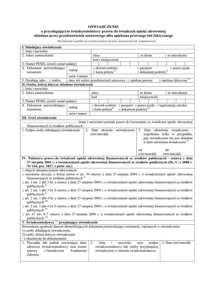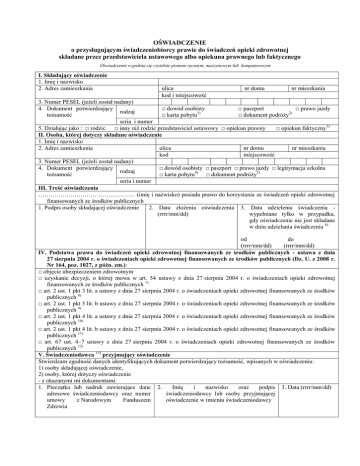 OŚWIADCZENIE o przysługującym świadczeniobiorcy prawie do świadczeń opieki zdrowotnej składane przez przedstawiciela ustawowego albo opiekuna prawnego lub faktycznego Oświadczenie wypełnia się czytelnie pismem ręcznym, maszynowym lub komputerowym I. Składający oświadczenie 1. Imię i nazwisko 2. Adres zamieszkania ulica kod i miejscowość nr domu nr mieszkania 3. Numer PESEL (jeżeli został nadany) 4. Dokument potwierdzający □ dowód osobisty □ paszport □ prawo jazdy rodzaj tożsamość □ karta pobytu1) □ dokument podróży2) seria i numer 5. Działając jako : □ rodzic □ inny niż rodzic przedstawiciel ustawowy □ opiekun prawny □ opiekun faktyczny 3) II. Osoba, której dotyczy składane oświadczenie 1. Imię i nazwisko 2. Adres zamieszkania ulica nr domu nr mieszkania kod miejscowość 3. Numer PESEL (jeżeli został nadany) 4. Dokument potwierdzający □ dowód osobisty □ paszport □ prawo jazdy □ legitymacja szkolna rodzaj tożsamość □ karta pobytu4) □ dokument podróży5) seria i numer III. Treść oświadczenia ………………………………………… (imię i nazwisko) posiada prawo do korzystania ze świadczeń opieki zdrowotnej finansowanych ze środków publicznych 1. Podpis osoby składającej oświadczenie 2. Data złożenia oświadczenia 3. Data udzielenia świadczenia (rrrr/mm/dd) wypełniane tylko w przypadku, gdy oświadczenie nie jest składane w dniu udzielania świadczenia 6) od do (rrrr/mm/dd) (rrrr/mm/dd) IV. Podstawa prawa do świadczeń opieki zdrowotnej finansowanych ze środków publicznych - ustawa z dnia 27 sierpnia 2004 r. o świadczeniach opieki zdrowotnej finansowanych ze środków publicznych (Dz. U. z 2008 r. Nr 164, poz. 1027, z późn. zm.): □ objęcie ubezpieczeniem zdrowotnym □ uzyskanie decyzji, o której mowa w art. 54 ustawy z dnia 27 sierpnia 2004 r. o świadczeniach opieki zdrowotnej finansowanych ze środków publicznych 7) □ art. 2 ust. 1 pkt 3 lit. a ustawy z dnia 27 sierpnia 2004 r. o świadczeniach opieki zdrowotnej finansowanych ze środków publicznych 8) □ art. 2 ust. 1 pkt 3 lit. b ustawy z dnia 27 sierpnia 2004 r. o świadczeniach opieki zdrowotnej finansowanych ze środków publicznych 9) □ art. 2 ust. 1 pkt 4 lit. a ustawy z dnia 27 sierpnia 2004 r. o świadczeniach opieki zdrowotnej finansowanych ze środków publicznych 10) □ art. 2 ust. 1 pkt 4 lit. b ustawy z dnia 27 sierpnia 2004 r. o świadczeniach opieki zdrowotnej finansowanych ze środków publicznych 11) □ art. 67 ust. 4–7 ustawy z dnia 27 sierpnia 2004 r. o świadczeniach opieki zdrowotnej finansowanych ze środków publicznych 12) V. Świadczeniodawca 13) przyjmujący oświadczenie Stwierdzam zgodność danych identyfikujących dokument potwierdzający tożsamość, wpisanych w oświadczeniu: 1) osoby składającej oświadczenie, 2) osoby, której dotyczy oświadczenie - z okazanymi mi dokumentami. 1. Pieczątka lub nadruk zawierające dane 2. Imię i nazwisko oraz podpis 3. Data (rrrr/mm/dd) adresowe świadczeniodawcy oraz numer świadczeniodawcy lub osoby przyjmującej umowy z Narodowym Funduszem oświadczenie w imieniu świadczeniodawcy Zdrowia OBJAŚNIENIA Karta pobytu, o której mowa w ustawie z dnia 12 grudnia 2013 r. o cudzoziemcach (Dz. U. poz. 1650, z późn. zm.) - w przypadku osoby, która uzyskała w Rzeczypospolitej Polskiej status uchodźcy lub ochronę uzupełniającą lub zezwolenie na pobyt czasowy udzielone w związku z okolicznością, o której mowa w art. 159 ust. 1 pkt 1 lit. c lub d ustawy z dnia 12 grudnia 2013 r. o cudzoziemcach, posiadającej miejsce zamieszkania na terytorium Rzeczypospolitej Polskiej. 2) Dokument podróży, o którym mowa w ustawie z dnia 12 grudnia 2013 r. o cudzoziemcach w przypadku osoby posiadającej miejsce zamieszkania na terytorium Rzeczypospolitej Polskiej, która uzyskała zezwolenie na pobyt czasowy udzielone w związku z okolicznością, o której mowa w art. 159 ust. 1 pkt 1 lit. c lub d ustawy z dnia 12 grudnia 2013 r. o cudzoziemcach, albo dokument podróży przewidziany w Konwencji Genewskiej, o którym mowa w ustawie z dnia 13 czerwca 2003 r. o udzielaniu cudzoziemcom ochrony na terytorium Rzeczypospolitej Polskiej (Dz. U. z 2012 r. poz. 680, z późn. zm.) - w przypadku osoby posiadającej miejsce zamieszkania na terytorium Rzeczypospolitej Polskiej, która uzyskała w Rzeczypospolitej Polskiej status uchodźcy. 3) Opiekunem faktycznym jest każda osoba sprawująca, bez obowiązku ustawowego, stałą opiekę nad pacjentem, który ze względu na wiek, stan zdrowia albo stan psychiczny opieki takiej wymaga. 4) patrz przypis nr 1. 5) patrz przypis nr 2. 6) Zgodnie z art. 50 ust. 11 i 12 ustawy z dnia 27 sierpnia 2004 r. o świadczeniach opieki zdrowotnej finansowanych ze środków publicznych w stanach nagłych lub w przypadku, gdy ze względu na stan zdrowia nie jest możliwe złożenie oświadczenia, oświadczenie może zostać złożone w terminie późniejszym. 7) Dotyczy decyzji wójta (burmistrza, prezydenta) potwierdzającej prawo danej osoby do świadczeń opieki zdrowotnej. 8) Dotyczy osoby, która posiada obywatelstwo polskie i nie ukończyła 18. roku życia. Należy zaznaczyć tylko w przypadku, gdy osoba nie jest objęta ubezpieczeniem zdrowotnym. 9) Dotyczy osoby, która nie ukończyła 18. roku życia, posiada miejsce zamieszkania na terytorium Rzeczypospolitej Polskiej i uzyskała w Rzeczypospolitej Polskiej status uchodźcy lub ochronę uzupełniającą, lub zezwolenie na pobyt czasowy udzielone w związku z okolicznością, o której mowa w art. 159 ust. 1 pkt 1 lit. c lub d ustawy z dnia 12 grudnia 2013 r. o cudzoziemcach. Należy zaznaczyć tylko w przypadku, gdy osoba nie jest objęta ubezpieczeniem zdrowotnym. 10) Dotyczy osoby w okresie ciąży, porodu lub połogu oraz posiadającej obywatelstwo polskie i miejsce zamieszkania na terytorium Rzeczypospolitej Polskiej. Należy zaznaczyć tylko w przypadku gdy osoba nie jest ob