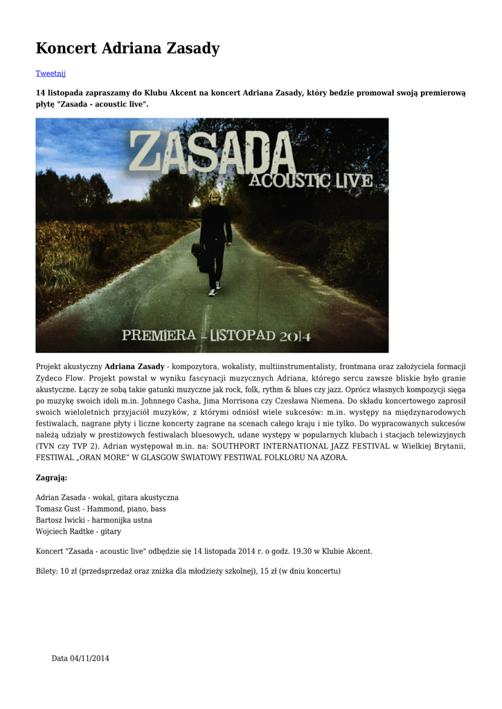 Koncert Adriana Zasady Tweetnij 14 listopada zapraszamy do Klubu Akcent na koncert Adriana Zasady, który bedzie promował swoją premierową płytę "Zasada - acoustic live". Projekt akustyczny Adriana Zasady - kompozytora, wokalisty, multiinstrumentalisty, frontmana oraz założyciela formacji Zydeco Flow. Projekt powstał w wyniku fascynacji muzycznych Adriana, którego sercu zawsze bliskie było granie akustyczne. Łączy ze sobą takie gatunki muzyczne jak rock, folk, rythm & blues czy jazz. Oprócz własnych kompozycji sięga po muzykę swoich idoli m.in. Johnnego Casha, Jima Morrisona czy Czesława Niemena. Do składu koncertowego zaprosił swoich wieloletnich przyjaciół muzyków, z którymi odniósł wiele sukcesów: m.in. występy na międzynarodowych festiwalach, nagrane płyty i liczne koncerty zagrane na scenach całego kraju i nie tylko. Do wypracowanych sukcesów należą udziały w prestiżowych festiwalach bluesowych, udane występy w popularnych klubach i stacjach telewizyjnych (TVN czy TVP 2). Adrian występował m.in. na: SOUTHPORT INTERNATIONAL JAZZ FESTIVAL w Wielkiej Brytanii, FESTIWAL „ORAN MORE” W GLASGOW ŚWIATOWY FESTIWAL FOLKLORU NA AZORA. Zagrają: Adrian Zasada - wokal, gitara akustyczna Tomasz Gust - Hammond, piano, bass Bartosz Iwicki - harmonijka ustna Wojciech Radtke - gitary Koncert "Zasada - acoustic live" odbędzie się 14 listopada 2014 r. o godz. 19.30 w Klubie Akcent. Bilety: 10 zł (przedsprzedaż oraz zniżka dla młodzieży szkolnej), 15 zł (w dniu koncertu) Data 04/11/2014