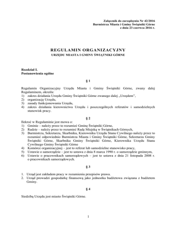 Załącznik do zarządzenia Nr 42/2016 Burmistrza Miasta i Gminy Świątniki Górne z dnia 23 czerwca 2016 r. REGULAMIN ORGANIZACYJNY URZĘDU MIASTA I GMINY ŚWIĄTNIKI GÓRNE Rozdział I. Postanowienia ogólne §1 Regulamin Organizacyjny Urzędu Miasta i Gminy Świątniki Górne, zwany dalej Regulaminem, określa: 1) zakres działania Urzędu Gminy Świątniki Górne zwanego dalej „Urzędem”, 2) organizację Urzędu, 3) zasady funkcjonowania Urzędu, 4) zakres działania kierownictwa Urzędu i poszczególnych referatów i samodzielnych stanowisk pracy. §2 Ilekroć w Regulaminie jest mowa o: 1) Gminie – należy przez to rozumieć Gminę Świątniki Górne, 2) Radzie – należy przez to rozumieć Radę Miejską w Świątnikach Górnych, 3) Burmistrzu, Sekretarzu, Skarbniku, Kierowniku Urzędu Stanu Cywilnego należy przez to rozumieć odpowiednio Burmistrza Miasta i Gminy Świątniki Górne, Sekretarza Gminy Świątniki Górne, Skarbnika Gminy Świątniki Górne, Kierownika Urzędu Stanu Cywilnego Gminy Świątniki Górne 4) Komórce organizacyjnej – jest to referat lub samodzielne stanowisko pracy, 5) Ustawie o samorządzie – jest to ustawa z dnia 8 marca 1990 r. o samorządzie gminnym, 6) Ustawie o pracownikach samorządowych – jest to ustawa z dnia 21 listopada 2008 r. o pracownikach samorządowych. §3 1. Urząd jest zakładem pracy w rozumieniu przepisów prawa. 2. Urząd prowadzi gospodarkę finansową jako jednostka budżetowa związana z budżetem Gminy. §4 Siedzibą Urzędu jest miasto Świątniki Górne. 1 Rozdział II. Zadanie i zakres działania Urzędu §5 1. Urząd realizuje zadania należące do Burmistrza, Rady, Komisji Rady oraz innych organów funkcjonujących w strukturze Gminy. Urząd zapewnia obsługę prawną gminnym jednostkom organizacyjnym, chyba, że statut gminnej jednostki organizacyjnej stanowi inaczej. 2. Obsługę prawną prowadzi na podstawie umowy cywilno-prawnej kancelaria prawna. §6 Do zakresu działania Urzędu należy: 1) Zapewnienie warunków należytego wykonywania zadań spoczywających na Gminie w tym: a) zadań własnych Gminy, b) zadań zleconych Gminie na podstawie ustaw w tym, organizację i przeprowadzenie wyborów powszechnych i referendów, c) zadań powierzonych, wykonywanych na podstawie porozumienia z organami administracji rządowej i samorządowej, d) zadań powierzonych w drodze porozumienia komunalnego, 2) Zapewnienie pomocy organom Gminy w wykonywaniu ich zadań i kompetencji, a w szczególności: a) przygotowanie materiałów niezbędnych do podejmowania uchwał, wydawania decyzji i postanowień i innych aktów z zakresu administracji publicznej oraz podejmowanie innych czynności prawnych przez organy Gminy, b) wykonywanie na podstawie udzielonych upoważnień czynności faktycznych wchodzących w zakres zadań Gminy, 3) Zapewnienie organom Gminy możliwości przyjmowania i rozpatrywania oraz załatwiania skarg i wniosków, 4) Przygotowanie projektów uchwał Rady w tym budżetu Gminy, wykonywanie uchwał Rady, zarządzeń ogólnych, zarządzeń wewnętrznych, pism okólnych, regulaminów i instrukcji Burmistrza oraz ich realizacja, 5) Zapewnienie warunków organizacyjnych dla pracy Rady i jej Komisji, 6) prowadzenie zbiorów przepisów prawa miejscowego i udostępnianie go do wglądu w siedzibie Urzędu, 7) Wykonywanie prac kancelaryjnych zgodnie z obowiązującym w tym zakresie przepisami prawa, a w szczególności: a) przyjmowanie, rozdział, przekazywanie i wysyłanie korespondencji, b) prowadzenie wewnętrznego obiegu akt, c) przechowywanie akt i prowadzenie w tym celu archiwum zakładowego, d) przekazywanie akt do archiwum państwowego. 2 Rozdział III. Organizacja Urzędu §7 W skład Urzędu wchodzą referaty oraz samodzielne stanowiska o następujących oznaczeniach literowych: 1) Burmistrz oznaczenie – BM 2) Zastępca Burmistrza oznaczenie – ZB 3) Sekretarz Gminy oznaczenie – SG 4) Doradca Burmistrza oznaczenie – DB 5) Skarbnik Gminy i Referat Finansowo-Budżetowy oznaczenie – PFN 6) Referat Organizacyjny oznaczenie – ORG w zakresie spraw dot. kontroli zarządczej oznaczenie – K 7) Referat Rozwoju Lokalnego oznaczenie – RL 8) Referat Gospodarki Przestrzennej, Infrastruktury i Środowiska oznaczenie – GPI 9) Referat ds. Komunalnych i Gospodarczych oznaczenie – KG 10) Urząd Stanu Cywilnego oznaczenie – USC w zakresie spraw dot. ewidencji ludności i dowodów osobistych oznaczenie – SO 11) Samodzielne stanowisko ds. obronnych i kryzysowych oznaczenie – OC – Pełnomocnik ds. strategii i rozwoju oznaczenie – PR 12) Samodzielne stanowisko ds. profilaktyki uzależnień oznaczenie – PU 13) Samodzielne stanowisko ds. informatyki oznaczenie – IN 14) Pełnomocnik ds. informacji niejawnych oznaczenie – OIN 15) Administrator Bezpieczeństwa Informacji oznaczenie – ABI §8 1. Kierownikiem Referatu Finansowo-Budżetowego jest Skarbnik Gminy. 2. Kierownik Urzędu Stanu Cywilnego wykonuje zadania i posiada uprawnienia kierownika referatu. §9 Strukturę organizacyjną Urzędu przedstawia załącznik Nr 1 do Regulaminu. Rozdział IV. Zasady funkcjonowania – podział zadań i kompetencji § 10 1. Urząd wykonując zadania przestrzega zasad: 1) praworządności, 2) służenia na rzecz społeczności lokalnej, 3) racjonalnego gospodarowania mieniem publicznym, 3 4) kontroli wewnętrznej, 5) wzajemnego współdziałania pomiędzy stanowiskami pracy, 6) jednoosobowego kierownictwa. 2. Pracownicy Urzędu wykonując swoje obowiązki działają na podstawie i w granicach prawa. § 11 3. Kierownikiem Urzędu jest Burmistrz, który kieruje Urzędem przy pomocy Zastępcy Burmistrza, Sekretarza, Skarbnika i kierowników referatów, którzy ponoszą przed nim odpowiedzialność za realizację zadań. 4. W przypadku nieobecności w pracy Burmistrza w zakresie bieżącej działalności Urzędem kieruje Zastępca Burmistrza, a w wypadku jego nieobecności – Kierownik Referatu Organizacyjnego. 5. B