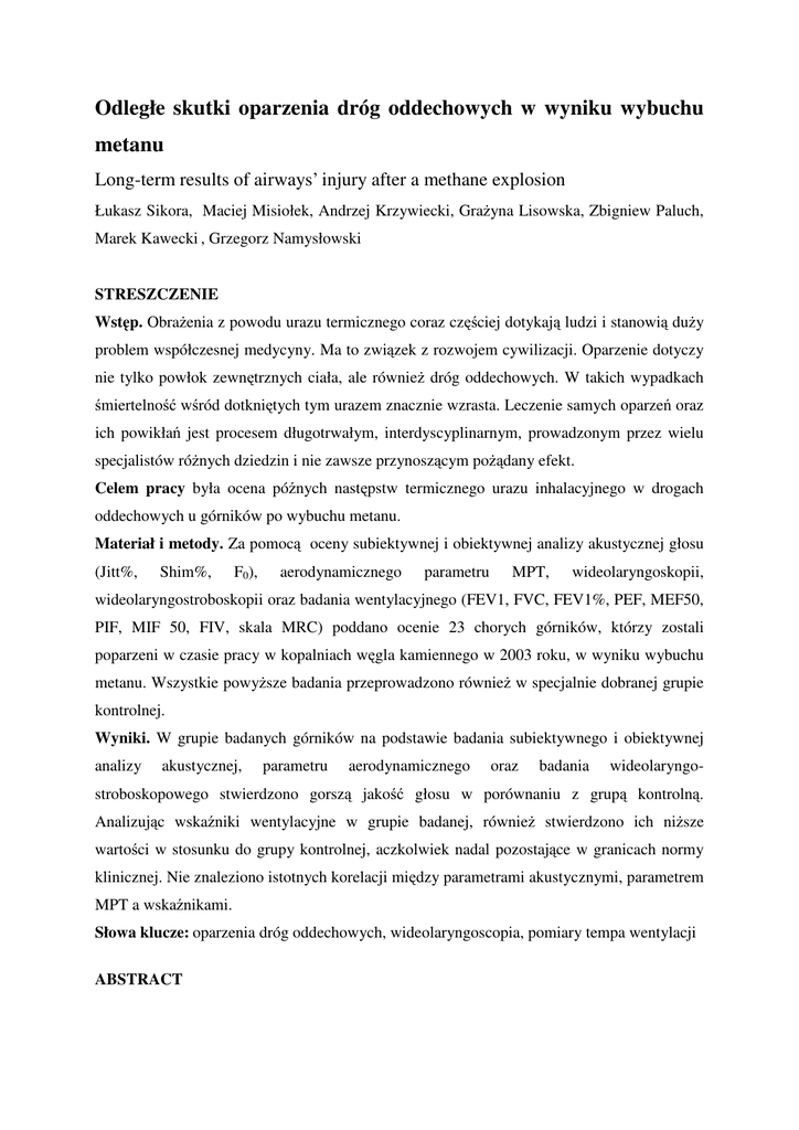 Odległe skutki oparzenia dróg oddechowych w wyniku wybuchu metanu Long-term results of airways’ injury after a methane explosion Łukasz Sikora, Maciej Misiołek, Andrzej Krzywiecki, Grażyna Lisowska, Zbigniew Paluch, Marek Kawecki , Grzegorz Namysłowski STRESZCZENIE Wstęp. Obrażenia z powodu urazu termicznego coraz częściej dotykają ludzi i stanowią duży problem współczesnej medycyny. Ma to związek z rozwojem cywilizacji. Oparzenie dotyczy nie tylko powłok zewnętrznych ciała, ale również dróg oddechowych. W takich wypadkach śmiertelność wśród dotkniętych tym urazem znacznie wzrasta. Leczenie samych oparzeń oraz ich powikłań jest procesem długotrwałym, interdyscyplinarnym, prowadzonym przez wielu specjalistów różnych dziedzin i nie zawsze przynoszącym pożądany efekt. Celem pracy była ocena późnych następstw termicznego urazu inhalacyjnego w drogach oddechowych u górników po wybuchu metanu. Materiał i metody. Za pomocą oceny subiektywnej i obiektywnej analizy akustycznej głosu (Jitt%, Shim%, F0), aerodynamicznego parametru MPT, wideolaryngoskopii, wideolaryngostroboskopii oraz badania wentylacyjnego (FEV1, FVC, FEV1%, PEF, MEF50, PIF, MIF 50, FIV, skala MRC) poddano ocenie 23 chorych górników, którzy zostali poparzeni w czasie pracy w kopalniach węgla kamiennego w 2003 roku, w wyniku wybuchu metanu. Wszystkie powyższe badania przeprowadzono również w specjalnie dobranej grupie kontrolnej. Wyniki. W grupie badanych górników na podstawie badania subiektywnego i obiektywnej analizy akustycznej, parametru aerodynamicznego oraz badania wideolaryngo- stroboskopowego stwierdzono gorszą jakość głosu w porównaniu z grupą kontrolną. Analizując wskaźniki wentylacyjne w grupie badanej, również stwierdzono ich niższe wartości w stosunku do grupy kontrolnej, aczkolwiek nadal pozostające w granicach normy klinicznej. Nie znaleziono istotnych korelacji między parametrami akustycznymi, parametrem MPT a wskaźnikami. Słowa klucze: oparzenia dróg oddechowych, wideolaryngoscopia, pomiary tempa wentylacji ABSTRACT Introduction. Injuries caused by thermal trauma more and more often affect people and they are an important problem of contemporary medicine. It is connected with the civilization development. Burn concerns not only the exterior integuments of the body but also airways, in those cases, the death rate among those who were injured with the thermal trauma increases. The treatment of both the burns and their complications is a long-lasting process, involving many specialists of various disciplines, and not always does it bring the wanted effects. Aim. The aim of the study was the assessment of the late morphological sequels inside the larynx and ventilation efficiency as a result of thermal inhalation trauma in the airways of the coal miners after the methane explosion. Material and methods. The methodology of examinations consisted of subjective evaluation of ventilation efficacy by MRC scale and ventilating rates measurements FEV1, FVC, FEV1%, PEF, MEF50, PIF, MIF 50, FIV. The morphological larynx evaluation was conducted based on videolaryngoscopy. 23 injured coal miners, who had been burnt at work in coal mines in 2003 in the methane explosion, were put under scrutiny. All the above mentioned examinations were done to the study group, but also to the specially selected control group, 23 coal miners. Results. During the ventilating rates analysis in the study group, their lower values were noticed in comparison to the control group, however, the values were still within the clinical norms. Videolaryngoscopy showed hypertrophy of the laryngeal tissues. Key words: burn of airways, videolaryngoscopy, ventilating rates measurements