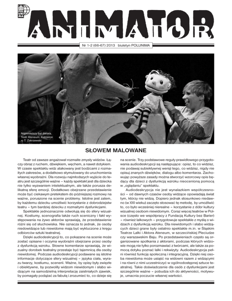 Nr 1-2 (66-67) 2013 biuletyn Polunima Najmniejszy bal świata, Teatr Ateneum, Katowice E T. Zakrzewski SŁOWEM MALOWANE Teatr od zawsze angażował rozmaite zmysły widzów. Łączy obraz z ruchem, dźwiękiem, węchem, a nawet dotykiem. W czasie spektaklu widz atakowany jest bodźcami z rozmaitych zakresów, a dodatkowo stymulowany do uruchomienia własnej wyobraźni. Dla rozwoju najmłodszych wyjście do teatru jest szczególnie ważne – każdy spektakl jest dla dziecka nie tylko wyzwaniem intelektualnym, ale także porusza delikatną sferę emocji. Dodatkowo obejrzane przedstawienie może być ciekawym pretekstem do późniejszej rozmowy na ważne, poruszone na scenie problemy. Istotne jest zatem, by każdemu dziecku umożliwić korzystanie z dobrodziejstw teatru – tym bardziej dziecku z rozmaitymi dysfunkcjami. Spektakle jednoznacznie odwołują się do sfery wizualnej. Kostiumy, scenografia także ruch sceniczny i fakt występowania na żywo aktorów sprawiają, że przedstawienie różni się od słuchowiska. Nie oznacza to jednak, że osoby niedowidzące lub niewidome mają być wykluczone z kręgu odbiorców sztuki teatralnej. Dzięki audiodeskrypcji to, co pokazane na scenie może zostać opisane i oczyma wyobraźni obejrzane przez osoby z dysfunkcją wzroku. Słowne komentarze sprawiają, że wizualny dorobek teatralny przestaje być tajemnicą dla osoby niewidomej. Podczas audiodeskrypcji podawane są istotne informacje dotyczące sfery wizualnej – języka ciała, wyrazu twarzy, kostiumu, scenerii. Ważne, by opisy były zwięzłe i obiektywne, by pozwoliły widzom niewidomym i słabo widzącym na samodzielną interpretację zaistniałych zjawisk, by pomagały podążać za fabułą i zrozumieć to, co dzieje się na scenie. Trzy podstawowe reguły prawidłowego przygotowania audiodeskrypcji są następujące: opisz, to co widzisz, nie podawaj subiektywnej wersji tego, co widzisz, nigdy nie opisuj znanych dźwięków, dialogu albo komentarza. Zachowując powyższe zasady można stworzyć wzorcowy opis będący dla dzieci z dysfunkcją wzroku nieocenioną pomocą w „oglądaniu” spektaklu. Audiodeskrypcja nie jest wynalazkiem współczesności – od dawnych czasów osoby widzące opowiadają świat tym, którzy nie widzą. Dopiero jednak stosunkowo niedawno (w XXI wieku) zaczęto stosować tę metodę, by umożliwić to, co było wcześniej nierealne – korzystanie z dóbr kultury wizualnej osobom niewidomym. Coraz więcej teatrów w Polsce (często we współpracy z Fundacją Kultury bez Barier) – również lalkowych – przygotowuje spektakle z myślą o widzach z dysfunkcją wzroku. Dla niewidomych i słabo widzących dzieci grane były ostatnio spektakle m.in. w Śląskim Teatrze Lalki i Aktora Ateneum, w szczecińskiej Pleciudze czy warszawskim Baju. Po przedstawieniach często są organizowane spotkania z aktorami, podczas których widzowie mogą nie tylko porozmawiać z twórcami, ale także za pomocą dotyku poznać lalki i rekwizyty. Audiodeskrypcja pełni również funkcję społeczną i integracyjną. Dzięki niej osoba niewidoma może usiąść na widowni razem z widzącymi i na równi z nimi uczestniczyć w ogólnodostępnej sztuce teatralnej. Takie doświadczenie dla osób z dysfunkcjami jest szczególnie ważne – pobudza ich do aktywności, motywuje, umacnia poczucie własnej wartości. ANIMATOR 1-2 (66-67) 2013 F E S T I W A L E • N A G R O D Y MASKARADA, Rzeszów Festiwal Teatrów Ożywionej Formy „Maskarada” odbywał się w Rzeszowie w dniach 5 – 12 maja. Jury w składzie: Krystyna Żuchowska (przewodnicząca), Agata Biziuk i Dorota Jarząbek–Wasyl przyznało następujące nagrody: Nagrodę za Najlepszy Spektakl (w kat. dziecięcej) Teatrowi Baj Pomorski Turandot E M. Jadczak za Najmniejszy bal świata, Zespołową Nagrodę Aktorską wykonawcom Le Filo Fable z Teatru Lalki i Aktora w Wałbrzychu – Sylwii Nowak, Jakubowi Grzybkowi, Pawłowi Pawlikowi, Nagrodę za Najlepsze Przedstawienie (w kategorii spektakli dla dorosłych) dla Grupy Coincidentia i NeTTheatre za Turandot, Nagrodę dla Najlepszej Aktorki Larysie Mikulicz za kreację aktorską w Damie Pikowej Teatru Lalek z Grodna, Męską Nagrodę Aktorską ex aequo Pawłowi Chomczykowi i Mariuszowi Laskowskiemu za role w spektaklu Turandot Grupy Coincidentia i NeTTheatre, Nagrodę za Najlepszą Animację dla Henryka Hryniewieckiego – twórcy spektaklu marionetkowego Cyrk Hrynek. Pawłowi Aignerowi za reżyserię Najmniejszego balu świata Teatru Baj Pomorski, Adamowi Walnemu za obiekty sceniczne w przedstawieniu Mikrokosmos. Kompozycje Białostockiego Teatru Lalek i Podlaskiego Stowarzyszenia Tańca, Pawłowi Passiniemu i Samborowi Dudzińskiemu za opracowanie muzyczne spektaklu Morrison/Śmiercisyn Opolskiego Teatru Lalki i Aktora, Piotrowi Klimkowi za kompozycję piosenek do Najmniejszego balu świata Teatru Baj Pomorski, Marii Dąbrowskiej za wykonanie piosenek w Najmniejszym balu świata Teatru Baj Pomorski, Robertowi Łuczakowi za muzykę do Złotego klucza Teatru Banialuka, Dominice Miękus za rolę Migawki w Najmniejszym balu świata Teatru Baj Pomorski, Helenie Sujeckiej za rolę Pameli Courson w spektaklu Morrison/Śmiercisyn Teatru Lalki i Aktora w Opolu, Katarzynie Pohl za rolę Kasi w Złotym kluczu Teatru Lalek Banialuka, Ryszardowi Sypniewskiemu za rolę Karczmarza w Złotym kluczu Teatru Lalek Banialuka, Pawłowi Aignerowi za rolę Drakula Nosferata w Krwawej jatce Grupy Coincidentia. Sekcja Teatrów Lalkowych ZASP-u uhonorowała Nagrodą Aktorską im. Profesora Władysława Jaremy w dziedzinie animacji lalkowej zespół Teatru Banialuka z Bielska-Białej za role w spektaklu Złoty klucz. Dyplom honorowy POLUNIMY wręczono Pawłowi Aignerowi. OGÓLNOPOLSKI FESTIWAL TEATRÓW LALEK, Opole W Opolu, w dniach 6–11 maja odbywał się XXVI Ogólnopolski Festiwal Teatrów Lalek. Jury w składzie: Piotr Cieplak (przewodniczący), Wiesław Cichy, Leszek Mądzik, Maciej Nowa