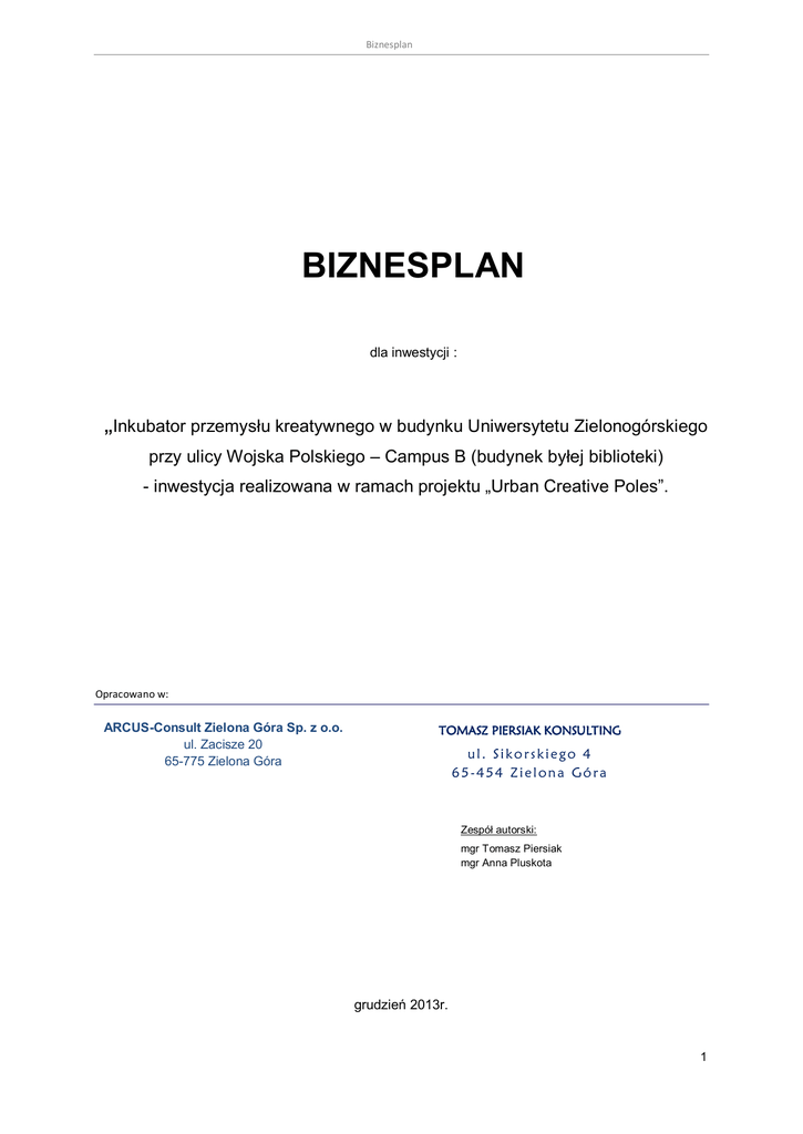 Biznesplan BIZNESPLAN dla inwestycji : „Inkubator przemysłu kreatywnego w budynku Uniwersytetu Zielonogórskiego przy ulicy Wojska Polskiego – Campus B (budynek byłej biblioteki) - inwestycja realizowana w ramach projektu „Urban Creative Poles”. Opracowano w: ARCUS-Consult Zielona Góra Sp. z o.o. ul. Zacisze 20 65-775 Zielona Góra TOMASZ PIERSIAK KONSULTING ul. Sikorskiego 4 65-454 Zielona Góra Zespół autorski: mgr Tomasz Piersiak mgr Anna Pluskota grudzień 2013r. 1 Biznesplan SPIS TREŚCI I. Streszczenie .......................................................................................................................................3 I. CHARAKTERYSTYKA podmiotu ..............................................................................................................4 I.1. Podstawowe dane teleadresowe ..................................................................................................4 I.2. Profil i zakres działalności .............................................................................................................4 I.3. Zarządzanie i personel ..................................................................................................................5 I.4. Rynek i oddziaływanie ..................................................................................................................6 II. CHARAKTERYSTYKA INWESTYCJI...........................................................................................................7 II.1. Plan organizacyjny ......................................................................................................................7 II.2. Harmonogram realizacji inwestycji ..............................................................................................7 II.3. Analiza sytuacji rynkowej ............................................................................................................7 II.4. Prezentacja nowego przedsięwzięcia ...........................................................................................9 II.5. Analiza finansowa ..................................................................................................................... 10 III. ZAŁĄCZNIKI .................................................................................................................................... 14 2 Biznesplan I. STRESZCZENIE Cel biznesplanu Celem opracowania biznesplanu jest sformułowanie głównych założeń inwestycji realizowanej przez Akademicki Inkubator Przedsiębiorczości Uniwersytetu Zielonogórskiego. Posłuży on jako narzędzie niezbędne w procesie zarządzania oraz planowania działań związanych ze zmianą siedziby inkubatora. Główne założenia i cele przedsięwzięcia Przedmiotem inwestycji jest adaptacja wydzielonego obszaru parteru budynku Uniwersytetu Zielonogórskiego przy ulicy Wojska Polskiego – Campus B (budynek byłej biblioteki) na Akademicki Inkubator Przedsiębiorczości – inkubator przemysłu kreatywnego, zlokalizowanego na działce nr 167/27 obręb 21 w Zielonej Górze. Celem inwestycji jest nadanie w/w budynkowi UZ nowych funkcji związanych z rozpoczęciem działalności w nim AIP. Inwestycja realizowana jest w ramach projektu „Urban Creative Poles”. Nakłady inwestycyjne Przewidywane nakłady finansowe inwestycji wynoszą 1.196.750,00 PLN netto. Będą one w całości pokryte ze środków Uniwersytetu Zielonogórskiego. Harmonogram realizacji projektu Realizacja inwestycji odbędzie się w okresie I i II kwartału 2014r. Wnioski z analizy finansowej Przepływy finansowe w każdym roku analizy są ujemne i wskazują na konieczność corocznego pokrywania ich z zewnętrznych źródeł w wysokości ponad 200,00 tys. PLN. W ramach analizy nie stwierdzono występowania dodatniego przepływu odroczonego w czasie, który pokrywałby skumulowane saldo wcześniejszych przepływów ujemnych. 3 Biznesplan I. CHARAKTERYSTYKA PODMIOTU I.1. Podstawowe dane teleadresowe Inwestor: Akademicki Inkubator Przedsiębiorczości Adres: ul. Ogrodowa 3b, 65-516 Zielona Góra, pokój 105, budynek C-10 telefon, fax: 68 – 328 78 36 e-mail: [email protected] www: www.aip.uz.zgora.pl I.2. Profil i zakres działalności Akademicki Inkubator Przedsiębiorczości Uniwersytetu Zielonogórskiego w Zielonej Górze jest ogólnouczelnianą jednostką organizacyjną utworzoną w 2006 roku w wyniku współpracy Uniwersytetu Zielonogórskiego i Urzędu Miejskiego w Zielonej Górze. Ideą jej utworzenia było stworzenie warunków sprzyjających rozwojowi indywidualnych karier społeczności akademickiej i realizacji przedsiębiorczych idei. Misją AIP jest ułatwienie startu studentom i absolwentom wyższych uczelni na rynku pracy poprzez pomoc w założeniu i prowadzeniu własnej firmy. Oferowana przez AIP pomoc opiera się na udostępnieniu młodym przedsiębiorcom atrakcyjnego organizacyjnie i finansowo miejsca prowadzenia działalności gospodarczej. Obecnie Inkubator dysponuje powierzchnią ponad 700m2 w budynku Uniwersytetu Zielonogórskiego zlokalizowanym przy ul. Ogrodowej 3b w Zielonej Górze. W ofercie AIP są kilkanaście pomieszczeń o powierzchni ok. 16m 2, 32m2 i 48m2, wraz z dostępem do adresu inkubatora, nr telefonu i faxu, do sieci Internet i obsługą sekretariatu w zakresie ekspedycji i odbierania poczty oraz korzystania z komputera, drukarki i innych podstawowych urządzeń biurowych. Przedsiębiorcy mają dostęp do specjalistycznej prasy i opracowań biznesowych zakupywanych i prenumerowanych przez inkubator. 2 2 Inkubator udostępnia również dwie salki konferencyjne o powierzchni 32,0m i 65,0 m . Pomieszczenia są wyposażone w podstawowe meble biurowe i łącza telekomunikacyjne (telefoniczne, sieć komputerowa). AIP w ramach swojej działalności prowadzi nieodpłatne doradztwo w zakresie tworzenia i prowadzenia własnej firmy, a także doradztwo prawne, księgowe i organizacyjne w trakcie okresu inkubacji. Umożliwia udz