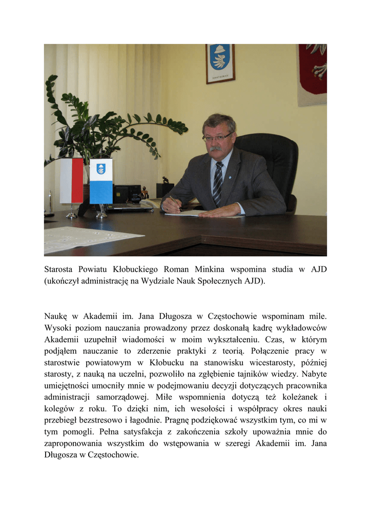 Starosta Powiatu Kłobuckiego Roman Minkina wspomina studia w AJD (ukończył administrację na Wydziale Nauk Społecznych AJD). Naukę w Akademii im. Jana Długosza w Częstochowie wspominam mile. Wysoki poziom nauczania prowadzony przez doskonałą kadrę wykładowców Akademii uzupełnił wiadomości w moim wykształceniu. Czas, w którym podjąłem nauczanie to zderzenie praktyki z teorią. Połączenie pracy w starostwie powiatowym w Kłobucku na stanowisku wicestarosty, później starosty, z nauką na uczelni, pozwoliło na zgłębienie tajników wiedzy. Nabyte umiejętności umocniły mnie w podejmowaniu decyzji dotyczących pracownika administracji samorządowej. Miłe wspomnienia dotyczą teŜ koleŜanek i kolegów z roku. To dzięki nim, ich wesołości i współpracy okres nauki przebiegł bezstresowo i łagodnie. Pragnę podziękować wszystkim tym, co mi w tym pomogli. Pełna satysfakcja z zakończenia szkoły upowaŜnia mnie do zaproponowania wszystkim do wstępowania w szeregi Akademii im. Jana Długosza w Częstochowie.