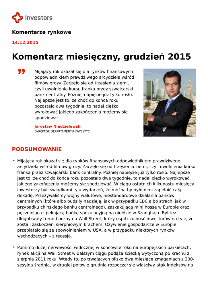 Komentarze rynkowe 14.12.2015 Komentarz miesięczny, grudzień 2015 Mijający rok okazał się dla rynków finansowych odpowiednikiem prawdziwego arcydzieła wśród filmów grozy. Zaczęło się od trzęsienia ziemi, czyli uwolnienia kursu franka przez szwajcarski bank centralny. Później napięcie już tylko rosło. Najlepsze jest to, że choć do końca roku pozostało dwa tygodnie, to nadal ciężko wyrokować jakiego zakończenia możemy się spodziewać... Jarosław Niedzielewski DYREKTOR DEPARTAMENTU INWESTYCJI PODSUMOWANIE • Mijający rok okazał się dla rynków finansowych odpowiednikiem prawdziwego arcydzieła wśród filmów grozy. Zaczęło się od trzęsienia ziemi, czyli uwolnienia kursu franka przez szwajcarski bank centralny. Później napięcie już tylko rosło. Najlepsze jest to, że choć do końca roku pozostało dwa tygodnie, to nadal ciężko wyrokować jakiego zakończenia możemy się spodziewać. W ciągu ostatnich kilkunastu miesięcy inwestorzy byli świadkami tylu wydarzeń, że można by było nimi zapełnić całą dekadę. Przeżywaliśmy wojny walutowe, niestandardowe działania banków centralnych (które albo budziły nadzieję, jak w przypadku EBC albo strach, jak w przypadku chińskiego banku centralnego), zaskakującą mini hossę w Europie oraz pęczniejącą i pękającą bańkę spekulacyjną na giełdzie w Szanghaju. Był też długotrwały trend boczny na Wall Street, który uśpił czujność inwestorów na tyle, że zostali zaskoczeni sierpniowym krachem. Ożywienie gospodarcze w Europie przeplatało się ze spowolnieniem w USA, a w przypadku niektórych rynków wschodzących – z recesją. • Pomimo dużej nerwowości widocznej w końcówce roku na europejskich parkietach, rynek akcji na Wall Street w dalszym ciągu podąża ścieżką wytyczoną po krachu z sierpnia 2011 roku. Wtedy to, po trwających blisko dwa miesiące zmaganiach z 200sesyjną średnią, w drugiej połowie grudnia rozpoczął się właściwy atak indeksów na szczyty z pierwszej połowy roku. Formalnie na zwycięstwo rynku byka (nowe rekordy) trzeba było poczekać do końca lutego 2012 roku, jednak kamień węgielny pod fundament tego ruchu, wmurowano dokładnie dwie sesje po trzecim piątku grudnia. • Tym razem trzeci piątek miesiąca przypada 18 grudnia, dwa dni po wysoce prawdopodobnym ogłoszeniu decyzji FED o pierwszej od ponad dekady podwyżce stóp procentowych. Dodatkowo, zgodnie z wyliczeniami analityków JP Morgan, wartość opcji wygasających w przyszłym tygodniu jest największa od lat i sięga ponad 1 biliona dolarów. Jeśli rynek miałby rozpocząć jakiś jednoznaczny ruch, to, zgodnie z wzorcem sprzed czterech lat i po rozwianiu wątpliwości dotyczących podwyżek stóp w USA, powinien to być początek świątecznego tygodnia. Wielu inwestorów, w tym analitycy JP Morgan, obawia się raczej negatywnych konsekwencji tej koincydencji zdarzeń. Ja mam jednak nadzieję, że powtórzy się scenariusz z 2011 roku i nie będzie przykrych niespodzianek. • Ma to kluczowe znaczenie dla naszego parkietu, który, wraz z giełdami na Ukrainie, w Egipcie, czy w Kolumbii, zalicza się do najsłabszych rynków świata ostatniego półrocza. Wygląda na to, że polityczna zapowiedź sprzed kilku lat, że w Warszawie będziemy mieli drugi Budapeszt, zrealizowała się z zadziwiającą dokładnością. W rezultacie w strategiach domów inwestycyjnych Europy zachodniej na 2016 rekomenduje się przeważanie Węgier, a niedoważanie Polski, czyli odwrócenie strategii z poprzednich lat. Jeśli światowe giełdy podążą za wzorcem z przełomu lat 2011 i 2012, mierząc się z historycznymi szczytami, mamy szansę ustanowić nominalny dołek ponad półrocznej fali politycznych spadków jeszcze w tym roku i to blisko obecnych poziomów indeksów. Jednak na odzyskanie utraconej w tym czasie siły względem giełd regionu będziemy musieli poczekać znacznie dłużej. Interesują Cię analizy i prognozy rynku kapitałowego? Zapraszamy do zapoznania się z opiniami i prognozami rynkowymi Dyrektora Departamentu Inwestycji w Investors TFI w formie comiesięcznych przekrojowych raportów oraz bieżących komentarzy. Publikacje Dyrektora Departamentu Inwestycji ukazują się także regularnie w mediach ekonomicznych, m.in. w Gazecie Giełdy Parkiet. Komentarze Dyrektora Departamentu Inwestycji