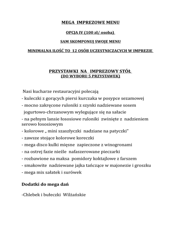MEGA IMPREZOWE MENU OPCJA IV (100 zł/ osoba) SAM SKOMPONUJ SWOJE MENU MINIMALNA ILOŚĆ TO 12 OSÓB UCZESTNICZACYCH W IMPREZIE PRZYSTAWKI NA IMPREZOWY STÓŁ (DO WYBORU 5 PRZYSTAWEK) Nasi kucharze restauracyjni polecają - kuleczki z gorących piersi kurczaka w posypce sezamowej - mocno zakręcone ruloniki z szynki nadziewane sosem jogurtowo-chrzanowym wylegujące się na sałacie - na pełnym lansie łososiowe ruloniki zwinięte z nadzieniem serowo łososiowym - kolorowe „ mini szaszłyczki nadziane na patyczki” - zawsze stojące kolorowe koreczki - mega disco kulki mięsne zapieczone z winogronami - na ostrej fazie nieźle nafaszerowane pieczarki - rozbawione na maksa pomidory koktajlowe z farszem - smakowite nadziewane jajka tańczące w majonezie i groszku - mega mix sałatek i surówek Dodatki do mega dań -Chlebek i bułeczki Wilżańskie NIEŹLE ZAKRĘCONE SOSY (DO WYBORU 2 SOSY) - jogurtowo koperkowy - majonezowo tatarski - pomidorowo ziołowy I danie: ( do wyboru 1 zupa ) - Gulaszowa po zbójnicku - Żur z grzybami kiełbasą z pierożkami i jajem - Flaczki domowe - Kwaśnica po góralsku na wędzące - Barszczyk czerwony zabielany, przygotowany na wędzonym żebrze, serwowany z jajeczkiem - barszcz czerwony zabielany z wędzonym żebrem i białą kiełbasą - Domowy rosół z makaronem babuni II danie do wyboru cztery rodzaje mięs DANIA Z DROBIU -kotlet DE VOLAILLE -filet z kurczaka panierowany -udka z nadzieniem pieczarkowym -pierś z kurczaka grillowana -udziec z indyka w sosie śmietanowym DANIA Z WIEPRZOWINY I WOŁOWINY -kotlet schabowy z kością -schab pieczony w sosie pieczarkowo- grzybowym -zrazy wieprzowe z nadzieniem pieczarkowo- ziołowym -karkówka w sosie borowikowym -schab w sosie chrzanowym -wołowina w sosie chrzanowo – śmietanowym Dodatki do drugich dań: 1.( do wybory jedna z poniższych opcji): -ziemniaki z dodatkiem masła czosnkowego -kopytka lub kluski śląskie - kasza gryczana -ryż NA CIEPŁO ( do wyboru 1 rodzaj) - Pieczarki z patelni z cebulką - Kapusta zasmażana - Marchewka z groszkiem - Buraczki zasmażane - Warzywa gotowane BUKIET SURÓWEK - Wiosenna (papryka, pomidor, rzodkiewka, sałata szczypiorek, ogórek,por) - Z białej kapusty (kapusta, marchewka, koperek) - Z marchwi (marchewka seler jabłko) - Z pora (por, jabłko) - Z czerwonej kapusty (kapusta ,jabłko, cebula) - pomidory z cebulą DODATKI: Do wyboru jedna pozycja - ziemniaki - ryż - kasza - kopytka - kluski śląskie LUB PŁONĄCE KORYTO MIĘS STAROPOLSKICH ( oprócz wymienionych poniżej mięs w korycie mogą znajdować się również w/w wybrane pozycje z dań z drobiu, wieprzowiny itp.) Najwyższej jakości swojskie mięsa ze specjalnych marynat oraz wyroby wiejskie według staropolskich przepisów: Paleta mięs do wyboru: Do wyboru cztery mięsa -schab pieczony -karkówka z pieca -kotlet schabowy -kotlet de volaille -szaszłyk drobiowy -szaszłyk wieprzowy -pierś z kurczaka -golonka z pieca -kiełbasy swojskie oplatane plastrami boczku -kaszanki oplatane plastrami boczku -żeberka pieczone DODATKI DO KORYTA - ziemniaki opiekane z sosem Tzatziki LUB Płonąca Deska rybaka RYBY Z NASZYCH STAWÓW ( do wyboru) Wilżańskie świeżutkie rybki z własnej hodowli, które serwujemy prosto z patelni, pieca, grilla oraz z naszej wędzarni. talarki, ziemniaki opiekane oraz cała zielenina wszystkie sosy. - Sandacz filet - Okoń filet - Miętus królewski RYBY MORSKIE - Halibut - Dorsz DODATKI DO DESKI -ziemniaki z wody - frytki DESKE I KORYTO MOŻNA SERWOWAĆ PÓŁ NA PÓŁ KĄCIK ŁASUCHA (DO WYBORU 4 POZYCJE) - stunigowane kolorowe całkiem niezłe babki z owocami - rurki dziurki z nadzieniem coctailowym - kolorowe galaretki z ubitą śmietaną - całkiem pijane ciasto dozwolone od lat 18 Tematyczne erotyczne torty w różnych kształtach dozwolone od 18 lat. Koszt: 50zł/kg KĄCIK KAWOWY Paleta kaw i herbat z dodatkami BAREK Z NAPOJAMI Paleta Napoi (gramatura sugerowana1 l. osobę ) - paleta soków owocowych - napoje gazowane( cola, fanta, sprite, woda) - woda niegazowana – może być podawana w dzbankach z cytryną, limonką oraz miętą III DANIE: ( dodatkowo płatne 20 zł/osoba) NASI SZEFOWIE KUCHNI POLECAJĄ: Barszcz czerwony oraz KORYTO PIEROGÓW I KROKIETÓW Klub Muzyczny Mega Music Wilga ul. Stawowa 9, 08-470 Wilga Informacja tel. +48 512 464 846 (kontakt w godzinach od 08:00 do 18:00) mail. [email protected]