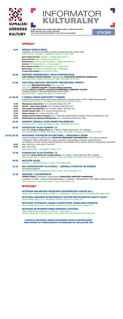 IMPREZY IMPREZY 6.01 ORSZAK TRZECH KRÓLI największe w Europie uliczne jasełka, przemarsz barwnego korowodu ulicami miasta 6.01 10.01 12.01 wyjście Orszaku – Aquapark, ul. Papieża Jana Pawła II 7, godz. 13.00 ORSZAK TRZECH KRÓLI CEZARA AUGUSTA Aquapark, ul. Papieża Janakorowodu Pawła II 7 ulicami miasta największe EwDYKT Europie uliczne jasełka, przemarsz barwnego SZAŁAS PASTERZY SOK, ul. Papieża Pawła II 5 wyjście Orszaku – Aquapark, ul. Papieża JanaJana Pawła II 7, godz. 13.00 DWÓR HERODA kościół pw. Chrystusa Króla, ul. Papieża Jana Pawła II 3 EDYKT CEZARA AUGUSTA Aquapark, ul. Papieża Jana Pawła II 7 GOSPODA CHR Suwałki PLAZA, ul. J. Dwernickiego 15 SZAŁAS PASTERZY SOK, ul. Papieża Jana Pawła II 5 WALKA DOBRA ZE ZŁEM Muzeum Okręgowe, ul. T. Kościuszki 81 DWÓR HERODA kościół Chrystusa ul. Papieża Pawła II 3 BRAMA NIEBApw. konkatedra św.Króla, Aleksandra, plac J.Jana Piłsudskiego GOSPODA CHR Suwałki PLAZA, ul. park J. Dwernickiego STAJENKA BETLEJEMSKA Konstytucji 315 Maja WALKA DOBRA ZE ZŁEM Muzeum Okręgowe, ul. T. Kościuszki 81 10.01 KONCERT SYMFONICZNIE BRAMA NIEBA konkatedraNOWOROCZNY: św. Aleksandra, plac SALSA J. Piłsudskiego JOSE TORRES & HAVANA DREAMS z towarzyszeniem SUWALSKIEJ ORKIESTRY KAMERALNEJ STAJENKA BDuża ETLEJEMSKA park Konstytucji 3 Maja Scena SOK, ul. Papieża Jana Pawła II 5, godz. 19.00 (bilety 50 zł /40 zł) KONCERT NOWOROCZNY: SALSA SYMFONICZNIE 12.01 XXII FINAŁ WIELKIEJ ORKIESTRY ŚWIĄTECZNEJ POMOCY JOSE TORRES HAVANA DREAMS towarzyszeniem SUWALSKIEJ ORKIESTRY KAMERALNEJ godz.&20.00 ŚWIATEŁKO DOz NIEBA plener przed SOK Duża Scena SOK, ul. Papieża Jana Pawła II 5, godz. 19.00 (bilety 50 zł /40 zł) XXII godz. 20.30 KONCERT GALOWY i licytacja złotego serduszka wystąpią: BRACIA I SIOSTRY, Agnieszka KACZOROWSKA, CZERWONY TULIPAN FINAŁ WIELKIEJ ORKIESTRY ŚWIĄTECZNEJ POMOCY prowadzenie koncertu: Agnieszka Kaczorowska, Paulina Drażba godz. 20.00Duża ŚWIATEŁKO NIEBAJana plener przed Scena SOK, DO ul. Papieża Pawła II 5SOK (wstęp wolny) godz. 20.30 KONCERT GALOWY i licytacja złotego serduszka 13-19.01 T-MOBILE NOWEAgnieszka HORYZONTY TOURNÉECZERWONY TULIPAN wystąpią: BRACIA I SIOSTRY, KACZOROWSKA, przedpremierowe pokazy filmowe prezentujące i nagrodzone filmy 13. MFF T-Mobile Nowe Horyzonty prowadzenie koncertu: Agnieszka Kaczorowska, Paulinanajciekawsze Drażba Sala Kameralna SOK, godz. 18.00 (bilety 10 zł /seans, 45 zł /karnet na 7 filmów) Duża Scena SOK, ul. Papieża Jana Pawła II 5 (wstęp wolny) 13.01 Nieznajomy nad jeziorem, reż. A. Guiraudie (Francja 2013, 97’) 14.01 Shirley – wizje rzeczywistości, reż. G. Deutsch (Austria 2013, 92’) 13-19.01 T-MOBILE NOWE HORYZONTY TOURNÉE 15.01 Chore pokazy ptaki umierają łatwo, reż. N.najciekawsze Fackler (Gabon / USA 2012, 92’) przedpremierowe filmowe prezentujące i nagrodzone filmy 13. MFF T-Mobile Nowe Horyzonty Sala Kameralna SOK,Claudel godz. 18.00 zł /seans, 45 zł /karnet 16.01 Kamille 1915,(bilety reż. B. 10 Dumont (Francja 2013, 95’) na 7 filmów) 17.01 Kiedy J. A. Franco (USA 2013, 120’)2013, 97’) 13.01 Nieznajomy nadumieram, jeziorem,reż. reż. Guiraudie (Francja 18.01 – wizje Goltzius and the Pelican Company, reż.(Austria P. Greenaway (Wielka Brytania, Holandia, Francja, Chorwacja 2012, 128’) 14.01 Shirley rzeczywistości , reż. G. Deutsch 2013, 92’) 19.01 ptaki Niebiańskie Łąkowych Maryjczyków, Fedorchenko 15.01 Chore umierają żony łatwo, reż. N. Fackler (Gabon /reż. USAA.2012, 92’) (Rosja 2012, 106’) 16.01 Kamille Claudel 1915, ZESPOŁU reż. B. Dumont (Francja 2013, 95’) 18.01 KONCERT STARE DOBRE MAŁŻEŃSTWO 17.01 Kiedy umieram, reż. J. Franco (USA 2013, 120’) Duża Scena SOK, ul. Papieża Jana Pawła II 5, godz. 18.00 (bilety 50 zł /40 zł) 18.01 Goltzius and the Pelican Company, reż. P. Greenaway (Wielka Brytania, Holandia, Francja, Chorwacja 2012, 128’) 20.01 DYSKUSYJNY KLUB FILMOWY 13 19.01 Niebiańskie żony Łąkowych Maryjczyków, reż. A. Fedorchenko (Rosja 2012, 106’) pokaz filmu Droga na drugą stronę, reż. A. Damian (Polska, Rumunia 2011; 73’) / dyskusja Sala Kameralna SOK, ul. Papieża Jana Pawła II 5, godz. 18.00 (bilety 10 zł /seans, 30 zł /karnet na 6 filmów) 18.01 KONCERT ZESPOŁU STARE DOBRE MAŁŻEŃSTWO Duża ScenaSPOTKANIA SOK, ul. PapieżaTEATRALNE Jana Pawła II 5,ZA godz. 18.00 (bilety–50GWIAZDKA zł /40 zł) 22.01/25.01 KURTYNKĄ Z NIEBA 20.01 22.01/25.01 22.01 25.01 zabawa karnawałowa prowadzona przez TEATR POD ORZEŁKIEM Z BIAŁEGOSTOKU / mile widziane przebranie DYSKUSYJNY KLUB FILMOWY 13 w programie: wizyta w obserwatorium, wyścigi na kogutach Twardowskiego, budowanie rakiet kosmicznych, pokaz filmu gry Droga na drugą stronę, reż. A.słodki Damian (Polska, Rumunia 2011;(25.01, 73’) / dyskusja i konkursy na drodze mlecznej, poczęstunek, wizyta Mikołaja prosimy rodziców o przygotowanie upominków) Sala Kameralna SOK, ul. Papieża Jana Pawła II 5, godz. 18.00 (bilety 10 zł /seans, 30 zł /karnet na 6 filmów) 22.01 godz. 8.30-10.30; 11.00-13.00; 13.30-15.30 25.01 godz. 10.00-12.00 SPOTKANIA TEATRALNE ZA KURTYNKĄ – GWIAZDKA Z NIEBA sala granatowa SOK, ul. Noniewicza 71 (bilety zł) zabawa karnawałowa prowadzona przez TEATR POD 13 ORZEŁKIEM Z BIAŁEGOSTOKU / mile widziane przebranie w programie: wizyta w obserwatorium, wyścigi na kogutach Twardowskiego, budowanie rakiet kosmicznych, 27.01 DYSKUSYJNY KLUB FILMOWY 13 gry i konkursy na drodze mlecznej, słodki poczęstunek, wizyta Mikołaja (25.01, prosimy upominków) pokaz filmu Marina Abramović: artystka obecna, reż. A. Awers, J. Dupne (USA rodziców 2012; 99’)o /przygotowanie dyskusja Sala Kameralna SOK, ul. Papieża Jana Pawła II 5, godz. 18.00 (bilety 10 zł /seans, 30 zł /karnet na 6 filmów) godz. 8.30-10.30; 11.00-13.00; 13.30-15.30 godz. 10.00-12.00 30.01 WIECZÓR KOLĘD sala granatowa (bilety zł) 17.00 (wstęp wolny) patioSOK, SOK, ul. ul. Noniewicza Papież