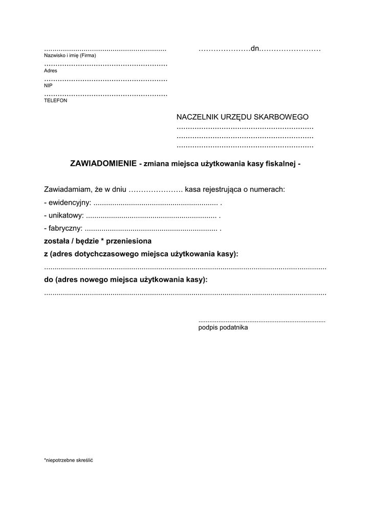 ........................................................... …………………dn.…………………… Nazwisko i imię (Firma) ....................................................... Adres ....................................................... NIP ....................................................... TELEFON NACZELNIK URZĘDU SKARBOWEGO ............................................................. ............................................................. ............................................................. ZAWIADOMIENIE - zmiana miejsca użytkowania kasy fiskalnej Zawiadamiam, że w dniu …………………. kasa rejestrująca o numerach: - ewidencyjny: ............................................................ . - unikatowy: ............................................................... . - fabryczny: ................................................................ . została / będzie * przeniesiona z (adres dotychczasowego miejsca użytkowania kasy): ........................................................................................................................................ do (adres nowego miejsca użytkowania kasy): ........................................................................................................................................ ...................................................................... podpis podatnika *niepotrzebne skreślić