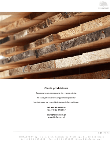 Oferta produktowa Zapraszamy do zapoznania się z naszą ofertą. W razie jakichkolwiek wątpliwości prosimy kontaktowac się z nami telefonicznie lub mailowo: Tel. +48 13 4471020 Fax. +48 13 4471067 [email protected] www.biofactory.pl 1|Strona BIOFACTORY Sp. z o.o. | ul. Kazimierza Wielkiego 21, 38-340 Biecz tel +48 13 4471020 | fax +48 13 4471067 |[email protected] Produkcja: 1. TARCICA IGLASTA: OBRZYNANA Tarcica budowlana (więźby dachowe) Tarcica ogólnego stosowania grubość 18-400 18 mm długość do 10,50 mb w klasie I. II, III, IV NIEOBRZYNANA Tarcica ogólnego stosowania grubość 18-400 18 mm długość do 10,50mb w klasie I, II, III, IV 2|Strona BIOFACTORY Sp. z o.o. | ul. Kazimierza Wielkiego 21, 38-340 Biecz tel +48 13 4471020 | fax +48 13 4471067 |[email protected] PODBITKA Deska strugana, montowana na pióro-wpust pióro wymiary 19x80/90/100/120 mm różne długości wymiary 14x100x2000/3000/4000 mm 2. TARCICA LIŚCIASTA OBRZYNANA I NIEOBRZYNANA BUKOWA Tarcica cztery strony bez wad (LHD) Tarcica ogólnego stosowania w kl. I, II, III, IV 3. FRYZY I ELEMENTY BUKOWE w różnych wymiarach i klasach świeże, parowane, suszone 4. ZRĘBKA DEFIBRACYJNA Są to elementy drewna o wymiarach wahających się w granicach od 1 cm do kilku cm. Nasz materiał stanowi dokonały surowiec do produkcji płyt wiórowych i pilśniowych oraz celulozy. Coraz częściej zrębka stosowana jest jako paliwo ekologiczne do kotłów na biomasę. Oferujemy zrębkę w postaci świeżej (wilgotność 40-60%) 40 5. TROCINY Stanowią ok. 10% masy drewna przecieranego w tartaku. Ze względu na wysoki stopień czystości stosowane osowane są w przemyśle: przemyśle - do produkcji płyt pilśniowych do produkcji brykietu jako ekologiczne paliwo do spalania spalani w piecach na biomasę jako ściółkowanie w ogrodnictwie 3|Strona BIOFACTORY Sp. z o.o. | ul. Kazimierza Wielkiego 21, 38-340 Biecz tel +48 13 4471020 | fax +48 13 4471067 |[email protected] 6. DREWNO KOMINKOWE Pocięte na odcinki 30 cm połupane pakowane na jednorazowej palecie w siatce ilość 1,6mp. Istotną zaletą jest fakt, że drewno jest materiałem odnawialnym i zawiera część energii słonecznej zmagazynowanej dzięki procesowi fotosyntezy odbywającemu się podczas wzrostu drewna. Jako ciekawostkęę można przytoczyć informację, żee energia wykorzystywana do procesu fotosyntezy przez światowe zasoby leśne około dziesięciokrotnie przewyższa yższa ilość energii generowanej przy spalaniu ropy naftowej, gazu ziemnego i węgla kamiennego. Popiół powstający po spaleniu drewna jest pełnowartościowym nawozem naturalnym. Ważnym aspektem ekologicznym jest praktycznie zerowy bilans CO2. Ilość emitowanego go dwutlenku węgla jest bardzo zbliżona do ilości tego gazu pochłoniętego w czasie wzrostu rośliny. 4|Strona BIOFACTORY Sp. z o.o. | ul. Kazimierza Wielkiego 21, 38-340 Biecz tel +48 13 4471020 | fax +48 13 4471067 |[email protected]