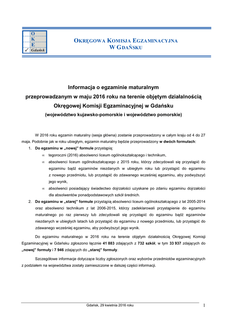 O K E OKRĘGOWA KOMISJA EGZAMINACYJNA W G DAŃSKU Gdańsk Informacja o egzaminie maturalnym przeprowadzanym w maju 2016 roku na terenie objętym działalnością Okręgowej Komisji Egzaminacyjnej w Gdańsku (województwo kujawsko-pomorskie i województwo pomorskie) W 2016 roku egzamin maturalny (sesja główna) zostanie przeprowadzony w całym kraju od 4 do 27 maja. Podobnie jak w roku ubiegłym, egzamin maturalny będzie przeprowadzony w dwóch formułach: 1. Do egzaminu w „nowej” formule przystąpią: • tegoroczni (2016) absolwenci liceum ogólnokształcącego i technikum, • absolwenci liceum ogólnokształcącego z 2015 roku, którzy zdecydowali się przystąpić do egzaminu bądź egzaminów niezdanych w ubiegłym roku lub przystąpić do egzaminu z nowego przedmiotu, lub przystąpić do zdawanego wcześniej egzaminu, aby podwyŜszyć jego wynik, • absolwenci posiadający świadectwo dojrzałości uzyskane po zdaniu egzaminu dojrzałości dla absolwentów ponadpodstawowych szkół średnich. 2. Do egzaminu w „starej” formule przystąpią absolwenci liceum ogólnokształcącego z lat 2005-2014 oraz absolwenci technikum z lat 2006-2015, którzy zadeklarowali przystąpienie do egzaminu maturalnego po raz pierwszy lub zdecydowali się przystąpić do egzaminu bądź egzaminów niezdanych w ubiegłych latach lub przystąpić do egzaminu z nowego przedmiotu, lub przystąpić do zdawanego wcześniej egzaminu, aby podwyŜszyć jego wynik. Do egzaminu maturalnego w 2016 roku na terenie objętym działalnością Okręgowej Komisji Egzaminacyjnej w Gdańsku zgłoszono łącznie 41 883 zdających z 732 szkół, w tym 33 937 zdających do „nowej” formuły i 7 946 zdających do „starej” formuły. Szczegółowe informacje dotyczące liczby zgłoszonych oraz wyborów przedmiotów egzaminacyjnych z podziałem na województwa zostały zamieszczone w dalszej części informacji. Gdańsk, 29 kwietnia 2016 roku 1 1. Przygotowanie i przebieg egzaminu Ministerstwo Edukacji Narodowej finansuje działania związane z organizacją i przeprowadzeniem egzaminu maturalnego. Zestawy zadań egzaminacyjnych ustala Centralna Komisja Egzaminacyjna. Za organizację i przebieg egzaminu w szkole odpowiadają przewodniczący zespołów egzaminacyjnych, którymi są dyrektorzy szkół. Przeprowadzenie egzaminu maturalnego w szkołach w województwie kujawsko-pomorskim i pomorskim naleŜy do zadań OKE w Gdańsku. Zadania te obejmują: • zebranie danych egzaminacyjnych o zdających, • zorganizowanie i przeprowadzenie szkoleń dla przewodniczących zespołów egzaminacyjnych lub ich zastępców, w tym przekazanie informacji dotyczących organizacji i przeprowadzenia egzaminu • odbiór arkuszy egzaminacyjnych i dokumentacji egzaminacyjnej od przewodniczących zespołów egzaminacyjnych, • przekazanie arkuszy egzaminacyjnych do placówek sprawdzania, • sprawdzenie odpowiedzi zdających zgodnie z zasadami oceniania obowiązującymi w całym kraju, • odbiór arkuszy egzaminacyjnych z placówek sprawdzania, • ustalenie wyników egzaminu, • przekazanie szkołom świadectw dojrzałości • przekazanie wyników do Centralnej Komisji Egzaminacyjnej oraz właściwych kuratoriów oświaty i organów prowadzących szkoły. Egzamin maturalny jest przeprowadzany raz w ciągu roku szkolnego – w okresie od maja do września. Zdający przystępuje do części ustnej i pisemnej egzaminu w swojej macierzystej szkole. 2. Nowa formuła egzaminu maturalnego Absolwent, przystępując do egzaminu maturalnego zdaje obowiązkowo: • w części ustnej – egzaminy, dla których nie określa się poziomu, z następujących przedmiotów: − język polski − język obcy nowoŜytny wybrany spośród języków: angielskiego, francuskiego, hiszpańskiego, niemieckiego, rosyjskiego i włoskiego − język mniejszości narodowej, jeśli jest absolwentem szkoły lub oddziału z językiem nauczania mniejszości narodowej • w części pisemnej – egzaminy na poziomie podstawowym z następujących przedmiotów: − język polski − matematyka − język obcy nowoŜytny (ten sam co w części ustnej) − język mniejszości narodowej, jeśli jest absolwentem szkoły lub oddziału z językiem nauczania mniejszości narodowej Gdańsk, 29 kwietnia 2016 roku 2 − w części pisemnej – jeden egzamin z przedmiotu dodatkowego na poziomie rozszerzonym lub – w przypadku języka obcego nowoŜytnego – na poziomie rozszerzonym lub dwujęzycznym. Wyboru dokonuje z następujących przedmiotów: − biologia − chemia − filozofia − fizyka − geografia − historia − historia muzyki − historia sztuki − informatyka − język łaciński i kultura antyczna − język mniejszości etnicznej (język łemkowski) − język mniejszości narodowej (wybór spośród następujących języków: białoruski, litewski, niemiecki, ukraiński) − język obcy nowoŜytny (wybór spośród następujących języków: angielski, francuski, hiszpański, niemiecki, rosyjski, włoski) − język polski − języka regionalny (język kaszubski) − matematyka − wiedzy o społeczeństwie Uczeń moŜe przystąpić w danym roku do egzaminu maturalnego z nie więcej niŜ pięciu przedmiotów dodatkowych wybranych spośród pozostałych przedmiotów dodatkowych wymienionych wyŜej. Egzamin maturalny z języka obcego nowoŜytnego, z języka mniejszości narodowej, języka mniejszości etnicznej lub języka regionalnego, jako przedmiotu dodatkowego, moŜe być zdawany tylko w części pisemnej albo w części pisemnej i w części ustnej z tego samego języka. 3. Stara formuła egzaminu maturalnego Absolwent, przystępując do egzaminu maturalnego zdaje obowiązkowo: • w części ustnej – egzaminy, dla których nie określa się poziomu, z następujących przedmiotów: − język polski − język obcy nowoŜytny wybrany spośród języków: angielskiego, francuskiego, hiszpańskiego, niemieckiego, rosyjskiego i włoskiego − język m