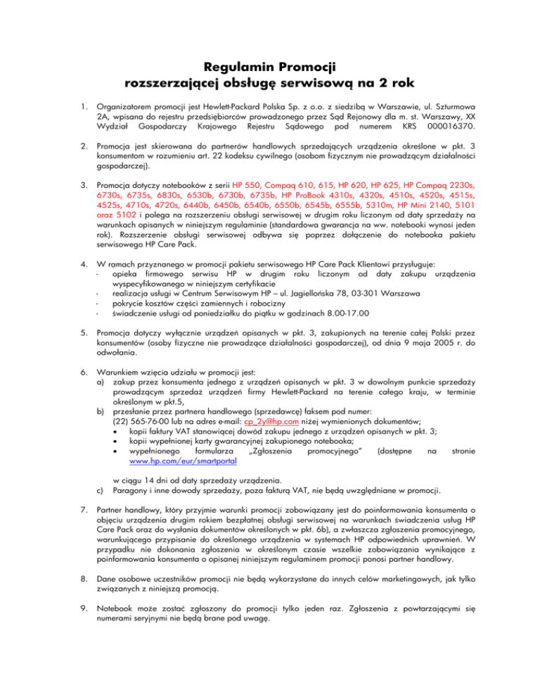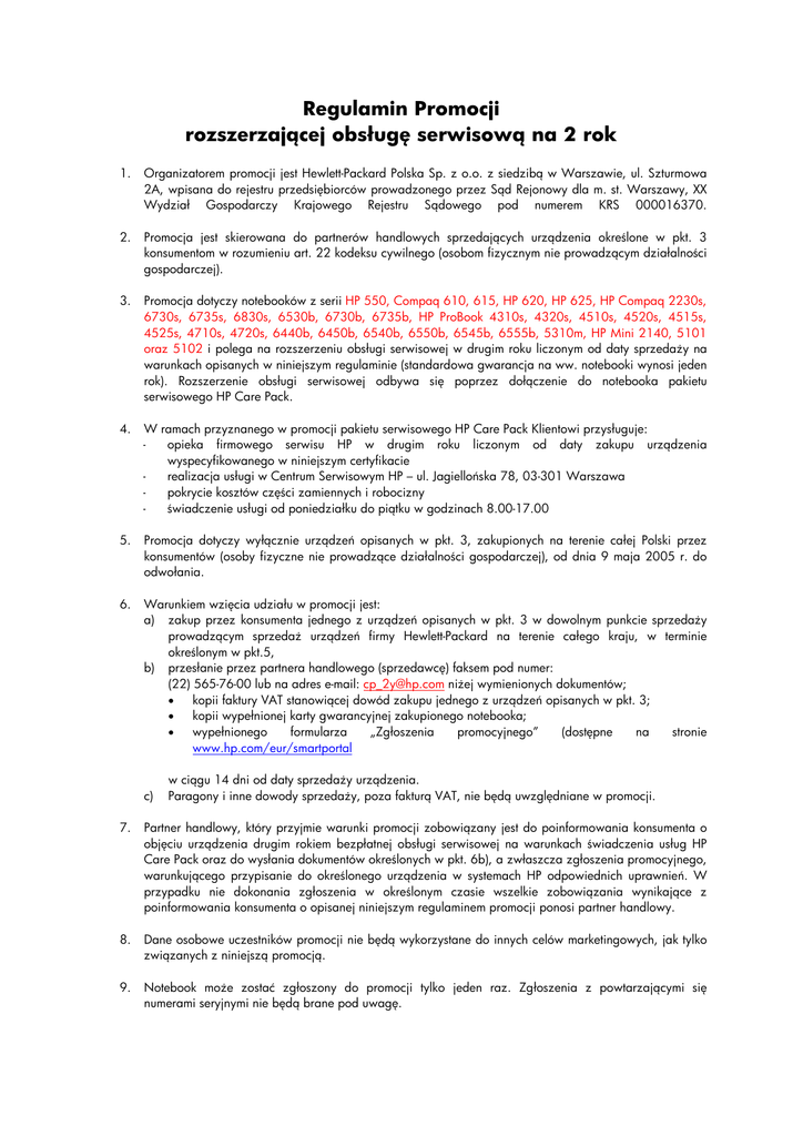 Regulamin Promocji rozszerzającej obsługę serwisową na 2 rok 1. Organizatorem promocji jest Hewlett-Packard Polska Sp. z o.o. z siedzibą w Warszawie, ul. Szturmowa 2A, wpisana do rejestru przedsiębiorców prowadzonego przez Sąd Rejonowy dla m. st. Warszawy, XX Wydział Gospodarczy Krajowego Rejestru Sądowego pod numerem KRS 000016370. 2. Promocja jest skierowana do partnerów handlowych sprzedających urządzenia określone w pkt. 3 konsumentom w rozumieniu art. 22 kodeksu cywilnego (osobom fizycznym nie prowadzącym działalności gospodarczej). 3. Promocja dotyczy notebooków z serii HP 550, Compaq 610, 615, HP 620, HP 625, HP Compaq 2230s, 6730s, 6735s, 6830s, 6530b, 6730b, 6735b, HP ProBook 4310s, 4320s, 4510s, 4520s, 4515s, 4525s, 4710s, 4720s, 6440b, 6450b, 6540b, 6550b, 6545b, 6555b, 5310m, HP Mini 2140, 5101 oraz 5102 i polega na rozszerzeniu obsługi serwisowej w drugim roku liczonym od daty sprzedaży na warunkach opisanych w niniejszym regulaminie (standardowa gwarancja na ww. notebooki wynosi jeden rok). Rozszerzenie obsługi serwisowej odbywa się poprzez dołączenie do notebooka pakietu serwisowego HP Care Pack. 4. W ramach przyznanego w promocji pakietu serwisowego HP Care Pack Klientowi przysługuje: opieka firmowego serwisu HP w drugim roku liczonym od daty zakupu urządzenia wyspecyfikowanego w niniejszym certyfikacie realizacja usługi w Centrum Serwisowym HP – ul. Jagiellońska 78, 03-301 Warszawa pokrycie kosztów części zamiennych i robocizny świadczenie usługi od poniedziałku do piątku w godzinach 8.00-17.00 5. Promocja dotyczy wyłącznie urządzeń opisanych w pkt. 3, zakupionych na terenie całej Polski przez konsumentów (osoby fizyczne nie prowadzące działalności gospodarczej), od dnia 9 maja 2005 r. do odwołania. 6. Warunkiem wzięcia udziału w promocji jest: a) zakup przez konsumenta jednego z urządzeń opisanych w pkt. 3 w dowolnym punkcie sprzedaży prowadzącym sprzedaż urządzeń firmy Hewlett-Packard na terenie całego kraju, w terminie określonym w pkt.5, b) przesłanie przez partnera handlowego (sprzedawcę) faksem pod numer: (22) 565-76-00 lub na adres e-mail: [email protected] niżej wymienionych dokumentów; • kopii faktury VAT stanowiącej dowód zakupu jednego z urządzeń opisanych w pkt. 3; • kopii wypełnionej karty gwarancyjnej zakupionego notebooka; • wypełnionego formularza „Zgłoszenia promocyjnego” (dostępne na stronie www.hp.com/eur/smartportal c) w ciągu 14 dni od daty sprzedaży urządzenia. Paragony i inne dowody sprzedaży, poza fakturą VAT, nie będą uwzględniane w promocji. 7. Partner handlowy, który przyjmie warunki promocji zobowiązany jest do poinformowania konsumenta o objęciu urządzenia drugim rokiem bezpłatnej obsługi serwisowej na warunkach świadczenia usług HP Care Pack oraz do wysłania dokumentów określonych w pkt. 6b), a zwłaszcza zgłoszenia promocyjnego, warunkującego przypisanie do określonego urządzenia w systemach HP odpowiednich uprawnień. W przypadku nie dokonania zgłoszenia w określonym czasie wszelkie zobowiązania wynikające z poinformowania konsumenta o opisanej niniejszym regulaminem promocji ponosi partner handlowy. 8. Dane osobowe uczestników promocji nie będą wykorzystane do innych celów marketingowych, jak tylko związanych z niniejszą promocją. 9. Notebook może zostać zgłoszony do promocji tylko jeden raz. Zgłoszenia z powtarzającymi się numerami seryjnymi nie będą brane pod uwagę. 10. Odsprzedaż notebooków objętych promocją nie upoważnia do ponownego rozszerzenia obsługi serwisowej. 11. Zgłoszenia niekompletne, tj. niezawierające pełnych danych określonych w pkt. 6 niniejszego regulaminu nie będą brane pod uwagę przy promocyjnym rozszerzaniu usługi serwisowej. 12. Konsument uczestniczący w promocji otrzymuje za pośrednictwem poczty Certyfikat serii PQ3/2/05 potwierdzający rozszerzenie obsługi serwisowej na zakupionego notebooka. 13. Usługi serwisowe będą świadczone na podstawie Certyfikatu serii PQ3/2/05 na warunkach w nim określonych. Korzystanie z tych usług nie wymaga od uczestnika promocji podejmowania dodatkowych działań, a w szczególności rejestracji poprzez stronę internetową. 14. Organizator zastrzega sobie prawo do zmiany bądź uzupełnienia warunków promocji. Informacja o zakończeniu promocji zostanie ogłoszona z 2 tygodniowym wyprzedzeniem. 15. Organizator promocji zastrzega sobie prawo do odmowy przyjęcia zgłoszenia z ważnych przyczyn dotyczących tego zgłoszenia lub do żądania dostarczenia dodatkowych dokumentów w celu weryfikacji zgłoszenia. 16. Wszelkie reklamacje dotyczące przebiegu promocji należy zgłaszać pisemnie pod adresem Organizatora: Hewlett-Packard Polska Sp. z o.o., ul. Szturmowa 2A, 02-678 Warszawa, z dopiskiem " CP-2Y”. 17. O status zgłoszenia można się dowiadywać pod dedykowanym do promocji adresem [email protected] 18. Formularz „Zgłoszenia promocyjnego” i „Warunki ogólne świadczenia usług serwisowych” stanowią integralną część regulaminu.