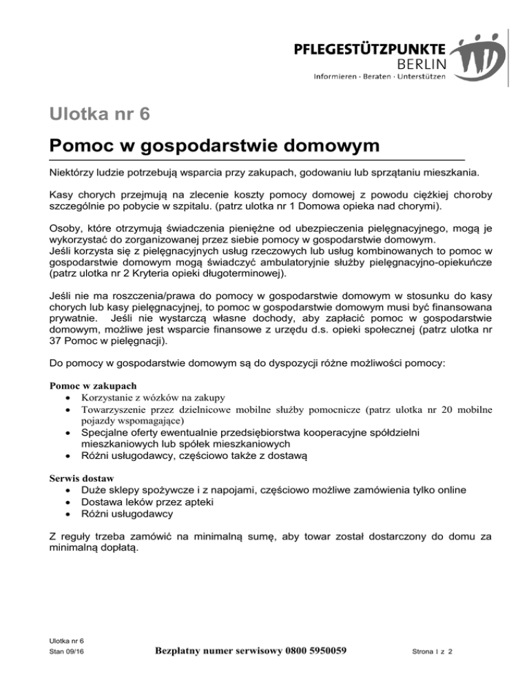 Ulotka nr 6 Pomoc w gospodarstwie domowym Niektórzy ludzie potrzebują wsparcia przy zakupach, godowaniu lub sprzątaniu mieszkania. Kasy chorych przejmują na zlecenie koszty pomocy domowej z powodu ciężkiej choroby szczególnie po pobycie w szpitalu. (patrz ulotka nr 1 Domowa opieka nad chorymi). Osoby, które otrzymują świadczenia pieniężne od ubezpieczenia pielęgnacyjnego, mogą je wykorzystać do zorganizowanej przez siebie pomocy w gospodarstwie domowym. Jeśli korzysta się z pielęgnacyjnych usług rzeczowych lub usług kombinowanych to pomoc w gospodarstwie domowym mogą świadczyć ambulatoryjnie służby pielęgnacyjno-opiekuńcze (patrz ulotka nr 2 Kryteria opieki długoterminowej). Jeśli nie ma roszczenia/prawa do pomocy w gospodarstwie domowym w stosunku do kasy chorych lub kasy pielęgnacyjnej, to pomoc w gospodarstwie domowym musi być finansowana prywatnie. Jeśli nie wystarczą własne dochody, aby zapłacić pomoc w gospodarstwie domowym, możliwe jest wsparcie finansowe z urzędu d.s. opieki społecznej (patrz ulotka nr 37 Pomoc w pielęgnacji). Do pomocy w gospodarstwie domowym są do dyspozycji różne możliwości pomocy: Pomoc w zakupach Korzystanie z wózków na zakupy Towarzyszenie przez dzielnicowe mobilne służby pomocnicze (patrz ulotka nr 20 mobilne pojazdy wspomagające) Specjalne oferty ewentualnie przedsiębiorstwa kooperacyjne spółdzielni mieszkaniowych lub spółek mieszkaniowych Różni usługodawcy, częściowo także z dostawą Serwis dostaw Duże sklepy spożywcze i z napojami, częściowo możliwe zamówienia tylko online Dostawa leków przez apteki Różni usługodawcy Z reguły trzeba zamówić na minimalną sumę, aby towar został dostarczony do domu za minimalną dopłatą. Ulotka nr 6 Stan 09/16 Bezpłatny numer serwisowy 0800 5950059 Strona 1 z 2 Obiad Obiad we wspólnocie Tanie danie obiadowe można często dostać we wspólnocie. Są różne oferty, specjalnie dla starszych ludzi np. poprzez Domy opieki, Ośrodki dzielnicowe, spotkania sąsiadów, miejsca spotkań seniorów Kantyny publicznej administracji, kantyny zakładowe Budki z jedzeniem i restauracje Sklepy mięsne / sklepy rzeźnicze Mobilny obiad Dzięki mobilnemu obiadowi ciepłe lub zamrożone menu może być na życzenie dostarczane codziennie lub tygodniowo do mieszkania. Liczni oferenci mobilnego obiadu oferują także różne formy diet jak np. dieta pełnowartościowa, żywność dietetyczna, różne diety (np. dieta cukrzycowa, pokarm jako piure). Pomiędzy oferentami są różnice cenowe. Opłaca się więc w każdym wypadku ich porównywanie. Jeśli potrzebny jest bemar, zamrażarka lub mikrofalówka można je także wypożyczyć u oferentów za odpowiednią opłatą. Przy niskich dochodach można złożyć wniosek w urzędzie d.s. opieki społecznej o wsparcie finansowe. To zależy od wysokości Państwa dochodu i od majątku. Oferty serwisów dostawczych obiadu / kolacji można także otrzymać z: - Kantyny - Firmy cateringowe - Sklepy mięsne / sklepy rzeźnicze, zazwyczaj w okolicy - Budki z jedzeniem i restauracje Sprzątanie mieszkania Są różni oferenci usług domowych, które sprzątają mieszkanie, myją okna i załatwiają inne przypadające w gospodarstwie domowym prace. Pracownicy tych usług mają ubezpieczenie społeczne. Kilka spółdzielni lub spółek mieszkaniowych dysponuje własnymi korzystnymi cenowo ofertami np. pośredniczą odnośnie przedsiębiorstw kooperacyjnych. Kto zatrudnia prywatną pomoc, powinien zwracać na to uwagę, że obowiązek ubezpieczenia społecznego obowiązuje także przy zatrudnieniu w niewielkim wymiarze czasu. Można ją zgłosić przez kasę chorych d.s. pomocy w domu. Dalsze informacje na ten temat uzyskają Państwo w centrali pracy na niepełny etat pod numerem: Tel.. 0355 2902-70799 od poniedziałku do piątku, od godz. 7: 00 do godz.17:00 www.minijob-zentrale.de Chętnie doradzą pracownikom ośrodka wsparcia d.s. opieki www.pflegestuetzpunkteberlin.de Podmiotami ośrodków wsparcia są land Berlin jak i kasa pielęgnacyjna i kasa chorych w Berlinie. Ulotka nr 6 Stan 09/16 Bezpłatny numer serwisowy 0800 5950059 Strona 2 z 2 Ulotka nr 6 Stan 09/16 Bezpłatny numer serwisowy 0800 5950059 Strona 3 z 2