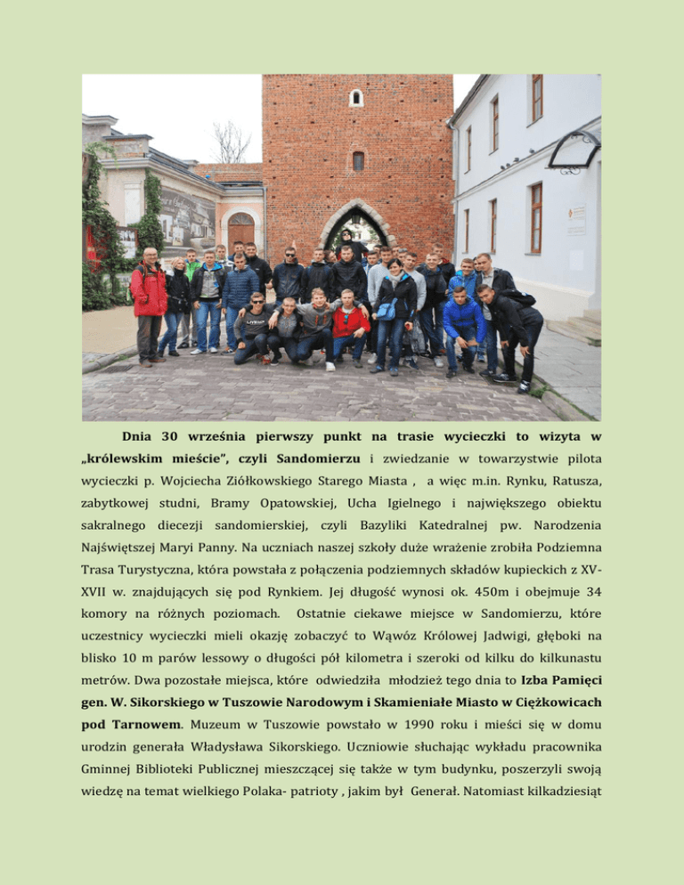Dnia 30 września pierwszy punkt na trasie wycieczki to wizyta w „królewskim mieście”, czyli Sandomierzu i zwiedzanie w towarzystwie pilota wycieczki p. Wojciecha Ziółkowskiego Starego Miasta , a więc m.in. Rynku, Ratusza, zabytkowej studni, Bramy Opatowskiej, Ucha Igielnego i największego obiektu sakralnego diecezji sandomierskiej, czyli Bazyliki Katedralnej pw. Narodzenia Najświętszej Maryi Panny. Na uczniach naszej szkoły duże wrażenie zrobiła Podziemna Trasa Turystyczna, która powstała z połączenia podziemnych składów kupieckich z XVXVII w. znajdujących się pod Rynkiem. Jej długość wynosi ok. 450m i obejmuje 34 komory na różnych poziomach. Ostatnie ciekawe miejsce w Sandomierzu, które uczestnicy wycieczki mieli okazję zobaczyć to Wąwóz Królowej Jadwigi, głęboki na blisko 10 m parów lessowy o długości pół kilometra i szeroki od kilku do kilkunastu metrów. Dwa pozostałe miejsca, które odwiedziła młodzież tego dnia to Izba Pamięci gen. W. Sikorskiego w Tuszowie Narodowym i Skamieniałe Miasto w Ciężkowicach pod Tarnowem. Muzeum w Tuszowie powstało w 1990 roku i mieści się w domu urodzin generała Władysława Sikorskiego. Uczniowie słuchając wykładu pracownika Gminnej Biblioteki Publicznej mieszczącej się także w tym budynku, poszerzyli swoją wiedzę na temat wielkiego Polaka- patrioty , jakim był Generał. Natomiast kilkadziesiąt fantazyjnie ukształtowanych form skalnych to główna atrakcja rezerwatu przyrody nieożywionej Skamieniałe Miasto, w powiecie tarnowskim, w Ciężkowicach. Nazwy nadane głazom, "Maczuga" czy "Piramida", nawiązują do ich wyglądu. Pierwszy dzień wycieczki wszyscy zakończyli smaczną obiadokolacją w pensjonacie „Willa Dunajec” w Krościenku nad Dunajcem. Drugi dzień pobytu w Pieninach uczestnikom wycieczki upłynął w godzinach przedpołudniowych na wizycie w urokliwym Wąwozie Homole i górskiej wędrówce na najwyższy szczyt Pienin, czyli Wysoką (1050m n.p.m.). Piękna, słoneczna pogoda sprawiła, iż ze szczytu wszyscy mieli szansę podziwiać także Tatry! Po zejściu z Wysokiej można było odetchnąć na ławce urokliwego rynku w Jaworkach. Po południu natomiast przyszedł czas na zwiedzanie Szczawnicy, wjazd wyciągiem krzesełkowym na Palenicę, niesamowitą „zabawę” na Letnim Torze Saneczkowym i przejście szlakiem do słowackiej wsi Leśnica. Potem przyszedł czas na smaczny obiad. Wieczorem wszyscy mieli okazję wziąć udział w biesiadzie przy ognisku nad rzeką Dunajec. To był też doskonały czas, aby dostrzec uroki Krościenka i poczuć niesamowity klimat miasteczka. 2 października, ostatni dzień wycieczki to także górska wędrówka najpierw na Sokolicę (747m n.p.m) a następnie na Trzy Korony (982m n.p.m.). Mimo, że wspinaczka trwała kilka godzin to jednak widoki z tych szczytów, podobnie jak z Wysokiej, warte były włożonego wysiłku. Uczniowie przekonali się, że Pieniny są naprawdę urokliwe, warto odwiedzić je jeszcze nieraz, a turystyka górska to ciekawy pomysł na życie. Ostatni punkt programu w drodze powrotnej to oczywiście wizyta w McDonalds. Wyjazd z pewnością można zaliczyć do udanych, a jego istotę najlepiej chyba oddadzą następujące słowa: „Radość życia przychodzi z nowymi doświadczeniami, a zatem nie ma większej radości niż mieć wciąż zmieniający się horyzont, każdego dnia inne i nowe słońce. [..] musisz zrezygnować z zamiłowania do bezpieczeństwa i żyć na łapu-capu [..] kiedy przywykniesz do takiego stylu, zrozumiesz jego znaczenie i niezwykłe piękno.” (Christopher McCandless)