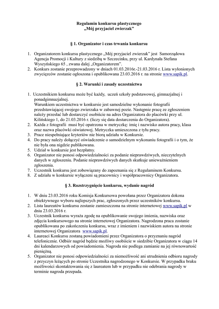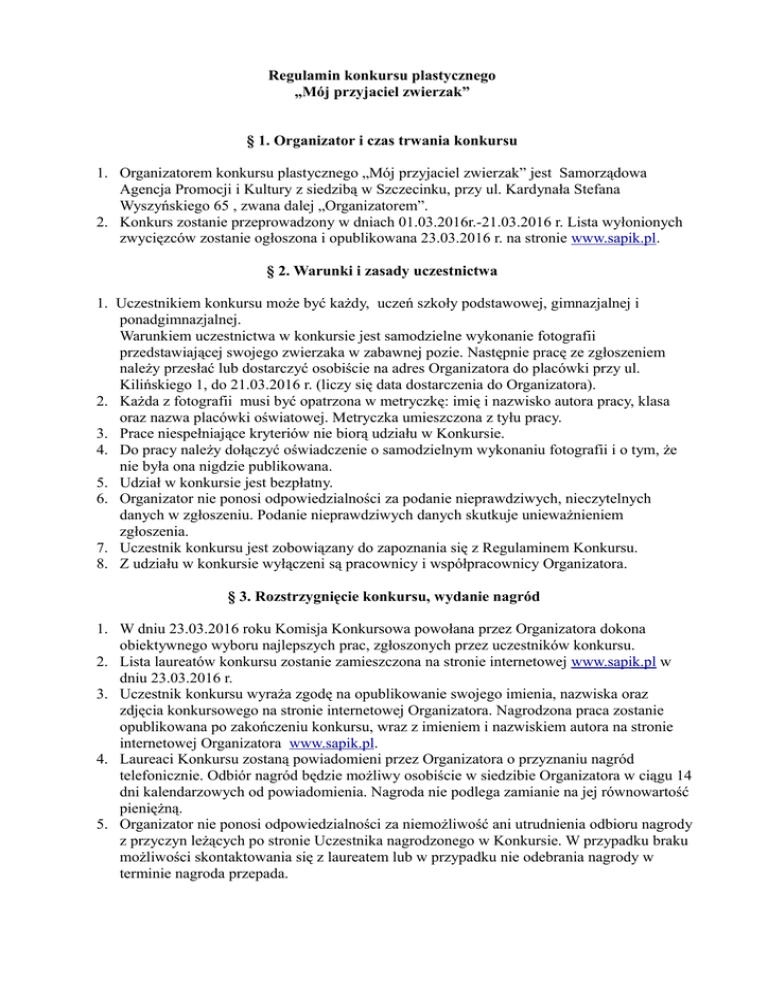 Regulamin konkursu plastycznego „Mój przyjaciel zwierzak” § 1. Organizator i czas trwania konkursu 1. Organizatorem konkursu plastycznego „Mój przyjaciel zwierzak” jest Samorządowa Agencja Promocji i Kultury z siedzibą w Szczecinku, przy ul. Kardynała Stefana Wyszyńskiego 65 , zwana dalej „Organizatorem”. 2. Konkurs zostanie przeprowadzony w dniach 01.03.2016r.-21.03.2016 r. Lista wyłonionych zwycięzców zostanie ogłoszona i opublikowana 23.03.2016 r. na stronie www.sapik.pl. § 2. Warunki i zasady uczestnictwa 1. Uczestnikiem konkursu może być każdy, uczeń szkoły podstawowej, gimnazjalnej i ponadgimnazjalnej. Warunkiem uczestnictwa w konkursie jest samodzielne wykonanie fotografii przedstawiającej swojego zwierzaka w zabawnej pozie. Następnie pracę ze zgłoszeniem należy przesłać lub dostarczyć osobiście na adres Organizatora do placówki przy ul. Kilińskiego 1, do 21.03.2016 r. (liczy się data dostarczenia do Organizatora). 2. Każda z fotografii musi być opatrzona w metryczkę: imię i nazwisko autora pracy, klasa oraz nazwa placówki oświatowej. Metryczka umieszczona z tyłu pracy. 3. Prace niespełniające kryteriów nie biorą udziału w Konkursie. 4. Do pracy należy dołączyć oświadczenie o samodzielnym wykonaniu fotografii i o tym, że nie była ona nigdzie publikowana. 5. Udział w konkursie jest bezpłatny. 6. Organizator nie ponosi odpowiedzialności za podanie nieprawdziwych, nieczytelnych danych w zgłoszeniu. Podanie nieprawdziwych danych skutkuje unieważnieniem zgłoszenia. 7. Uczestnik konkursu jest zobowiązany do zapoznania się z Regulaminem Konkursu. 8. Z udziału w konkursie wyłączeni są pracownicy i współpracownicy Organizatora. § 3. Rozstrzygnięcie konkursu, wydanie nagród 1. W dniu 23.03.2016 roku Komisja Konkursowa powołana przez Organizatora dokona obiektywnego wyboru najlepszych prac, zgłoszonych przez uczestników konkursu. 2. Lista laureatów konkursu zostanie zamieszczona na stronie internetowej www.sapik.pl w dniu 23.03.2016 r. 3. Uczestnik konkursu wyraża zgodę na opublikowanie swojego imienia, nazwiska oraz zdjęcia konkursowego na stronie internetowej Organizatora. Nagrodzona praca zostanie opublikowana po zakończeniu konkursu, wraz z imieniem i nazwiskiem autora na stronie internetowej Organizatora www.sapik.pl. 4. Laureaci Konkursu zostaną powiadomieni przez Organizatora o przyznaniu nagród telefonicznie. Odbiór nagród będzie możliwy osobiście w siedzibie Organizatora w ciągu 14 dni kalendarzowych od powiadomienia. Nagroda nie podlega zamianie na jej równowartość pieniężną. 5. Organizator nie ponosi odpowiedzialności za niemożliwość ani utrudnienia odbioru nagrody z przyczyn leżących po stronie Uczestnika nagrodzonego w Konkursie. W przypadku braku możliwości skontaktowania się z laureatem lub w przypadku nie odebrania nagrody w terminie nagroda przepada. § 6. Postanowienia końcowe 1. Regulamin znajduje się do wglądu na stronie internetowej www.sapik.pl. 2. Wszelkie pytania i uwagi można kierować na adres koordynatora konkursu – Sonia Weiske: [email protected]. 3. Dane osobowe uczestników mogą być przetwarzane przez Organizatora wyłącznie w celu wykonania obowiązków związanych z Konkursem oraz w celach informacyjnomarketingowych Organizatora. Dane będą chronione zgodnie z Ustawą o Ochronie Danych Osobowych (Dz. U. Nr 133/97, poz. 883).