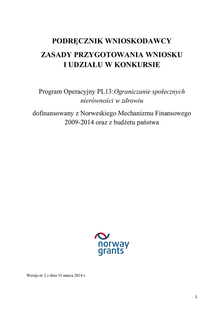 PODRĘCZNIK WNIOSKODAWCY ZASADY PRZYGOTOWANIA WNIOSKU I UDZIAŁU W KONKURSIE Program Operacyjny PL13:Ograniczanie społecznych nierówności w zdrowiu dofinansowany z Norweskiego Mechanizmu Finansowego 2009-2014 oraz z budżetu państwa Wersja nr 2 z dnia 31 marca 2014 r. 1 Spis treści Wykaz skrótów ........................................................................................................................... 3 1. Cel i odbiorcy dokumentu ................................................................................................... 4 2. Podstawy prawne ................................................................................................................ 4 3. Podmioty zaangażowane ..................................................................................................... 5 3.1. Krajowy Punkt Kontaktowy (KPK) ............................................................................ 5 3.2. Operator Programu (OP) ............................................................................................. 5 4. Informacje ogólne ............................................................................................................... 5 4.1. Cele Programu Operacyjnego ...................................................................................... 5 4.2. Wielkość projektów i dofinansowanie ........................................................................ 6 4.3. Działania, które mogą być finansowane w ramach Programu Operacyjnego ............. 6 4.4. Wnioskodawcy ............................................................................................................ 7 4.5. Ramy czasowe i terminy.............................................................................................. 7 4.6. Partnerstwo w projekcie .............................................................................................. 8 4.6.1. Zasady tworzenia partnerstw ................................................................................ 9 4.6.2. Informacje na temat partnerstw we wniosku aplikacyjnym ............................... 10 4.6.3. Umowa partnerska.............................................................................................. 10 4.6.4. Kwalifikowalność wydatków partnera ............................................................... 11 5. Nabór wniosków aplikacyjnych ........................................................................................ 11 5.1. Złożenie wniosku, ocena merytoryczna i przyznanie dofinansowania dla projektu predefiniowanego. ................................................................................................................ 11 5.2. Nabór wniosków konkursowych ............................................................................... 13 5.2.1. Wniosek aplikacyjny .......................................................................................... 14 5.2.2. Ogłoszenie o naborze ......................................................................................... 16 5.2.3. Ocena wniosku aplikacyjnego ............................................................................ 17 5.2.4. Przyznanie dofinansowania ................................................................................ 19 5.2.5. Lista rezerwowa ................................................................................................. 21 6. Umowa w sprawie projektu .............................................................................................. 21 7. Wymagania finansowe ...................................................................................................... 22 7.1. Podstawowe informacje ............................................................................................. 22 7.2. Ogólne zasady kwalifikowalności wydatków ........................................................... 23 7.3. Bezpośrednie wydatki kwalifikowalne w ramach projektu ....................................... 25 7.4. Pośrednie koszty projektu .......................................................................................... 26 7.5. Koszty wynagrodzenia .............................................................................................. 26 7.6. Koszty niekwalifikowalne ......................................................................................... 27 7.7. Projekty generujące przychody ................................................................................. 28 8. Podmioty realizujące projekt ............................................................................................ 28 9. Fundusz Współpracy Dwustronnej ................................................................................... 29 2 Wykaz skrótów EOG Europejski Obszar Gospodarczy FWD PO Fundusz Współpracy Dwustronnej Programu Operacyjnego KPK Krajowy Punkt Kontaktowy MRR Ministerstwo Rozwoju Regionalnego MZ Ministerstwo Zdrowia NMF Norweski Mechanizm Finansowy NMSZ Norweskie Ministerstwo Spraw Zagranicznych OP Operator Programu PO OSN/PL13 Program Operacyjny: Ograniczanie społecznych nierówności w zdrowiu ZOF Zespół ds. oceny formalnej ZOM-T Zespół ds. oceny merytoryczno-technicznej 3 1. Cel i odbiorcy dokumentu Niniejszy dokument ma na celu zapoznanie potencjalnych beneficjentów z możliwościami i zasadami skorzystania ze wsparcia oferowanego w ramach NMF w perspektywie na lata 2009 – 2014 oraz budżetu państwa w zakresie Programu Operacyjnego PL13: Ograniczanie społecznych nierówności w zdrowiu. Jego postanowienia są wiążące dla beneficjentów i potencjalnych beneficjentów Programu, którzy szczegółowo zostali wskazani w pkt 4.4. 2. Podstawy prawne Podręcznik wnioskodawcy - Zasady przygotowania wniosku i udziału w konkursie został opracowany w oparciu o następujące dokumenty prawne: a) Umowa pomiędzy Królestwem Norwegii a Unią Europejską w sprawie Norweskiego Mechanizmu Finansowego na lata 2009-2014, zawarta 