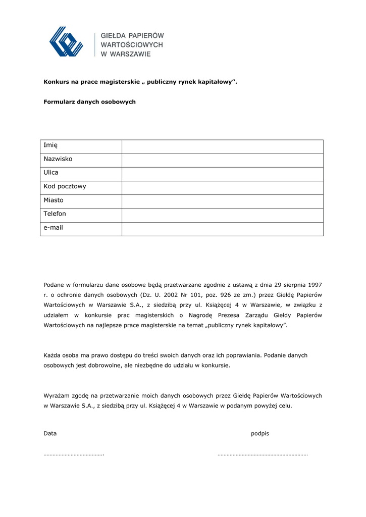 Konkurs na prace magisterskie „ publiczny rynek kapitałowy”. Formularz danych osobowych Imię Nazwisko Ulica Kod pocztowy Miasto Telefon e-mail Podane w formularzu dane osobowe będą przetwarzane zgodnie z ustawą z dnia 29 sierpnia 1997 r. o ochronie danych osobowych (Dz. U. 2002 Nr 101, poz. 926 ze zm.) przez Giełdę Papierów Wartościowych w Warszawie S.A., z siedzibą przy ul. Książęcej 4 w Warszawie, w związku z udziałem w konkursie prac magisterskich o Nagrodę Prezesa Zarządu Giełdy Papierów Wartościowych na najlepsze prace magisterskie na temat „publiczny rynek kapitałowy”. Każda osoba ma prawo dostępu do treści swoich danych oraz ich poprawiania. Podanie danych osobowych jest dobrowolne, ale niezbędne do udziału w konkursie. Wyrażam zgodę na przetwarzanie moich danych osobowych przez Giełdę Papierów Wartościowych w Warszawie S.A., z siedzibą przy ul. Książęcej 4 w Warszawie w podanym powyżej celu. Data …………………………………. podpis ……………………………………………………