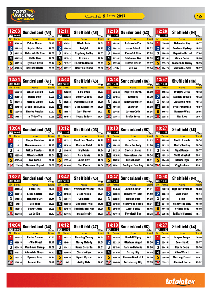 9 12:03 Sunderland (A4) 16-01 531216 450 Pukka Hound 12:11 13-01 28.18 336562 Sheffield (A6) 500 2017 1/5 12:19 Sunderland (A3) 16-02 Black Rosie 30.02 423161 450 12:28 13-02 Ambervale Fox 28.03 566644 Sheffield (D4) 280 Bahamian Sky 16.77 462154 Kaydas Babe 28.00 356456 Twiglet 29.95 214122 Amys Friend 28.02 363344 Goulane Mystery 16.88 634325 Boherash De Niro 28.03 132443 Tagalong Bobby 30.07 614464 Powerful Minx 27.78 566646 Stepaside Razzel 17.04 631354 Slatta Blue 28.08 223563 El Hamis 29.86 643161 Fairholme Diva 28.08 623262 Watch Cobra 16.90 322513 Ryecroft Chris 27.74 241332 Check In Charlie 29.92 133165 Hestors Hound 27.87 655325 Slaneyside Bonny 16.95 461235 Ballinakilldelta 27.88 443152 Barntick Bound 29.88 42114 Mill Ava 27.94 444225 Montana Jewel 16.97 12:34 Sunderland (A1) 16-03 450 12:42 13-03 Witton Galileo 27.80 225252 231614 Dance Dolly 27.70 213164 Meibhs Dream 27.57 434213 Bound Tobe Lenny 553132 541541 655213 Sheffield (A3) 500 12:48 Sunderland (HC) 16-04 Slow Away 29.33 234244 455353 Coney Curious 29.36 412534 Parchments Mac 29.36 27.67 343251 Best Judgement Elusive Russian 27.67 115541 Im Teddy Too 27.68 314634 13:04 Sunderland (A8) 16-05 450 13:12 13-05 261 12:57 13-04 Sheffield (HC) 660 Highfield Hawk 16.80 146355 Droopys Cross 40.42 631655 Evensong 16.70 225465 Rashers Legend 40.32 213243 Macys Monster 16.53 464452 Crossfield Noel 40.13 29.38 411426 Saynatan 16.50 566644 Proper Diamond 40.27 Swift Musket 29.27 361421 Lacken Cutie 16.56 146361 Dancers Wink 39.95 Break Builder 29.41 223115 Crafty Rosso 15.98 332141 War Lord 39.57 Sheffield (D3) 280 13:18 Sunderland (HC) 16-06 640 13:27 13-06 Sheffield (A5) 500 - Macys Madeline 29.12 252341 Head Iton Cheeky 16.75 345515 In Force 41.13 625565 Gaelic Ramble 29.74 4 Glenbrentonmarco 29.13 432616 Marinas Chief 16.68 166144 Stuck For Lolly 41.30 532414 Husky Smokey 29.70 6 Witton Peerless 29.12 244655 My Roisin 16.64 342225 Stretch Limmo 41.11 444352 Night Dancer 29.77 366546 Allowdale Ralf 29.04 344241 Aura Lewis 16.66 422652 Piercestown Jan 40.54 425223 Swift Minstral 29.81 464346 Two Faced 28.72 155514 Alexs Alex 16.38 226251 Erins Blonde 40.81 424544 Interior Style 29.72 255456 Pleasant Report 28.88 441444 Star Power 16.50 225422 Coologue Sea Hag 40.56 242346 Wiggles Lane 29.81 13:32 Sunderland (A5) 16-07 450 13:42 13-07 Sheffield (A5) 500 13:47 Sunderland (HC) 16-08 640 13:58 13-08 Sheffield (D4) 280 441664 Dash Time 28.08 336331 Whinmoor Prancer 29.93 164244 Autumn Actor 41.81 526213 High Performance 16.88 433314 Ellies Gamble 28.34 311522 Class Action 29.87 556365 Tullymurry Team 41.13 332413 Sasa Papin 16.74 541334 Reagrove Girl 28.11 566461 Coldasice 29.94 352231 Singing Cilla 41.23 521535 Scart 16.80 6423 Mill Hugo 28.32 332312 Slaneyside Wiz 30.12 631526 Slaneyside Gooch 40.91 354166 Slaneyside Lizzy 16.79 116554 Clancy Jack 28.38 451516 Paddock Razl Kay 29.86 511533 Ascot Becky 40.46 441362 Citizen Holly 16.58 332463 Ay Up Kim 28.17 324156 Imabarbiegirl 29.98 431113 Ferryforth Sky 40.28 226126 Ballistic Moment 16.71 14:04 Sunderland (A4) 16-09 362453 450 Farloe Compo 14:12 13-09 27.92 413233 Sheffield (A7) 500 14:19 Sunderland (HC) 16-10 Stunning Tommy 30.28 463462 450 14:27 13-10 Limehill Slippy 29.21 515513 Sheffield (A4) 500 Magna Snape 29.49 623615 Is She Diesel 28.12 324661 Mucky Melody 30.59 652126 Glenburn Angel 28.50 554351 Coles Hawk 29.57 654415 Coolbawn Champ 28.08 344152 Kanes Senorita 30.53 263563 Farkland Minnie 28.66 314252 Her In Doors 29.50 443332 Allowdale Eimear 28.15 464645 Ciaraisaflyer 30.19 641654 Daring Lilly 28.19 535435 Allen Wizard 29.31 235223 Dynamo Blue 28.24 666626 Dysert Mystic 30.17 234636 Havana Blackbird 28.06 566566 Mustang Pursuit 29.41 134214 Lahana Star 28.17 536 Arkley Gate 30.47 144246 Gurtnacrehy City 27.85 533521 Shocked Horror 29.52 9 14:33 Sunderland (A3) 16-11 450 14:44 13-11 Move Over Anita 27.94 223211 322623 Mizen Blue 27.83 51 Five Alley Bella 28.01 566513 Ballymartinmolly 515645 Aughall Eske 213242 Ryecroft Leo 143553 15:08 12-01 232535 Windy Blue Rae 6212 Gemmas Poppy 266365 Miracle River 533661 665262 15:47 12-03 16-12 241311 214614 Fast Lane 29.11 343313 Yahoo Ticketyboo 29.20 27.88 254145 Another Rogue 29.12 27.82 566212 Tring Tornado 29.23 27.95 151566 Powerful Trend 29.18 15:18 02-01 Crayford (A8) 380 2/5 14:51 Sunderland (A1) 28.99 400 Forge Magpie 500 Russelena Star Romford (A7) 621642 Sheffield (A2) 2017 450 14:58 13-12 Sheffield (A4) 500 Eden Rex 27.67 345631 121312 Fast Blond 27.68 125123 Scruffs Joy 29.77 341561 Fortune Rebel 27.67 645222 Blackrose Elvis 29.45 631653 Darlo Wallsy 27.57 353324 Blackrose Khan 29.57 333262 Alanna Mo Chroi 27.53 322143 West Of Dromin 29.53 521341 Boy Lee 27.58 524641 Shotgun Slade 29.38 15:27 12-02 15:37 Romford (A6) 400 02-02 Corrin Josie 29.64 Crayford (A8) 380 313656 Isle Of Gold 24.30 541121 Volcanic Panther 24.88 356666 Ferryforth Style 24.12 24.70 64532 Beckys Briony 24.40 326225 Rivel Romeo 24.75 353244 Razmataz Dazl 24.39 25.14 666441 Deran Trader 24.36 543632 Fahy Lola 24.71 266246 Copeland Zip 24.29 25.04 44445 Rathdown Ruby 24.31 166561 Itsur Mistress 24.85 626536 Tintreach Holly 24.44 Senor Bob 24.65 655524 Photoslimthesis 24.48 3 Brookside Rocks 24.94 664535 Lemming Womble 24.21 Fourtwofour 24.96 666556 Jaxx Sundaetreat 24.08 3 Profound 25.01 635546 Guarantedmaster 24.22 24.89 15:57 Romford (A1) 400 02-03 Crayford (A7) 380 16:07 12-04 16:17 Romford (A5) 400 02-04 Crayford (S6) 540 243612 Special Quattro 24.54 235216 Rising Bullet 24.31 133 Chosenonaspin 24.84 264133 Hollyhillcronody 34.86 662316 Young Romeo 24.28 655314 Ascot Daisy 24.21 331216 Bridgeway Star 24.71 341214 Darkcat Jo 34.61 522421 Brookside Lady 24.33 663132 Gunner George 24.23 245422 Carry Duff 24.80 213312 Bimbam Priscilla 34.54 515555 Ruby Wharf 24.27 214344 Jaxx White Widow 24.15 1 Genuine Bubbles 24.80 121413 Nellies Jet 34.85 153465 Never Said Aword 24.44 365126 Fiftyfourkay 24.13 246155 Corinthians Gogo 24.57 332551 Seven Kingdoms 3
