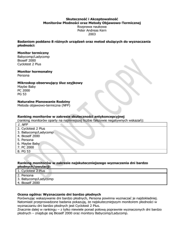 Skuteczność i Akceptowalność Monitorów Płodności oraz Metody Objawowo-Termicznej Rozprawa naukowa Peter Andreas Kern 2003 Badaniom poddano 8 różnych urządzeń oraz metod służących do wyznaczania płodności: Monitor termiczny Babycomp/Ladycomp Bioself 2000 Cyclotest 2 Plus Monitor hormonalny Persona Mikroskop obserwujący śluz szyjkowy Maybe Baby PC 2000 PG 53 Naturalne Planowanie Rodziny Metoda objawowo-termiczna (NFP) Ranking monitorów w zakresie skuteczności antykoncepcyjnej (ranking monitorów oparty na najmniejszej liczbie fałszywie negatywnych wskazań): 1. NFP 2. 3. 4. 5. 6. 7. 8. Cyclotest 2 Plus Babycomp/Ladycomp Bioself 2000 Persona Maybe Baby PC 2000 PG 53 Ranking monitorów w zakresie najskuteczniejszego wyznaczenia dni bardzo płodnych/owulacji: 1. Cyclotest 2 Plus 2. Persona 3. Babycomp/Ladycomp 4. Bioself 2000 Ocena ogólna: Wyznaczanie dni bardzo płodnych Porównując wskazywanie dni bardzo płodnych, Persona powinna wyznaczać je najdokładniej. Natomiast przeprowadzone badania pokazują, że najskuteczniejszym monitorem płodności w wyznaczaniu dni bardzo płodnych jest Cyclotest 2 Plus. Znacznie dalej w rankingu – z tylko niewiele ponad połową poprawnie wyznaczonych dni bardzo płodnych – znajduje się Bioself 2000 oraz monitory Babycomp/Ladycomp. W oparciu o ten ranking Cyclotest2plus>Babycomp/Ladycomp>Bioself 2000, monitory termiczne prezentowały następującą ilość fałszywie negatywnych wskazań: 1.7 %, 4.7 % oraz 7.5 % (lub inaczej prawdopodobieństwo poczęcia wyniosło odpowiednio ok. 0.015, 0.036 i 0.045), a zatem ich skuteczność antykoncepcyjna była różna. W grupie wszystkich monitorów płodności Persona wykazała znacznie wyższe prawdopodobieństwo poczęcia wynoszące 0.168. Ten wynik różni się znacząco od tego podawanego w literaturze dotyczącej skuteczności antykoncepcyjnej monitora Persona. Podsumowując, monitory płodności są akceptowane przez uczestniczki badania przede wszystkim jako urządzenia służące zajściu w ciążę. Wśród respondentek cały czas istnieje jeszcze pewien brak zaufania do takiej technologii stosowanej do antykoncepcji, chociaż, na przykład, monitor Cyclotest 2 Plus prezentuje naprawdę wysoki poziom skuteczności. Rozwijając i stosując nowe technologie w zakresie antykoncepcji, korzystne wydaje się podejście, w którym w/w monitory będą mogły w swoich analizach ujmować więcej niż tylko jeden wskaźnik płodności. Ponieważ, oprócz Cyclotest 2 Plus, testowane monitory analizują tylko jeden wskaźnik płodności, nie osiągają wysokiej skuteczności antykoncepcyjnej na podstawie metody objawowotermicznej.