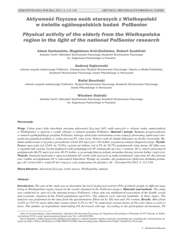 GERONTOLOGIA POLSKA 2013, 4, 113-118 ARTYKUŁ ORYGINALNY/ORIGINAL PAPER Aktywnoœć fizyczna osób starszych z Wielkopolski w œwietle ogólnopolskich badań PolSenior Physical activity of the elderly from the Wielkopolska region in the light of the national PolSenior research Adam Kantanista, Magdalena Król-Zielińska, Robert Szeklicki Katedra Teorii i Metodyki Wychowania Fizycznego Akademii Wychowania Fizycznego im. Eugeniusza Piaseckiego w Poznaniu Andrzej Dąbrowski członek zespołu badawczego PolSenior, Zamiejscowy Wydział Wychowania Fizycznego i Sportu w Białej Podlaskiej, Akademii Wychowania Fizycznego Józefa Piłsudskiego w Warszawie Rafał Rowiński członek zespołu badawczego PolSenior, Wydział Wychowania Fizycznego Akademii Wychowania Fizycznego Józefa Piłsudskiego w Warszawie Wiesław Osiński Katedra Teorii i Metodyki Wychowania Fizycznego Akademii Wychowania Fizycznego im. Eugeniusza Piaseckiego w Poznaniu Streszczenie Wstęp. Celem pracy było określenie poziomu aktywności fizycznej (AF) osób starszych w różnym wieku zamieszkałych w Wielkopolsce w oparciu o wyniki zebrane w ramach projektu PolSenior. Materiał i metody. Badania przeprowadzono w ramach ogólnopolskiego projektu PolSenior, którego celem była wielostronna ocena sytuacji zdrowotnej, społecznej i ekonomicznej populacji polskiej w wieku powyżej 65. roku życia. Doboru osób do badań dokonano na drodze losowania. Badania analizowane w tej pracy prowadzono wśród 202 mężczyzn i 161 kobiet za pomocą sondażu diagnostycznego. Wyniki. Badani mężczyźni (od 12,6% do 75,0%) częściej niż kobiety (od 4,3% do 56,7%) podejmowali różne formy AF kilka razy w tygodniu lub częściej. Liczba badanych osób podejmujących AF zmniejszała się wraz z wiekiem. AF w celach zdrowotnych podejmowało 66,2% mężczyzn oraz 49,1% kobiet, a za poradą lekarza jedynie niespełna dziesięć procent kobiet i mężczyzn. Wnioski. Istotnymi barierami w upowszechnianiu AF wśród osób starszych są mała świadomość znaczenia AF dla zdrowia oraz rzadkie uwzględnianie AF w zaleceniach lekarskich. Wydaje się zasadne, aby podejmować efektywne działania promujące AF wśród osób w wieku 65 lat i więcej w celu zwiększania ich udziału w AF. (Gerontol Pol 2013, 4, 113-118) Słowa kluczowe: aktywność fizyczna, osoby starsze, Wielkopolska, ankieta Abstract Introduction. The aim of the study was to determine the level of physical activity (PA) of elderly people in different ages living in Wielkopolska region, based on the results obtained in the PolSenior project. Materials and methods. The study was conducted as part of a the national project PolSenior, whose aim was multilateral assessment of the health, social and economic situation of the Polish population aged 65+. The subjects were selected randomly in three stages. The analysis was performed on the data from the questionnaires filled out by 202 men and 161 women. Results. Men (from 12.6% to 75.0 %) more often than women (from 4.3% to 56.7 %) undertook various forms of PA a few times a week or more. The number of respondents undertaking PA decreased with age. According to the participants declarations, PA Adres do korespondencji: Adam Kantanista; Akademia Wychowania Fizycznego im. Eugeniusza Piaseckiego w Poznaniu; 61-871 Poznań, ul. Królowej Jadwigi 27/39; e-mail: [email protected]; Tel.: +48 618355204 Nazwa projektu i źródło finansowania: Badania prowadzono w ramach projektu Aspekty medyczne, psychologiczne, socjologiczne i ekonomiczne starzenia się ludzi w Polsce (PolSenior), nr PBZ-MEiN-9/2/2006, finansowanego przez Ministerstwo Nauki i Szkolnictwa Wyższego Ó Akademia Medycyny 114 ADAM KANTANISTA I IN. for health was undertaken by 66.2% men and 49.1% women, and as a result of the doctor’s advice - only by less than 10% of women and men. Conclusions. Significant barriers to the dissemination of PA among elderly/senior people are little awareness of the importance of PA for health and rare consideration of PA in the doctor’s recommendations. It seems to be justified to promote effectively PA among people aged 65+ to increase their participation in PA. (Gerontol Pol 2013, 4, 113-118) Key words: physical activity, the elderly, Wielkopolska, questionnaire Wstęp Osobom starszym zaleca się podejmowanie umiarkowanej aktywności fizycznej (AF) przez co najmniej 30 minut 5 dni w tygodniu lub o znacznej intensywności przynajmniej 20 minut 3 dni w tygodniu. Ponadto istotne znaczenie dla tej grupy ma trening oporowy (siłowy) oraz ćwiczenia poprawiające koordynację ruchową, które ograniczają ryzyko upadków [1]. WHO [2] rekomenduje podobny poziom AF, zalecając minimum 150 minut umiarkowanej AF w tygodniu lub 75 minut AF o większej intensywności. Badania wskazują jednak na niski poziom AF osób starszych w polskim społeczeństwie. W ogólnopolskich badaniach AF osób starszych obserwowano, że rekreacyjną AF kilka razy w tygodniu podejmuje 12,0% kobiet i 19,2% mężczyzn, a ponad 60% osób starszych nie podejmuje jej wcale [3]. Piątkowska [4] w badaniach AF polskiej populacji za pomocą Międzynarodowego Kwestionariusza Aktywności Fizycznej wykazywała, że wśród osób starszych (60 lat i więcej) 49,3% charakteryzowało się niskim, 33,8% umiarkowanym, a 16,9% wysokim poziomem AF. Z przeglądu badań Sun, Norman i While [5] oceniających poziom AF ludzi starszych, w takich krajach, jak USA, Australia, Wielka Brytania, Brazylia, Chiny, Kanada, Nowa Zelandia, Kolumbia, Południowa Afryka, Cypr, Szwecja oraz Szwajcaria wynikało, że pożądany poziom AF spełniało od 2,4% do 83,0% badanych. Wen i współ. [6] w długofalowych, 8 - letnich badaniach wykazali, że 15 minut dziennie lub 90 minut tygodniowo umiarkowanej do intensywnej AF może być korzystne dla zdrowia, także u osób z ryzykiem chorób krążeniowo-oddechowych. U osób, które podejmowały AF w zalecanym wymiarze, w porównaniu z osobami nieaktywnymi fizycznie, obser