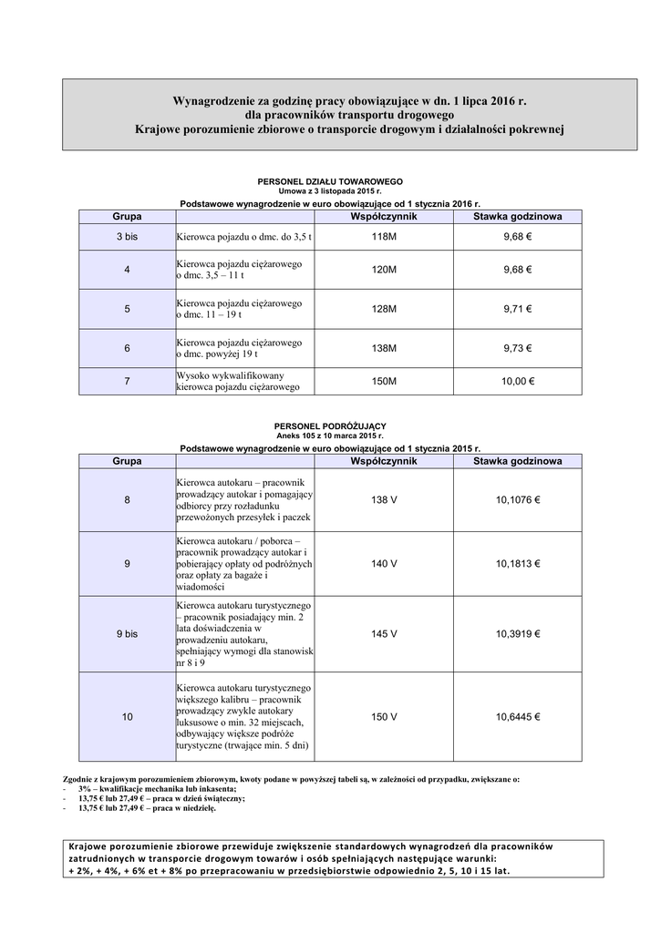 Wynagrodzenie za godzinę pracy obowiązujące w dn. 1 lipca 2016 r. dla pracowników transportu drogowego Krajowe porozumienie zbiorowe o transporcie drogowym i działalności pokrewnej PERSONEL DZIAŁU TOWAROWEGO Umowa z 3 listopada 2015 r. Podstawowe wynagrodzenie w euro obowiązujące od 1 stycznia 2016 r. Współczynnik Stawka godzinowa Kierowca pojazdu o dmc. do 3,5 t 118M 9,68 € 4 Kierowca pojazdu ciężarowego o dmc. 3,5 – 11 t 120M 9,68 € 5 Kierowca pojazdu ciężarowego o dmc. 11 – 19 t 128M 9,71 € 6 Kierowca pojazdu ciężarowego o dmc. powyżej 19 t 138M 9,73 € 7 Wysoko wykwalifikowany kierowca pojazdu ciężarowego 150M 10,00 € Grupa 3 bis PERSONEL PODRÓŻUJĄCY Aneks 105 z 10 marca 2015 r. Podstawowe wynagrodzenie w euro obowiązujące od 1 stycznia 2015 r. Współczynnik Stawka godzinowa 8 Kierowca autokaru – pracownik prowadzący autokar i pomagający odbiorcy przy rozładunku przewożonych przesyłek i paczek 138 V 10,1076 € 9 Kierowca autokaru / poborca – pracownik prowadzący autokar i pobierający opłaty od podróżnych oraz opłaty za bagaże i wiadomości 140 V 10,1813 € 9 bis Kierowca autokaru turystycznego – pracownik posiadający min. 2 lata doświadczenia w prowadzeniu autokaru, spełniający wymogi dla stanowisk nr 8 i 9 145 V 10,3919 € 10 Kierowca autokaru turystycznego większego kalibru – pracownik prowadzący zwykle autokary luksusowe o min. 32 miejscach, odbywający większe podróże turystyczne (trwające min. 5 dni) 150 V 10,6445 € Grupa Zgodnie z krajowym porozumieniem zbiorowym, kwoty podane w powyższej tabeli są, w zależności od przypadku, zwiększane o: 3% – kwalifikacje mechanika lub inkasenta; 13,75 € lub 27,49 € – praca w dzień świąteczny; 13,75 € lub 27,49 € – praca w niedzielę. Krajowe porozumienie zbiorowe przewiduje zwiększenie standardowych wynagrodzeń dla pracowników zatrudnionych w transporcie drogowym towarów i osób spełniających następujące warunki: + 2%, + 4%, + 6% et + 8% po przepracowaniu w przedsiębiorstwie odpowiednio 2, 5, 10 i 15 lat. Szczegółowa klasyfikacja rodzajów posad, pozwalająca na przyporządkowanie pracownika oddelegowanego do Francji do konkretnego współczynnika, jest dostępna na stronie internetowej légifrance pod poniższymi linkami: Transport drogowy towarów: https://www.legifrance.gouv.fr/affichIDCCArticle.do;jsessionid=556C0CFD0C4B7A069F7CB8FC38 C5E904.tpdjo16v_2? idArticle=KALIARTI000005849453&cidTexte=KALITEXT000005678897&dateTexte=20051212&ca tegorieLien=id Transport drogowy osób: https://www.legifrance.gouv.fr/affichIDCCArticle.do;jsessionid=39B3F52891FDBCF05DBB504D8C 19CAB5.tpdjo01v_3? idArticle=KALIARTI000005849460&cidTexte=KALITEXT000005678897&dateTexte=29990101&ca tegorieLien=id