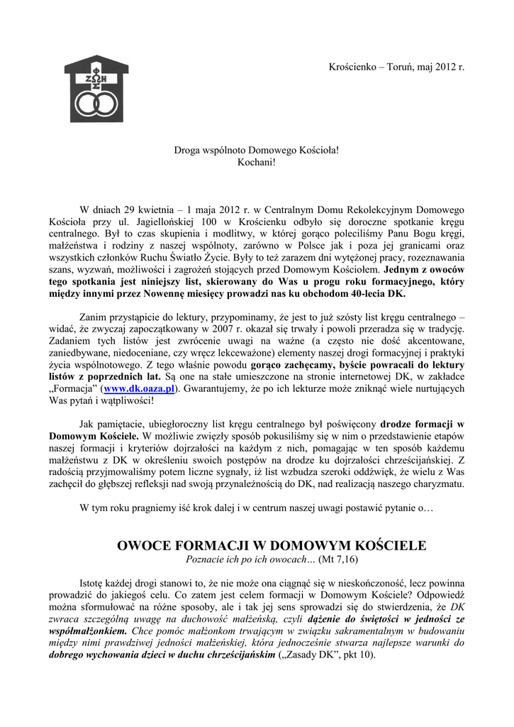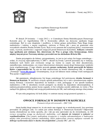 Krościenko – Toruń, maj 2012 r. Droga wspólnoto Domowego Kościoła! Kochani! W dniach 29 kwietnia – 1 maja 2012 r. w Centralnym Domu Rekolekcyjnym Domowego Kościoła przy ul. Jagiellońskiej 100 w Krościenku odbyło się doroczne spotkanie kręgu centralnego. Był to czas skupienia i modlitwy, w której gorąco poleciliśmy Panu Bogu kręgi, małżeństwa i rodziny z naszej wspólnoty, zarówno w Polsce jak i poza jej granicami oraz wszystkich członków Ruchu Światło Życie. Były to też zarazem dni wytężonej pracy, rozeznawania szans, wyzwań, możliwości i zagrożeń stojących przed Domowym Kościołem. Jednym z owoców tego spotkania jest niniejszy list, skierowany do Was u progu roku formacyjnego, który między innymi przez Nowennę miesięcy prowadzi nas ku obchodom 40-lecia DK. Zanim przystąpicie do lektury, przypominamy, że jest to już szósty list kręgu centralnego – widać, że zwyczaj zapoczątkowany w 2007 r. okazał się trwały i powoli przeradza się w tradycję. Zadaniem tych listów jest zwrócenie uwagi na ważne (a często nie dość akcentowane, zaniedbywane, niedoceniane, czy wręcz lekceważone) elementy naszej drogi formacyjnej i praktyki życia wspólnotowego. Z tego właśnie powodu gorąco zachęcamy, byście powracali do lektury listów z poprzednich lat. Są one na stałe umieszczone na stronie internetowej DK, w zakładce „Formacja” (www.dk.oaza.pl). Gwarantujemy, że po ich lekturze może zniknąć wiele nurtujących Was pytań i wątpliwości! Jak pamiętacie, ubiegłoroczny list kręgu centralnego był poświęcony drodze formacji w Domowym Kościele. W możliwie zwięzły sposób pokusiliśmy się w nim o przedstawienie etapów naszej formacji i kryteriów dojrzałości na każdym z nich, pomagając w ten sposób każdemu małżeństwu z DK w określeniu swoich postępów na drodze ku dojrzałości chrześcijańskiej. Z radością przyjmowaliśmy potem liczne sygnały, iż list wzbudza szeroki oddźwięk, że wielu z Was zachęcił do głębszej refleksji nad swoją przynależnością do DK, nad realizacją naszego charyzmatu. W tym roku pragniemy iść krok dalej i w centrum naszej uwagi postawić pytanie o… OWOCE FORMACJI W DOMOWYM KOŚCIELE Poznacie ich po ich owocach… (Mt 7,16) Istotę każdej drogi stanowi to, że nie może ona ciągnąć się w nieskończoność, lecz powinna prowadzić do jakiegoś celu. Co zatem jest celem formacji w Domowym Kościele? Odpowiedź można sformułować na różne sposoby, ale i tak jej sens sprowadzi się do stwierdzenia, że DK zwraca szczególną uwagę na duchowość małżeńską, czyli dążenie do świętości w jedności ze współmałżonkiem. Chce pomóc małżonkom trwającym w związku sakramentalnym w budowaniu między nimi prawdziwej jedności małżeńskiej, która jednocześnie stwarza najlepsze warunki do dobrego wychowania dzieci w duchu chrześcijańskim („Zasady DK”, pkt 10). W obliczu współczesnych wyzwań, w dobie dotkliwego kryzysu małżeństwa i rodziny, tak postawiony cel: świętość obojga małżonków oraz skuteczny katechumenat rodzinny, jawi się jako trafna diagnoza choroby toczącej dzisiejsze społeczeństwa i narody, jako ambitny, ale możliwy do wykonania program, pozwalający żonom i mężom… - we wzajemnej jedności zrealizować powołanie do świętości (Bądźcie świętymi, bo jestem święty, Pan Bóg wasz! Por. Kpł 19,2); - przekazać we współpracy ze Stwórcą życie i poprowadzić swoje dzieci ku dojrzałej wierze, wychowując je na dobrych chrześcijan i obywateli; - a ostatecznie osiągnąć najważniejszy cel życia: zbawienie wieczne (wszak nasza ojczyzna jest w niebie – por. Flp 3,20). A wy za kogo Mnie uważacie? (Mt 16,15) Powiedzmy sobie jednak jasno: aby tak się stało, nie wystarczą same dobre chęci, nie wystarczą lata formowania się na drodze Domowego Kościoła, nie wystarczy bogata lista pełnionych posług, przeprowadzonych akcji ewangelizacyjnych, przeżytych rekolekcji, wygłoszonych świadectw, podjętych postów... Oczywiście, to wszystko jest ważne, ale ma sens tylko wówczas, gdy wypływa z żywej, osobistej relacji z Jezusem Chrystusem i zakorzenienia w Jego Kościele. Trzeba przeżyć spotkanie z Jezusem; uwierzyć Mu i iść za Nim. Trzeba uznać Go za Pana i Zbawiciela; nie tylko ustami, lecz również postępowaniem, a zatem w wymiarze życiowych wyborów, uczynków. Trzeba wpuścić Go we wszystkie wymiary naszego życia: w małżeństwo, w rodzinę (katechumenat), w pracę zawodową, w zaangażowanie w życie publiczne, w służbę we wspólnocie, w radowanie się zdrowiem, cierpliwe znoszenie choroby, w młodość, w wiek dojrzały, w niełatwą starość, w podejmowane decyzje, w troski materialne, w życiowe zwycięstwa i porażki. Zwłaszcza ten ostatni wymiar, wymiar cierpliwego, pełnego wiary niesienia krzyża stanowi najlepszy sprawdzian dojrzałości naszej wiary. Bo nie da się iść za Jezusem bez podążenia drogą krzyża, bez zaakceptowania krzyża, bez pogodzenia się z krzyżem, bez przylgnięcia do krzyża, co więcej: bez ukochania krzyża jako tego miejsca, w którym jesteśmy najbliżej Jezusa. On mówi jasno: Kto nie bierze swego krzyża, a idzie za Mną, nie jest Mnie godzien (Mt 10,38). Doprowadzając tę myśl do końca, trzeba stwierdzić, że bez krzyża nie ma zmartwychwstania. A zatem, kochani, stajemy po raz kolejny wobec tych fundamentalnych pytań, tyle razy już usłyszanych w naszej „przeszłości oazowej”, że uległy ono pewnemu „wyświechtaniu”, „rozmiękczeniu”, „oswojeniu”; że słysząc je, nie zawsze zdajemy sobie sprawę z ich wagi: Kim jest dla nas Jezus Chrystus? Czy na pewno naszym Panem i Zbawicielem? Czy jest Jedynym, któremu ufamy, bez względu na to, co nas spotyka w życiu? Czy jest drogocenną perłą (por. Mt 13,46) - Tym, dla którego gotowi jesteśmy poświęcić wszystko inne? Twierdząca odpowiedź na powyższe pytania oz