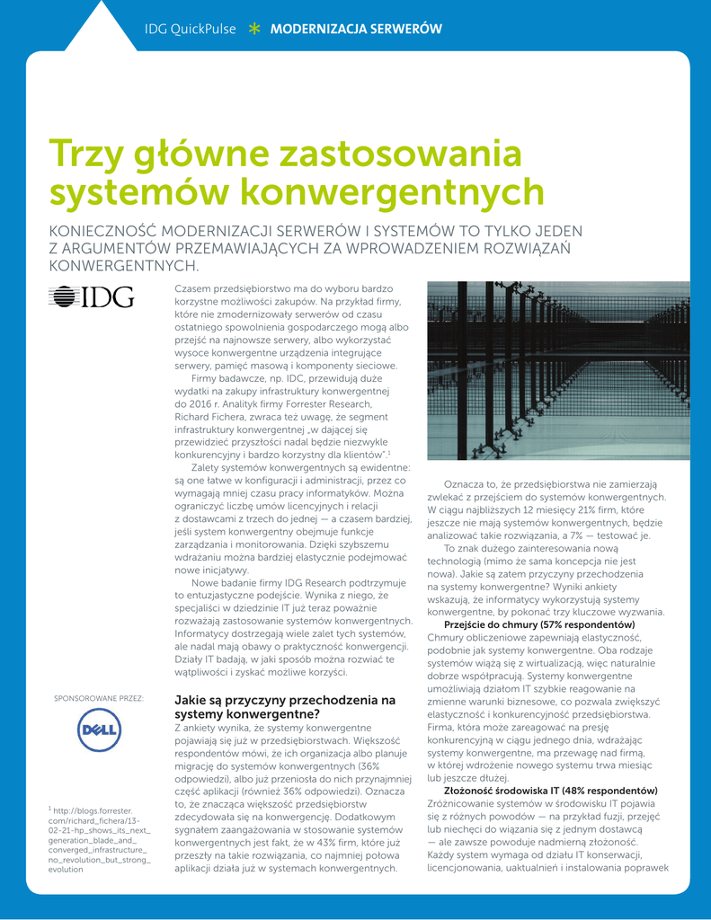 IDG QuickPulse * MODERNIZACJA SERWERÓW Trzy główne zastosowania systemów konwergentnych KONIECZNOŚĆ MODERNIZACJI SERWERÓW I SYSTEMÓW TO TYLKO JEDEN Z ARGUMENTÓW PRZEMAWIAJĄCYCH ZA WPROWADZENIEM ROZWIĄZAŃ KONWERGENTNYCH. Czasem przedsiębiorstwo ma do wyboru bardzo korzystne możliwości zakupów. Na przykład firmy, które nie zmodernizowały serwerów od czasu ostatniego spowolnienia gospodarczego mogą albo przejść na najnowsze serwery, albo wykorzystać wysoce konwergentne urządzenia integrujące serwery, pamięć masową i komponenty sieciowe. Firmy badawcze, np. IDC, przewidują duże wydatki na zakupy infrastruktury konwergentnej do 2016 r. Analityk firmy Forrester Research, Richard Fichera, zwraca też uwagę, że segment infrastruktury konwergentnej „w dającej się przewidzieć przyszłości nadal będzie niezwykle konkurencyjny i bardzo korzystny dla klientów”.1 Zalety systemów konwergentnych są ewidentne: są one łatwe w konfiguracji i administracji, przez co wymagają mniej czasu pracy informatyków. Można ograniczyć liczbę umów licencyjnych i relacji z dostawcami z trzech do jednej — a czasem bardziej, jeśli system konwergentny obejmuje funkcje zarządzania i monitorowania. Dzięki szybszemu wdrażaniu można bardziej elastycznie podejmować nowe inicjatywy. Nowe badanie firmy IDG Research podtrzymuje to entuzjastyczne podejście. Wynika z niego, że specjaliści w dziedzinie IT już teraz poważnie rozważają zastosowanie systemów konwergentnych. Informatycy dostrzegają wiele zalet tych systemów, ale nadal mają obawy o praktyczność konwergencji. Działy IT badają, w jaki sposób można rozwiać te wątpliwości i zyskać możliwe korzyści. SPONSOROWANE PRZEZ: 1 http://blogs.forrester. com/richard_fichera/1302-21-hp_shows_its_next_ generation_blade_and_ converged_infrastructure_ no_revolution_but_strong_ evolution Jakie są przyczyny przechodzenia na systemy konwergentne? Z ankiety wynika, że systemy konwergentne pojawiają się już w przedsiębiorstwach. Większość respondentów mówi, że ich organizacja albo planuje migrację do systemów konwergentnych (36% odpowiedzi), albo już przeniosła do nich przynajmniej część aplikacji (również 36% odpowiedzi). Oznacza to, że znacząca większość przedsiębiorstw zdecydowała się na konwergencję. Dodatkowym sygnałem zaangażowania w stosowanie systemów konwergentnych jest fakt, że w 43% firm, które już przeszły na takie rozwiązania, co najmniej połowa aplikacji działa już w systemach konwergentnych. Oznacza to, że przedsiębiorstwa nie zamierzają zwlekać z przejściem do systemów konwergentnych. W ciągu najbliższych 12 miesięcy 21% firm, które jeszcze nie mają systemów konwergentnych, będzie analizować takie rozwiązania, a 7% — testować je. To znak dużego zainteresowania nową technologią (mimo że sama koncepcja nie jest nowa). Jakie są zatem przyczyny przechodzenia na systemy konwergentne? Wyniki ankiety wskazują, że informatycy wykorzystują systemy konwergentne, by pokonać trzy kluczowe wyzwania. Przejście do chmury (57% respondentów) Chmury obliczeniowe zapewniają elastyczność, podobnie jak systemy konwergentne. Oba rodzaje systemów wiążą się z wirtualizacją, więc naturalnie dobrze współpracują. Systemy konwergentne umożliwiają działom IT szybkie reagowanie na zmienne warunki biznesowe, co pozwala zwiększyć elastyczność i konkurencyjność przedsiębiorstwa. Firma, która może zareagować na presję konkurencyjną w ciągu jednego dnia, wdrażając systemy konwergentne, ma przewagę nad firmą, w której wdrożenie nowego systemu trwa miesiąc lub jeszcze dłużej. Złożoność środowiska IT (48% respondentów) Zróżnicowanie systemów w środowisku IT pojawia się z różnych powodów — na przykład fuzji, przejęć lub niechęci do wiązania się z jednym dostawcą — ale zawsze powoduje nadmierną złożoność. Każdy system wymaga od działu IT konserwacji, licencjonowania, uaktualnień i instalowania poprawek IDG QuickPulse * MODERNIZACJA SERWERÓW większe koszty (41% respondentów), że uruchamianie nowych systemów trwa zbyt długo (34%) i że trudno jest dotrzymać kroku wymaganiom biznesowym (33%). Spodziewane lub uzyskane korzyści z zastosowania systemów konwergentnych Większa wydajność systemów IT 60% Większa elastyczność przy przy mniejszych zasobach sprzętowych 59% Oszczędności wynikające z integracji Przyspieszenie wdrażania rozwiązań IT jako usług 53% 50% Łatwość wirtualizacji 45% Poprawa jakości usług IT 45% Większa automatyzacja ŹRÓDŁO: IDG Research Services 43% zabezpieczeń. Respondenci szukają sposobów na zmniejszenie złożoności. Wykorzystanie zasobów (47% respondentów) Ta kwestia dotyczy zarówno zasobów sprzętowych, jak i kadrowych. Systemy konwergentne są łatwiejsze w zarządzaniu, więc zajmują pracownikom mniej czasu. Są też lepiej skonsolidowane i zintegrowane, więc zużywają mniej zasobów sprzętowych. Respondenci podają też inne przyczyny. Zauważają, że odizolowane systemy powodują Rozwiązania Dell PowerEdge FX ułatwiają wprowadzenie konwergencji Rozwiązanie konwergentne Dell PowerEdge FX pozwala firmom nie tylko dopasowywać infrastrukturę IT do konkretnych zadań, ale również skalować ją odpowiednio do zmieniających się potrzeb biznesowych. Jego modułowa obudowa 2U montowana w szafie serwerowej umożliwia połączenie wydajności modułów kasetowych z prostotą systemów montowanych w szafie serwerowej. Obudowa PowerEdge FX2 mieści nadmiarowe moduły sieciowe passthrough, w tym moduły wejścia/wyjścia Gigabit Ethernet lub 10 Gigabit Ethernet. Inne moduły agregujące ułatwiają administratorom sieci dodawanie nowych funkcji, uproszczenie fizycznej struktury okablowania i zmniejszenie złożoności przełączania ruchu wychodzącego. Obudowa PowerEdge FX2 zwiększa sprawność pracy dzięki współużytkowanej archit