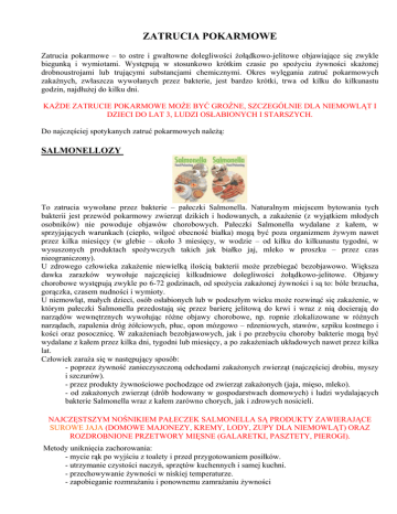 ZATRUCIA POKARMOWE Zatrucia pokarmowe – to ostre i gwałtowne dolegliwości żołądkowo-jelitowe objawiające się zwykle biegunką i wymiotami. Występują w stosunkowo krótkim czasie po spożyciu żywności skażonej drobnoustrojami lub trującymi substancjami chemicznymi. Okres wylęgania zatruć pokarmowych zakaźnych, zwłaszcza wywołanych przez bakterie, jest bardzo krótki, trwa od kilku do kilkunastu godzin, najdłużej do kilku dni. KAŻDE ZATRUCIE POKARMOWE MOŻE BYĆ GROŹNE, SZCZEGÓLNIE DLA NIEMOWLĄT I DZIECI DO LAT 3, LUDZI OSŁABIONYCH I STARSZYCH. Do najczęściej spotykanych zatruć pokarmowych należą: SALMONELLOZY To zatrucia wywołane przez bakterie – pałeczki Salmonella. Naturalnym miejscem bytowania tych bakterii jest przewód pokarmowy zwierząt dzikich i hodowanych, a zakażenie (z wyjątkiem młodych osobników) nie powoduje objawów chorobowych. Pałeczki Salmonella wydalane z kałem, w sprzyjających warunkach (ciepło, wilgoć obecność białka) mogą być poza organizmem żywym nawet przez kilka miesięcy (w glebie – około 3 miesięcy, w wodzie – od kilku do kilkunastu tygodni, w wysuszonych produktach spożywczych takich jak białko jaj, mleko w proszku – przez czas nieograniczony). U zdrowego człowieka zakażenie niewielką ilością bakterii może przebiegać bezobjawowo. Większa dawka zarazków wywołuje najczęściej kilkudniowe dolegliwości żołądkowo-jelitowe. Objawy chorobowe występują zwykle po 6-72 godzinach, od spożycia zakażonej żywności i są to: bóle brzucha, gorączka, czasem nudności i wymioty. U niemowląt, małych dzieci, osób osłabionych lub w podeszłym wieku może rozwinąć się zakażenie, w którym pałeczki Salmonella przedostają się przez barierę jelitową do krwi i wraz z nią docierają do narządów wewnętrznych wywołując różne objawy chorobowe, np. ropnie zlokalizowane w różnych narządach, zapalenia dróg żółciowych, płuc, opon mózgowo – rdzeniowych, stawów, szpiku kostnego i kości oraz posocznicę. W zakażeniach bezobjawowych, jak i po przebyciu choroby bakterie mogą być wydalane z kałem przez kilka dni, tygodni lub miesięcy, a po zakażeniach układowych nawet przez kilka lat. Człowiek zaraża się w następujący sposób: - poprzez żywność zanieczyszczoną odchodami zakażonych zwierząt (najczęściej drobiu, myszy i szczurów). - przez produkty żywnościowe pochodzące od zwierząt zakażonych (jaja, mięso, mleko). - od zakażonych zwierząt (drób hodowany w gospodarstwach domowych) i ludzi wydalających bakterie Salmonella wraz z kałem zarówno chorych, jak i zdrowych nosicieli. NAJCZĘSTSZYM NOŚNIKIEM PAŁECZEK SALMONELLA SĄ PRODUKTY ZAWIERAJĄCE SUROWE JAJA (DOMOWE MAJONEZY, KREMY, LODY, ZUPY DLA NIEMOWLĄT) ORAZ ROZDROBNIONE PRZETWORY MIĘSNE (GALARETKI, PASZTETY, PIEROGI). Metody uniknięcia zachorowania: - mycie rąk po wyjściu z toalety i przed przygotowaniem posiłków. - utrzymanie czystości naczyń, sprzętów kuchennych i samej kuchni. - przechowywanie żywności w niskiej temperaturze. - zapobieganie rozmrażaniu i ponownemu zamrażaniu żywności - wydzielenie miejsca w lodówce na surowy drób, mięso, jaja tak, aby nie stykały się z innymi produktami - całkowite rozmrożenie drobiu, mięsa, ryb i ich przetworów przed przystąpieniem do smażenia, pieczenia i gotowania. - poddanie żywności działaniu wysokiej temperatury (gotowanie, pieczenie, duszenie), które jest najłatwiejszym sposobem niszczenia bakterii. - unikanie lodów i ciastek pochodzących od nieznanych wytwórców i przygodnych sprzedawców. UWAGA! MYCIE I PARZENIE JAJ JEST ZABIEGIEM CAŁKOWICIE NIESKUTECZNYM, NISZCZY BAKTERIE TYLKO NA POWIERZCHNI SKORUPKI, PODCZAS GDY POWODEM ZATRUĆ SĄ BAKTERIE OBECNE WEWNĄTRZ JAJKA. GRONKOWCOWE ZATRUCIA POKARMOWE Gronkowce (Staphylococcus aureus) – bakterie wywołujące to zatrucie, występują powszechnie w przyrodzie i szybko rozmnażają się w produktach uprzednio ugotowanych. Objawy chorobowe występują zwykle po 2-6 godzinach od spożycia zakażonej żywności. Gronkowcowe zatrucie pokarmowe charakteryzuje się gwałtownymi wymiotami, biegunką, bólami brzucha, nudnościami, zimnymi potami oraz uczuciem osłabienia. Metody uniknięcia zachorowania: - przestrzeganie czystości i zasad higieny - odsuwanie od produkcji żywności osób chorych (nieżyty gardła, nosa, ropne zmiany na rękach) - przechowywanie produktów w niskiej temperaturze ZATRUCIA JADEM KIEŁBASIANYM Jad kiełbasiany to bardzo silna toksyna produkowana przez bakterie beztlenowe. Naturalnym środowiskiem bytowania tych bakterii jest ziemia. Środki spożywcze zanieczyszczone ziemią i nieodpowiednio przechowywane stanowią doskonałą pożywkę dla rozwoju drobnoustrojów. Źródłem zatrucia są najczęściej konserwy jarzynowe, mięsne, rybne oraz mięso wędzone i peklowane. Pokarm zawierający jad kiełbasiany ma często zapach zjełczałego tłuszczu i zawiera duże ilości gazu, który powoduje wydymanie puszek. Zdarza się również, że zakażony pokarm na pozór nie budzi zastrzeżeń, dlatego też dla pewności wskazane jest gotowanie konserw przez co najmniej 10 minut. Objawy kliniczne po zatruciu występują zwykle po 18-96 godzinach od spożycia zakażonego pokarmu. Pierwszymi objawami zatrucia są zaburzenia widzenia (podwójne i zamglone widzenie), następnie opadanie powiek, trudności w przełykaniu i wymowie, ślinotok. Objawy ze strony układu pokarmowego są niewielkie, może wystąpić porażenie perystaltyki jelit, bóle brzucha, zaparcia, wymioty. Gorączka zazwyczaj nie występuje a chory jest przytomny. Zatrucie może zakończyć się śmiercią na skutek uduszenia lub zatrzymania akcji serca. Metody uniknięcia zachorowania: - właściwe przygotowanie konserw w warunkach domowych. W celu zniszczenia zarodników laseczki jadu kiełbasianego wymagane jest trzykrotne gotowanie (1 i 2 dnia przez godzinę, 3 dnia przez pół godziny) - o