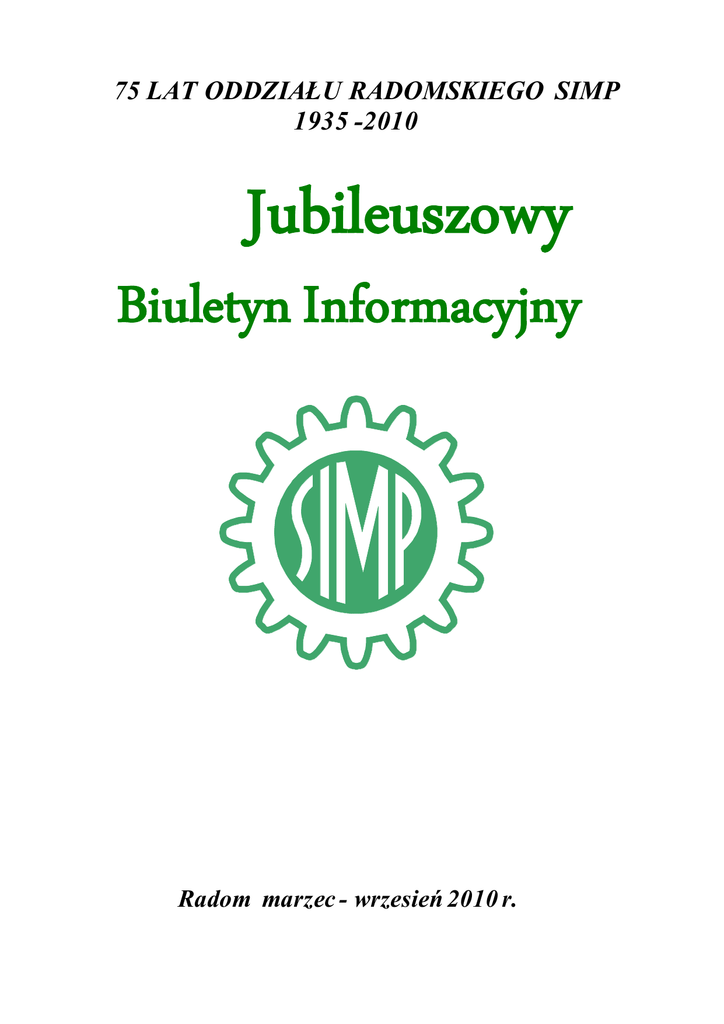 75 LAT ODDZIAŁU RADOMSKIEGO SIMP 1935 -2010 Jubileuszowy Biuletyn Informacyjny Radom marzec - wrzesień 2010 r. Dom Technika w Radomiu wg projektu architekta Tadeusza Derlatki. Ważniejsze wydarzenia historyczne budowy. Już od 1962 r. środowisko techniczne Radomia podjęło akcję na rzecz budowy własnego Domu Technika. Inicjatywa ta znalazła poparcie władz Radomia (szczególnie wiceprzewodniczących Miejskiej Rady Narodowej Zygmunta Wilczyńskiego i Jana Szczepańskiego- członka SIMP) wspierana również przez Zarząd Główny NOT. Zgodnie z uchwałą Nr 109/65 Prezydium Miejskiej Rady Narodowej w Radomiu ,w dn. 1 VI. 1965 r. został zatwierdzony Społeczny Komitet Budowy Domu Technika w Radomiu w składzie: 1. Przewodniczący – mgr Józef Budzynowski 6. Skarbnik –mgr inż. Henryk Łuczyński 2. Z-ca przewodn. –mgr inż. Stanisław Kusal 7. Z-ca skarbnika – Henryk Zawół 3. Z-ca przewodn. – mgr inż. Wojciech Wieliński 8. Członek –inż. Wiesław Zieliński 4. Sekretarz – Zygmunt Żelichowski 9. Członek – inż. Edward Sikorski 5. Z-ca sekret. – mgr inż. Włodzimierz Wrzesiński Komitet na plenarnym zebraniu 14.01.1966 r. uznał systematyczną nieobecność na zebraniach inż..Wiesława Zielińskiego i Henryka Zawały za ich rezygnację z pracy i w te miejsca powołał: inż. Mariana Jesionka ( SIT Włókienników Polskich) i inż. Wiktora Kinasa (SIMP Zakłady Metalowe). Uzyskano teren pod budowę, „MIASTOPROJEKT” opracował dokumentację techniczną i rozpoczęto budowę. Zebrane środki pochodziły z indywidualnych deklaracji członków SNT, dotacji zakładów pracy i Oddziałów SNT, sprzedaży „cegiełek” i dotacji Prezydium Miejskiej Rady Narodowej w Radomiu. Wg sprawozdania Społecznego Komitetu za 1966 r. wpłaty poszczególnych Stowarzyszeń NaukowoTechnicznych na rzecz budowy przedstawiał się następująco; · 1. SIMP deklaracja 175000 zł. wpłata 174741 zł. 7. SITPchem ,, 7670 zł. ,, 4449 zł. 2. SEP ,, 20550 zł. ,, 19215 zł. 8. SWP ,, 3500 zł. ,, 2100 zł. 3. STOP ,, 29460 zł. ,, 27659 zł. 9. PZITS ,, 2830 zł. ,, 5010 zł. 4. PZITB ,, 34210 zł. ,, 26933 zł. 10. SITHut ,, 3020 zł. ,, 3020 zł. 5. SITLiD ,, 30190 zł. ,, 29512 zł. 11. SITO ,, --,, 700 zł. 6. SITKosz ,, 11120 zł. ,, 9179 zł. 12. S Geod Pol. ,, 3000zł. ,, --Na sesji MRN w Radomiu 12 grudnia 1966 r. zatwierdzono dotację w wysokości 100 000 zł. Wydrukowano 61 000 „cegiełek” o łącznej wartości 1 500 000 zł. Rozpoczęto budowę Domu Technika w Radomiu, przy dużym zaangażowaniu społecznym, zarówno poszczególnych członków SNT, jak i radomskich zakładów pracy, które bezpłatnie wykonały wiele prac szczególnie przy wykończeniu i wystroju wnętrza. Pismem z dn.07.03.1966 r. Zarząd Koła SIMP w Zakładach Metalowych poinformował Komitet Budowy, że 1062 członków zadeklarowało wpłaty na budowę Domu Technika na łączną kwotę 116 770 zł. (w ratach przez 10 m-cy). Uroczystość otwarcia nowocześnie wyposażonego Domu Technika odbyła się 20.12.1977 r. Opracował J. Lalak 75-lecie Oddziału Radomskiego SIMP (1935 –2010) § 4. Dewizą Stowarzyszenia jest wytężona praca na polu techniki i wytwórczości, mająca na celu wyzyskanie bogactw przyrody ku zapewnieniu największego rozwoju gospodarczego i bezpieczeństwa Rzeczypospolite j. W społecznych warunkach swej działalności, S.I.M.P. rządzić się będzie zasadą równorzędnego traktowania i rozwiązywania zagadnień technicznych, leżących w interesie poszczególnych klas lub grup społecznych, stawiając na pierwszym planie potrzeby Narodu i Państwa, jako całości. Wyjątek ze Statutu SIMP z 1926 roku. 2 75-lecie Oddziału Radomskiego SIMP (1935 –2010) Słowo wstępne W kwietniu br. mija 75 lat od powstania w Radomiu Oddziału Stowarzyszenia Inżynierów Mechaników Polskich, jako pierwszego oddziału w kraju. Kreśląc krótką historię Stowarzyszenia opublikowaną z tej okazji pragnąłbym, aby była ona źródłem informacji o Stowarzyszeniu, ocaliła od zapomnienia fakty, wydarzenia, ale przedstawiła także ludzi, których zaangażowanie oraz chęć społecznego działania tworzyły historie ruchu stowarzyszeniowego na Ziemi Radomskiej. Kiedy z perspektywy 75 lat dzielących nas od powstania naszej organizacji spojrzymy na dorobek Stowarzyszenia w rozwijaniu myśli technicznej, doskonaleniu kadry inżynierów i techników, wdrażaniu nowych technologii w gospodarce widzimy, że jest on znaczący i powszechnie dostrzegany w regionie. Konferencje naukowo-techniczne, sympozja, odczyty i wykłady oraz wystawy techniczne organizowane w ciągu minionego 75lecia przyczyniały się do wzrostu aktywności a tym samym rozwoju kadry technicznej, zastosowania nowych rozwiązań technicznych jak również integracji środowiska inżynieryjno-technicznego. Stowarzyszenie SIMP, zrzeszeni w nim inżynierowie i technicy mechanicy, w różnych okresach, przez które przechodziła nasza Ojczyzna, zawsze starało się z solidnością, rzetelnością i pełnym zaangażowaniem wypełniać swoje zadania dla rozwoju regionu i kraju, co dokumentuje przedstawione opracowanie. Historia Oddziału Radomskiego Stowarzyszenia przedstawia problematykę różnych okresów istnienia organizacji, jej rozwoju, wzlotu i momentów bardziej ograniczonej działalności. W różnych okresach odmienne były zadania organizacji i możliwości jej działania. Po historycznych przeobrażeniach społeczno-politycznych i zmianach ustrojowych zmieniła się struktura przemysłu w regionie. Upadek wielu dużych przedsiębiorstw państwowych przemysłu maszynowego, przyczynił się do znacznego zmniejszenia ilo- ści Kół, a co za tym idzie zmniejszenia ilości członków. Należy wspomnieć, że miasto Radom i region radomski został dotknięty znacznym bezrobociem. Pracę straciło wielu inżynierów i techników mechaników, co pogłębiło trudności w działaniu organizacji. Dzisiaj przed Stowarzyszeniem sta