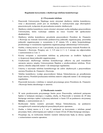 Załącznik do zarządzenia nr 118 Rektora UŚ z dnia 30 lipca 2014 r. Regulamin korzystania z służbowego telefonu komórkowego § 1 Przyznanie telefonu 1. Pracownik Uniwersytetu Śląskiego może otrzymać służbowy telefon komórkowy, wraz z akcesoriami, jeżeli jest on niezbędny w wykonywaniu jego obowiązków pracowniczych, wyłącznie do prowadzenia rozmów służbowych. 2. Służbowy telefon komórkowy może również otrzymać osoba niebędąca pracownikiem Uniwersytetu, która wykonuje zadania na rzecz Uczelni lub społeczności akademickiej. 3. Służbowy telefon komórkowy przydziela pracownikowi Prorektor ds. Finansów i Rozwoju na wniosek kierownika podstawowej jednostki organizacyjnej, pozostałej jednostki organizacyjnej w rozumieniu § 47 statutu UŚ, a także bezpośredniego przełożonego w rozumieniu regulaminu organizacyjnego administracji Uniwersytetu 4. Osobie, o której mowa w ust. 2 przydziela, na jej umotywowany wniosek Prorektor ds. Finansów i Rozwoju. Przepisy ust. 1, 5-9 oraz § 2 i § 3 stosuje się odpowiednio z zastrzeżeniem § 2 ust. 3. 5. Koszty związane z używaniem telefonu są pokrywane ze środków będących w dyspozycji danej jednostki organizacyjnej. Użytkowanie służbowego telefonu komórkowego odbywa się pod warunkiem zawarcia umowy między Uniwersytetem Śląskim a użytkownikiem telefonu. Wzór umowy określa załącznik numer 1 do niniejszego regulaminu. 6. 7. Umowę o używanie telefonu komórkowego do celów służbowych z pracownikiem zawiera Prorektor ds. Finansów i Rozwoju. 8. Telefon komórkowy wydaje pracownikowi Sekcja Teletechniczna po przedłożeniu kopii umowy. Protokół przekazania telefonu stanowi załącznik numer 2 do niniejszego regulaminu. 9. Pracownik korzysta z telefonu w ramach przyznanego przez Prorektora ds. Finansów i Rozwoju limitu określonego w umowie. § 2 Rozliczanie rozmów 1. W razie przekroczenia przyznanego limitu przez Pracownika, należność potrącana będzie w kolejnym miesiącu z wypłaty, chyba, że Pracownik w terminie do 29 dnia bieżącego miesiąca wpłaci wykazaną należność w kasie UŚ na podstawie otrzymanej faktury, z zastrzeżeniem ust. 3. 2. Rozliczanie limitu rozmów prowadzi Sekcja Teletechniczna, na podstawie szczegółowych zestawień połączeń przesyłanych przez operatora . 3. Osoba, o której mowa w § 1 ust. 2, należność za korzystanie z telefonu ponad przyznany limit, zobowiązana jest wpłacić w kasie UŚ do 29 dnia bieżącego miesiąca. 4. Przyjmuje się, że rozliczenia limitów rozmów dokonywane będą za okresy zgodne z zestawieniem rozmów operatora. § 3 Odpowiedzialność pracownika 1. Z chwilą otrzymania telefonu pracownik zobowiązany jest do utrzymywania telefonu w stałej gotowości do podjęcia rozmów w godzinach pracy, a w sytuacji gdy nie jest to możliwe, do uruchomienia poczty głosowej. 2. Telefon komórkowy i akcesoria są własnością Uniwersytetu Śląskiego i wydaje się je pracownikowi po przedmiotowym zawarciu umowy. Potwierdzenie przekazania telefonu stanowi protokół, o którym mowa w § 1 ust. 8. 3. W przypadku zmiany stanowiska pracy, pełnienia funkcji lub ustania stosunku pracy, pracownik zobowiązany jest do zwrotu telefonu i akcesoriów w ostatnim dniu pracy. 4. Pracownik nie może przekazać telefonu i akcesoriów osobom trzecim. 5. Pracownik jest odpowiedzialny za utrzymanie telefonu służbowego i akcesoriów w należytym stanie technicznym. Wszelkiego rodzaju uszkodzenia pracownik winien zgłaszać bezzwłocznie pracownikom Sekcji Teletechnicznej. 6. W przypadku utraty telefonu lub karty sim pracownik zobowiązany jest do niezwłocznego powiadomienia pracowników Sekcji Teletechnicznej 7. Pracownik sam pokrywa koszty naprawy telefonu komórkowego wynikłe z jego winy. 8. Pracownik ponosi odpowiedzialność materialną za powierzony telefon i akcesoria na zasadach identycznych jak za mienie Uniwersytetu Śląskiego. 9. W momencie rozwiązania umowy pracownik zobowiązany jest zwrócić telefon wraz z wyposażeniem do Sekcji Teletechnicznej. 10. Pracownik ponosi odpowiedzialność za oprogramowanie zainstalowane na telefonie. W szczególności za legalność tego oprogramowania. 2