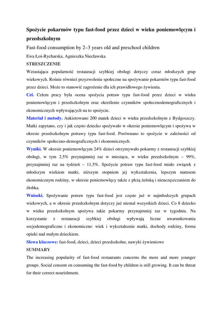 Spożycie pokarmów typu fast-food przez dzieci w wieku poniemowlęcym i przedszkolnym Fast-food consumption by 2–3 years old and preschool children Ewa Łoś-Rycharska, Agnieszka Niecławska STRESZCZENIE Wzrastająca popularność restauracji szybkiej obsługi dotyczy coraz młodszych grup wiekowych. Rośnie również przyzwolenie społeczne na spożywanie pokarmów typu fast-food przez dzieci. Może to stanowić zagrożenie dla ich prawidłowego żywienia. Cel. Celem pracy była ocena spożycia potraw typu fast-food przez dzieci w wieku poniemowlęcym i przedszkolnym oraz określenie czynników społecznodemograficznych i ekonomicznych wpływających na to spożycie. Materiał i metody. Ankietowano 200 matek dzieci w wieku przedszkolnym z Bydgoszczy. Matki zapytano, czy i jak często dziecko spożywało w okresie poniemowlęcym i spożywa w okresie przedszkolnym potrawy typu fast-food. Porównano to spożycie w zależności od czynników społeczno-demograficznych i ekonomicznych. Wyniki. W okresie poniemowlęcym 24% dzieci otrzymywało pokarmy z restauracji szybkiej obsługi, w tym 2,5% przynajmniej raz w miesiącu, w wieku przedszkolnym – 99%, przynajmniej raz na tydzień – 11,5%. Spożycie potraw typu fast-food miało związek z młodszym wiekiem matki, niższym stopniem jej wykształcenia, lepszym statusem ekonomicznym rodziny, w okresie poniemowlęcy także z płcią żeńską i nieuczęszczaniem do żłobka. Wnioski. Spożywanie potraw typu fast-food jest częste już w najmłodszych grupach wiekowych, a w okresie przedszkolnym dotyczy już niemal wszystkich dzieci. Co 8 dziecko w wieku przedszkolnym spożywa takie pokarmy przynajmniej raz w tygodniu. Na korzystanie z restauracji szybkiej obsługi wpływają liczne uwarunkowania socjodemograficzne i ekonomiczne: wiek i wykształcenie matki, dochody rodziny, forma opieki nad małym dzieckiem. Słowa kluczowe: fast-food, dzieci, dzieci przedszkolne, nawyki żywieniowe SUMMARY The increasing popularity of fast-food restaurants concerns the more and more younger groups. Social consent on consuming the fast-food by children is still growing. It can be threat for their correct nourishment. Aim. The aim of the study was to estimate fast-food consumption by 2–3 years old and preschool children as well as qualification of connections with sociodemographic and economic factors. Material and method. 200 mothers of pre-school children’s from Bydgoszcz were asked in questionnaire, if and how often their children 2–3 years old and in preschool age consumed fast-food. Fast-food consumption was analysed in dependence on sociodemographic and economic factors. Results. In 2-3 years old children 24% received fast-food, in 2,5% of them at least once in month, in preschool age 99% received fast-food, at least once a week 11,5 %. The fast-food consumption was connected with mother’s younger ge, lower degree of her education, better economic family status, in 2–3 years old period with female sex and the non-attendance to nursery. Conclusions. The fast-food consumption is frequent in the youngest groups of children and in preschool period concerns almost all children. Every 8 child in preschool age consumes such foods at least once a week. Numerous influence on using fast-food restaurants sociodemographic and economic factors: the mother’s age and education, family income, mode of young child care. Key-words: fast-food, children, preschool children, nutritional habits