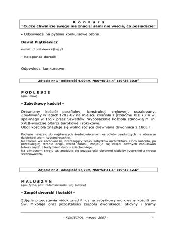 K o n k u r s "Cudze chwalicie swego nie znacie; sami nie wiecie, co posiadacie" • Odpowiedzi na pytania konkursowe zebrał: Dawid Piątkiewicz e-mail: [email protected] • Kategoria: dorośli Odpowiedzi konkursowe: Zdjęcie nr 1 - odległość 4,99km, N50°45’34,4” E19°36’30,0” PODLESIE (gm. Lelów) - Zabytkowy kościół Drewniany kościół parafialny, konstrukcji zrębowej, oszalowany. Zbudowany w latach 1782-87 na miejscu kościoła z przełomu XIII i XIV w. spalonego w 1657 przez Szwedów. Wyposażenie kościoła stanowią m. in. XVIII-wieczne ołtarze barokowe i rokokowe. Obok kościoła znajduje się wolno stojąca drewniana dzwonnica z 1808 r. Podlesie należało do najstarszych średniowiecznych ośrodków osadniczych na obszarze dzisiejszej ziemi częstochowskiej. Na terenie wsi zachował się interesujący zespół zabytków architektury. Obok kościoła, po przeciwległej stronie drogi, wśród zarośli, znajduje się zespół dawnych zabudowań folwarcznych z budynkiem dworu szlacheckiego. Na północnym skraju wsi znajdują się pozostałości obronnej siedziby rycerskiej z okresu średniowiecza. Zdjęcie nr 2 - odległość 17,7km, N50°54’41,1” E19°47’52,6” MALUSZYN (gm. Żytno, pow. radomszczański, woj. łódzkie) - Zespół dworski i kościół Zdjęcie przedstawia widok znad Pilicy na zabytkowy murowany kościół pw Św. Mikołaja oraz pozostałości zespołu dworskiego: oficyny i bramy - KONIECPOL, marzec 2007 - 1 Konkurs "Cudze chwalicie swego nie znacie; sami nie wiecie, co posiadacie" wjazdowej z wieżą z 1911 r. Obecny kościół wzniesiono w latach 1777-87 na miejscu spalonego w 1777r. Restaurowany został w 1870 r. i remontowany w 1903 r. Jest on bezstylową jednonawową budowlą z transeptem. Świątynia przykryta jest dwuspadowym dachem, na południowej ścianie kościoła znajduje się zegar słoneczny. We wnętrzu kościoła dominują sklepienia kolebkowe z lunetami, oraz krzyżowe. Interesującym zabytkiem jest chrzcielnica w kształcie łodzi (XVIII w.) oraz rzeźba św. Rocha z XVIII stulecia. Najstarsza wzmianka o Maluszynie pochodzi z 1266 r. Wieś była siedzibą rodu Ostrowskich, następnie Potockich. Do dziś zachowały się pozostałości zespołu pałacowo parkowego będącego niegdyś rezydencją rodu Potockich składającego się z: budynku gorzelni, czworaków, stróżówki przy bramie tylnej z XIX w. 2 oficyn i bramy wjazdowej oraz parku. Zdjęcie nr 3 - odległość 11,8km, N50°52’39,5” E19°41’30,3” BORZYKOWA (gm. Żytno, pow. radomszczański, woj. łódzkie) - Zabytkowy kościół murowany z 1844 r. W Borzykowej miał miejsce synod biskupów i zjazd książąt zwołany w lipcu 1210 roku przez arcybiskupa gnieźnieńskiego Henryka Kietlicza. Zjazd uchwalił przywileje dla Kościoła gwarantujące m.in. wolny wybór biskupów przez kapituły, podległość duchowieństwa pod sądy kościelne (Privilegium fori), zniesienie prawa księcia do spadku po zmarłych biskupach. Wtedy również oficjalnie wprowadzono celibat duchownych w Polsce. Tablica upamiętniająca synod: Imponujący Synod w Borzykowej 1210 r. Przewodniczyli: Arcyb. Henryk Kietlicz i Bł. Bp. Wincenty Kadłubek. Brali udział książęta: Leszek Biały, Konrad Mazowiecki, Władysław Odonica i wielu innych. ---1. ODRODZENIE DUCHOWE PODZIELONEGO NARODU. 2. ZJEDNOCZENIE DZIELNIC I UTWORZENIE SILNEJ POLSKI. 3. WSKAZANIE POLAKOM NA ŹRÓDŁA MOCY: MIŁOŚĆ BOGA -OJCZYZNY- I JEDNOŚCI Z KOŚCIOŁEM TO PODSTAWY TWORZENIA WIELKIEJ I POTĘŻNEJ POLSKI. - KONIECPOL, marzec 2007 - 2 Konkurs "Cudze chwalicie swego nie znacie; sami nie wiecie, co posiadacie" Inne warte uwagi ciekawostki dotyczące miejscowości: - w kościele znajduje się zabytkowa kamienna chrzcielnica licząca blisko 1000 lat (XI w.) oraz pochodzący z XVI w. dzwon. - W XIII w. Borzykowa była drugą pod względem wielkości (ok. 900 wiernych) parafią w kraju. - Przez kilkanaście dni trwania synodu gościło w Borzykowej około 1000 osób (wraz ze świtą i służbą). 19.XII.1981 r. sprowadzono z Jędrzejowa relikwie bł. bpa W. Kadłubka biorącego udział w synodzie o czym świadczy wmurowana w kościele tablica. Zdjęcie nr 4 - odległość 17,8km, N50°55’28,6” E19°45’19,0” SILNICZKA (gm. Żytno, pow. radomszczański, woj. łódzkie) - Zbór Braci Polskich Zdjęcie przedstawia unikatowy zabytek - dawny zbór ariański z 1. poł. XVII stulecia. Arianizm jest kierunkiem w teologii chrześcijańskiej zapoczątkowanym przez Ariusza (ok. 256-336), podważającym dogmat Trójcy Św. i zaprzeczającym boskiej naturze Chrystusa. Bracia Polscy to powstały w XVI wieku nurt protestantyzmu wywodzący się z radykalnego skrzydła reformacji. Głównymi ośrodkami ruchu arian były: Pińczów oraz Raków. Ruch reformacyjny obecny był również i w Koniecpolu (wtedy jeszcze Nowopolu) oraz sąsiednich miejscowościach. W drugiej połowie XVI w. zborami ariańskimi były m.in. kościoły w Kurzelowie, Kuczkowie, Podlesiu, Przyłęku, Seceminie. Obok zboru zlokalizowana jest płyta upamiętniająca mord na sześciu mieszkańcach Silniczki we wrześniu 1939 roku (ich grób znajduje się na cmentarzu w Maluszynie). Mordu dokonali hitlerowcy, mszcząc się w ten sposób za pochowanie polskiego żołnierza. Sama Silniczka została założona prawdopodobnie w XV stuleciu. W latach 70-tych XX wieku w trakcie prowadzonych tutaj wykopalisk natrafiono na pozostałości wczesnośredniowiecznego cmentarza oraz inne cenne wykopaliska archeologiczne. - KONIECPOL, marzec 2007 - 3 Konkurs "Cudze chwalicie swego nie znacie; sami nie wiecie, co posiadacie" Zdjęcie nr 5 - odległość 3.93km, N50°44’15,5” E19°41’04,6” WĄSOSZ (gm. Koniecpol) - Murowana kapliczka Wciśnięta pomiędzy ogrodzenie a gospodarcze zabudowania dawnej szkoły wiejskiej w Wąsoszu (obecnie w drewnianym budynku szkoły znajdują się zastępcze mieszkania dla wyeksmitowanych lokatorów). Kapliczkę wybudowali przed wojną