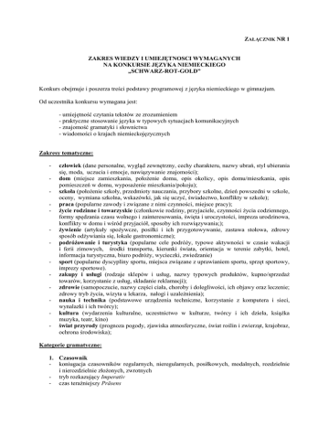 ZAŁĄCZNIK NR 1 ZAKRES WIEDZY I UMIEJĘTNOSCI WYMAGANYCH NA KONKURSIE JĘZYKA NIEMIECKIEGO „SCHWARZ-ROT-GOLD” Konkurs obejmuje i poszerza treści podstawy programowej z języka niemieckiego w gimnazjum. Od uczestnika konkursu wymagana jest: - umiejętność czytania tekstów ze zrozumieniem - praktyczne stosowanie języka w typowych sytuacjach komunikacyjnych - znajomość gramatyki i słownictwa - wiadomości o krajach niemieckojęzycznych Zakresy tematyczne: - - - człowiek (dane personalne, wygląd zewnętrzny, cechy charakteru, nazwy ubrań, styl ubierania się, moda, uczucia i emocje, nawiązywanie znajomości); dom (miejsce zamieszkania, położenie domu, opis okolicy, opis domu/mieszkania, opis pomieszczeń w domu, wyposażenie mieszkania/pokoju); szkoła (położenie szkoły, przedmioty nauczania, przybory szkolne, dzień powszedni w szkole, oceny, wymiana szkolna, wskazówki, jak się uczyć, świadectwo, konflikty w szkole); praca (popularne zawody i związane z nimi czynności, miejsce pracy); życie rodzinne i towarzyskie (członkowie rodziny, przyjaciele, czynności życia codziennego, formy spędzania czasu wolnego i zainteresowania, święta i uroczystości, impreza urodzinowa, konflikty w domu i wśród przyjaciół, sposoby ich rozwiązywania;); żywienie (artykuły spożywcze, posiłki i ich przygotowywanie, zastawa stołowa, zdrowy sposób odżywiania się, lokale gastronomiczne); podróżowanie i turystyka (popularne cele podróży, typowe aktywności w czasie wakacji i ferii zimowych, środki transportu, kierunki świata, orientacja w terenie zabytki, hotel, informacja turystyczna, biuro podróży, wycieczki, zwiedzanie) sport (popularne dyscypliny sportu, miejsca związane z uprawianiem sportu, sprzęt sportowy, imprezy sportowe). zakupy i usługi (rodzaje sklepów i usług, nazwy typowych produktów, kupno/sprzedaż towarów, korzystanie z usług, składanie reklamacji); zdrowie (samopoczucie, nazwy części ciała, choroby i dolegliwości, ich objawy oraz leczenie; zdrowy tryb życia, wizyta u lekarza, nałogi i uzależnienia); nauka i technika (podstawowe urządzenia techniczne, korzystanie z komputera i sieci, wynalazki i ich twórcy); kultura (wydarzenia kulturalne, uczestnictwo w kulturze, twórcy i ich dzieła, książka muzyka, teatr, kino) świat przyrody (prognoza pogody, zjawiska atmosferyczne, świat roślin i zwierząt, krajobraz, ochrona środowiska); Kategorie gramatyczne: 1. Czasownik - koniugacja czasowników regularnych, nieregularnych, posiłkowych, modalnych, rozdzielnie i nierozdzielnie złożonych, zwrotnych - tryb rozkazujący Imperativ - czas teraźniejszy Präsens - czas przeszły Präteritum (haben i sein) czas przeszły Perfekt (bez czasowników modalnych) bezokolicznik z/bez „zu” czas przyszły Futur I czas przeszły Präteritumczasowników modalnych czas przeszły Präteritum czasowników regularnych i nieregularnych czas Plusquamperfekt strona bierna czasu teraźniejszego Präsens i przeszłego Präteritum oraz Perfekt strona bierna z czasownikami modalnymi w czasie Präsens i Präteritum rekcja najczęściej używanych czasowników tryb przypuszczający Konjunktiv II Präteritum tryb warunkowy Konditional I (würde + Infinitiv I) 2. - Rzeczownik rzeczownik z rodzajnikiem nieokreślonym określonym i bez rodzajnika liczba mnoga rzeczownika rzeczowniki złożone deklinacja rzeczownika po rodzajniku określonym i nieokreślonym w I, III, IV przypadku dopełniacz nazw własnych dopełniacz rzeczownika deklinacja słaba rzeczownika rzeczowniki tworzone od bezokoliczników, przymiotników, imiesłowów i liczebników 3. - Zaimek zaimek osobowy i dzierżawczy w I, III i IV przypadku zaimek pytający, zaimek nieokreślony – jemand/ jeder/man, etwas zaimek nieosobowy- es zaimek wskazujący – dieser – we wszystkich przypadkach zaimek zwrotny w III i IV przypadku zaimek pytający „was fürein”/ „welcher”/ „welche”/ „welches“ we wszystkich 4. - Przymiotnik stopniowanie przymiotników zdania porównawcze przymiotnik w funkcji orzecznika odmiana przymiotnika po rodzajniku określonym i nieokreślonym odmiana przymiotnika po zaimku dzierżawczym odmiana przymiotnika po przeczeniu kein/keine odmiana przymiotnika bez rodzajnika 5. - Przysłówek przysłówek określający czas i miejsce stopniowanie przysłówków zdania porównawcze 6. Liczebniki główne i porządkowe - pisanie dat - określanie czasu zegarowego 7. Przeczenia - „nein”, „nicht”, „kein” w I, III i IV przypadku - zaimki nieokreślone: niemand, nichts oraz przysłówek: nie - przysłówek: doch 8. 9. - Przyimek przyimki z III, IV, III/IV przypadkiem służące do określania miejsca i czasu Nauka o zdaniu szyk zdania oznajmującego: pojedynczego, współrzędnie złożonego (ze spójnikami „und”, „oder”, „aber”, „sondern”, „denn”), z zaprzeczeniem szyk wyrazów w zdaniu pytającym: pytanie rozstrzygające, pytanie z zaimkiem pytającym zdania podrzędne dopełnieniowe ze spójnikami „dass” i „ob” oraz okolicznikowe przyczyny ze spójnikiem „weil” zdania złożone współrzędnie ze spójnikami wymagającymi szyku przestawnego (also, außerdem, dann, deshalb/deswegen/darum, sonst, trotzdem) zdania okolicznikowe czasu ze spójnikami „wenn”, „als” zdania podrzędne dopełnieniowe z zaimkami pytającymi: np.: „wer”, „was”, „wo”, „wohin”, „wie”, „wie lange”, „wie oft” , „wann”, „warum”. zdania okolicznikowe czasu ze spójnikami: während, bevor, seitdem, nachdem, bis zdanie przyzwalające ze spójnikiem: obwohl zdanie okolicznikowe celu ze spójnikami damit, konstrukcja bezokolicznikowa um...zu zdania przydawkowe z zaimkiem względnym der, die, das we wszystkich przypadkach zdanie warunkowe (Präsens, Konjunktiv II Präteritum i Konditional I) WYKAZ LITERATURY OBOWIĄZUJĄCEJ UCZESTNIKÓW ORAZ STANOWIĄCEJ POMOC DLA NAUCZYCIELA 1. Podręczniki do nauczania języka niemieckieg