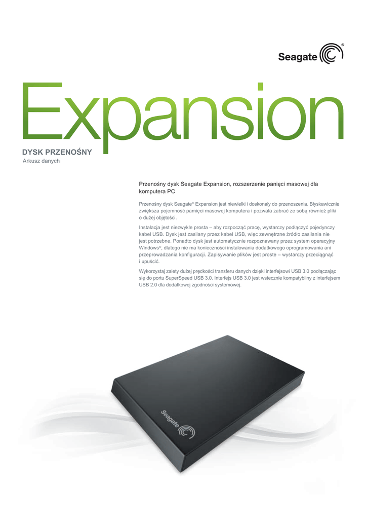DYSK PRZENOŚNY Arkusz danych Przenośny dysk Seagate Expansion, rozszerzenie panięci masowej dla komputera PC Przenośny dysk Seagate® Expansion jest niewielki i doskonały do przenoszenia. Błyskawicznie zwiększa pojemność pamięci masowej komputera i pozwala zabrać ze sobą również pliki o dużej objętości. Instalacja jest niezwykle prosta – aby rozpocząć pracę, wystarczy podłączyć pojedynczy kabel USB. Dysk jest zasilany przez kabel USB, więc zewnętrzne źródło zasilania nie jest potrzebne. Ponadto dysk jest automatycznie rozpoznawany przez system operacyjny Windows®, dlatego nie ma konieczności instalowania dodatkowego oprogramowania ani przeprowadzania konfiguracji. Zapisywanie plików jest proste – wystarczy przeciągnąć i upuścić. Wykorzystaj zalety dużej prędkości transferu danych dzięki interfejsowi USB 3.0 podłączając się do portu SuperSpeed USB 3.0. Interfejs USB 3.0 jest wstecznie kompatybilny z interfejsem USB 2.0 dla dodatkowej zgodności systemowej. DYSK PRZENOŚNY Parametry Opakowanie detaliczne Wymiary produktu Wymiary opakowania Wymiary kartonu zbiorczego Wymiary palety Długość (mm) 122,3 134 298 1219 Szerokość (mm) 81,1 170 199 1016 Głębokość (mm) 15,5 48 153 1208 Waga (kg) 0,17 0,31 2,11 313,34 Ilości Opakowania w kartonie zbiorczym 6 Liczba kartonów zbiorczych na palecie 140 Liczba warstw palety 7 Wymagania systemowe System operacyjny Windows® 7, Windows Vista®, Windows XP (32-bitowy oraz 64-bitowy) Port SuperSpeed USB 3.0 (wymagany dla prędkości transferu USB 3.0, kompatybilny wstecznie z portami USB 2.0 przy prędkościach transferu USB 2.0)1 Zawartość opakowania: Dysk Seagate Expansion Roczna gwarancja (AMER) Kabel USB 3.0 o długości 45,72 cm 2-letnia gwarancja (EMEA) Skrócona instrukcja obsługi 3-letnia gwarancja (APAC) Region Produkt Pojemność2 Numer modelu Kod UPC Kod EAN Kod UPC opakowania zbiorczego AMER Przenośny dysk Expansion 500 GB STBX500100 763649038956 — 10763649038953 AMER Przenośny dysk Expansion 750 GB STBX750100 763649038994 — 10763649038991 AMER Przenośny dysk Expansion 1 TB STBX1000101 763649041192 — 10763649041199 EMEA Przenośny dysk Expansion 500 GB STBX500200 — 7636490037528 10763649038977 EMEA Przenośny dysk Expansion 750 GB STBX750200 — 7636490037566 10763649039011 EMEA Przenośny dysk Expansion 1 TB STBX1000201 — 7636490039751 10763649041205 APAC Przenośny dysk Expansion 500 GB STBX500300 763649038987 — 10763649038984 APAC Przenośny dysk Expansion 750 GB STBX750300 763649039021 — 10763649039028 APAC Przenośny dysk Expansion 1 TB STBX1000301 763649041215 — 10763649041212 Zgodność urządzenia może być różna w zależności od konfiguracji sprzętu oraz systemu operacyjnego użytkownika. 2 W przypadku oznaczania pojemności dysków, jeden gigabajt (oznaczany także jako „GB”) jest równy jednemu miliardowi bajtów a jeden terabajt (oznaczany także jako „TB”) jest równy jednemu bilionowi bajtów. 1 www.seagate.com AMERYKA PŁN. I PŁD. AZJA/PACYFIK UROPA, BLISKI WSCHÓD I AFRYKA E Seagate Technology LLC 10200 South De Anza Boulevard, Cupertino, California 95014, USA, +1 408 658 1000 Seagate Singapore International Headquarters Pte. Ltd. 7000 Ang Mo Kio Avenue 5, Singapur 569877, +65 6485 3888 Seagate Technology SAS 16-18 rue du Dôme, 92100 Boulogne-Billancourt, Francja, +33 1 41 86 10 00 © 2012 Seagate Technology LLC. Wszelkie prawa zastrzeżone. Seagate Technology i logo Wave są znakami towarowymi lub zastrzeżonymi znakami towarowymi firmy Seagate Technology LLC lub jednej z jej firm zależnych w Stanach Zjednoczonych i/lub innych krajach. Wszystkie pozostałe znaki towarowe i zastrzeżone znaki towarowe należą do odpowiednich właścicieli. W przypadku oznaczania pojemności dysków, jeden gigabajt (oznaczany także jako „GB”) jest równy jednemu miliardowi bajtów; jeden terabajt (oznaczany także jako „TB”) jest równy jednemu bilionowi bajtów. W systemie operacyjnym komputera mogą być używane różne standardy pomiarowe i raportowana pojemność może być mniejsza. Ponadto część podanej pojemności jest używana do formatowania oraz w innych celach i może nie być dostępna do przechowywania danych. Za przestrzeganie wszelkich obowiązujących praw autorskich odpowiedzialność ponosi użytkownik. Firma Seagate zastrzega sobie prawo do wprowadzania zmian w ofercie produktów lub w ich parametrach bez powiadomienia. DS1762.4-1208PL