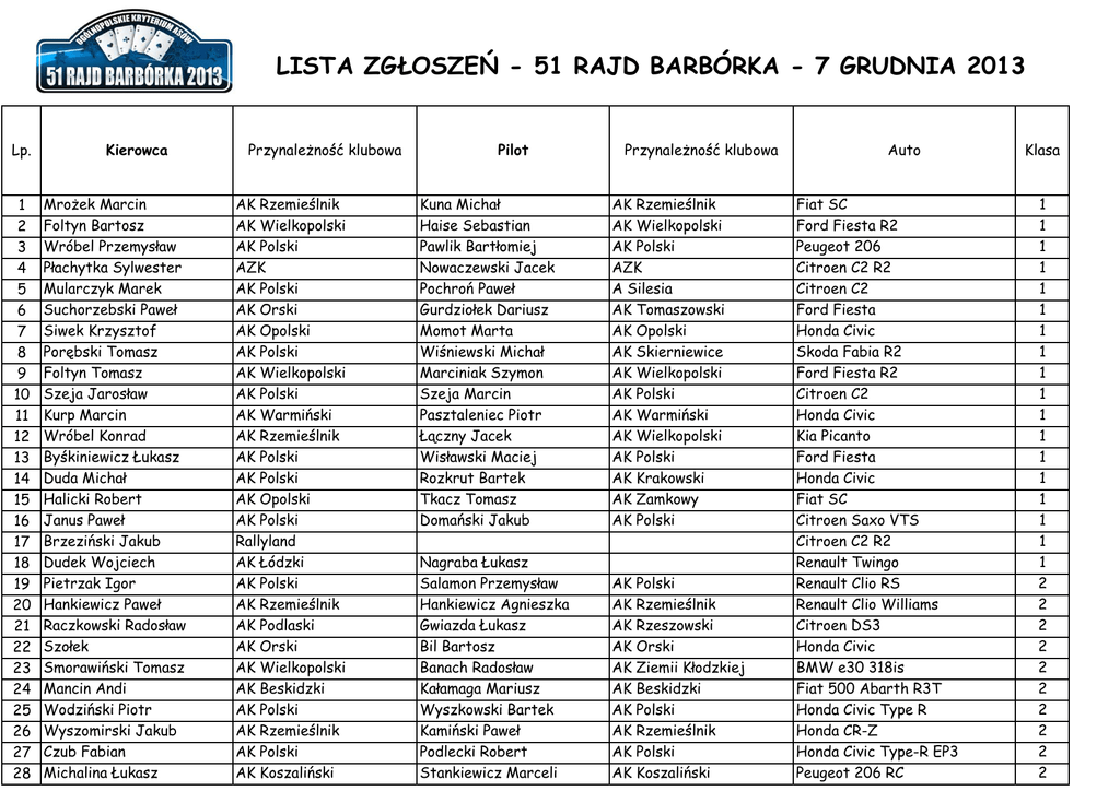 LISTA ZGŁOSZEŃ - 51 RAJD BARBÓRKA - 7 GRUDNIA 2013 Lp. 1 2 3 4 5 6 7 8 9 10 11 12 13 14 15 16 17 18 19 20 21 22 23 24 25 26 27 28 Kierowca Mrożek Marcin Foltyn Bartosz Wróbel Przemysław Płachytka Sylwester Mularczyk Marek Suchorzebski Paweł Siwek Krzysztof Porębski Tomasz Foltyn Tomasz Szeja Jarosław Kurp Marcin Wróbel Konrad Byśkiniewicz Łukasz Duda Michał Halicki Robert Janus Paweł Brzeziński Jakub Dudek Wojciech Pietrzak Igor Hankiewicz Paweł Raczkowski Radosław Szołek Smorawiński Tomasz Mancin Andi Wodziński Piotr Wyszomirski Jakub Czub Fabian Michalina Łukasz Przynależność klubowa AK Rzemieślnik AK Wielkopolski AK Polski AZK AK Polski AK Orski AK Opolski AK Polski AK Wielkopolski AK Polski AK Warmiński AK Rzemieślnik AK Polski AK Polski AK Opolski AK Polski Rallyland AK Łódzki AK Polski AK Rzemieślnik AK Podlaski AK Orski AK Wielkopolski AK Beskidzki AK Polski AK Rzemieślnik AK Polski AK Koszaliński Pilot Przynależność klubowa Kuna Michał Haise Sebastian Pawlik Bartłomiej Nowaczewski Jacek Pochroń Paweł Gurdziołek Dariusz Momot Marta Wiśniewski Michał Marciniak Szymon Szeja Marcin Pasztaleniec Piotr Łączny Jacek Wisławski Maciej Rozkrut Bartek Tkacz Tomasz Domański Jakub AK Rzemieślnik AK Wielkopolski AK Polski AZK A Silesia AK Tomaszowski AK Opolski AK Skierniewice AK Wielkopolski AK Polski AK Warmiński AK Wielkopolski AK Polski AK Krakowski AK Zamkowy AK Polski Nagraba Łukasz Salamon Przemysław Hankiewicz Agnieszka Gwiazda Łukasz Bil Bartosz Banach Radosław Kałamaga Mariusz Wyszkowski Bartek Kamiński Paweł Podlecki Robert Stankiewicz Marceli AK Polski AK Rzemieślnik AK Rzeszowski AK Orski AK Ziemii Kłodzkiej AK Beskidzki AK Polski AK Rzemieślnik AK Polski AK Koszaliński Auto Fiat SC Ford Fiesta R2 Peugeot 206 Citroen C2 R2 Citroen C2 Ford Fiesta Honda Civic Skoda Fabia R2 Ford Fiesta R2 Citroen C2 Honda Civic Kia Picanto Ford Fiesta Honda Civic Fiat SC Citroen Saxo VTS Citroen C2 R2 Renault Twingo Renault Clio RS Renault Clio Williams Citroen DS3 Honda Civic BMW e30 318is Fiat 500 Abarth R3T Honda Civic Type R Honda CR-Z Honda Civic Type-R EP3 Peugeot 206 RC Klasa 1 1 1 1 1 1 1 1 1 1 1 1 1 1 1 1 1 1 2 2 2 2 2 2 2 2 2 2 29 30 31 32 33 34 35 36 37 38 39 40 41 42 43 44 45 46 47 48 49 50 51 52 53 54 55 56 57 58 59 60 61 62 63 64 65 Lewandowski Łukasz Murawski Piotr Poletyło Paweł Chmielewski Jan Osowiecki Patryk Zawada Aleksander Wróblewski Kacper Płonka Jacek Virnik Berliński Marcin Sawko Dawid Maliński Rafał Butvilas Dominykas Gryc Tomasz Czopik Tomasz Bębenek Michał Oleksowicz Krzysztof Oleksowicz Maciej Grzyb Grzegorz Karnabal Stefan Ruta Szymon Grzesiński Rafał Sawicki Krzysztof Maszczyk Krzysztof Czarnecki Robert Kołodziej Janusz Kaszyński Adam Żarna Daniel Krawczyk Piotr Wasilewski Janusz Łata Damian Abramowski Marcin Ratajczyk Michał Kluza Waldemar Słobodzian Marcin Rzeźnik Maciej Ptaszek Hubert AK Rzemieślnik AK Polski AK Rzemieślnik AMK Rzeszowski AK Rzemieślnik RTM Radom Aoto Sport Gliwice AK Beskidzki AK Karkonoski AK Polski OKR AK Rzemieślnik AK Orski AK Krakowski AK Orski AK Rzemieślnik AK Rzemieślnik Speedstar AK Orski AK Radomski AK Kielecki AK Rzemieślnik AK Kielecki AK Rzemieślnik AMK Tarnów AK Rzemieślnik OKR AK Polski AK Orski AK Kielecki AK Rzemieślnik AK Królewski AK Beskidzki AK Galicyjski AK Polski AK Toruński Hryniuk Jarosław Kaczmarek Marek Waliszewska Justyna Chmielewska Monika Piwoński Adam Derousseaux Cathy Borko Tomasz Barnat Krzysztof Majewski Michał Chłuda Leszek Lipiński Przemysław Pietrusiński Kacper Vaitkevicius Renatas Gospodarczyk Szymon Malm Grzegorz Bębenek Grzegorz Sadowski Sebastian Kuśnierz Michał Siatkowski Daniel Pleskot Ireneusz Rozwadowski Sebastian Tutaj Mateusz Kapuścik Krzysztof Celiński Marcin Zawiślak Radosław Śmietana Patryk Bosek Przemysław Zaborniak Bartosz Dzyr Krzysztof TMSM Sparta AK Rzemieślnik AK Łódzki AK Krakowski AK Rzemieślnik ASA De Grasse AK Karkonoski AK Beskidzki AK Ziemii Kłodzkiej AK Polski AK Warmiński AK Polski Grudziński Michał Włoch Łukasz Paszkowska Dorota Miklaszewski Michał Witek Łukasz Mazur Przemysław Kozdroń Kamil AK Kielecki AK Karkonoski AK Królewski AK Krakowski AK Galicyjski AK Polski AK Galicyjski AK Polski AK Krakowski AK Orski AK Warmiński AK Orski Speedstar AK Polski AK Warmiński AK Kielecki AK Śląski AK Karkonoski AK Rzemieślnik AMK Tarnów AK Krakowski AK Warmiński AK Polski Honda Civic Type R Citroen C4 VTS BMW 318 IS Citroen DS3 BMW 318 Renault Clio Renault Clio Renault Clio R3 BMW M3 Peugeot 206 RC Renault Clio Sport Honda Civic Mitsubishi Lancer EVO 10 Mitsubishi Lancer Mitsubishi Lancer EVO X Subaru Impreza STI Subaru WRC Project Ford Fiesta S2000 Ford Fiesta R5 Subaru Impreza Ford Focus WRC 08 Mitsubishi Lancer EVO VS Subaru Impreza Mitsubishi Lancer EVO VIII Mitsubishi Lancer Subaru Impreza STI N14 Subaru Impreza GT Mitsubishi Lancer EVO RS Subaru Impreza WRX STI R4 Mitsubishi Lancer EVO IX Mitsubishi Lancer EVO IX Mitsubishi Lancer Mitsubishi Lancer Mitsubishi Colt Mitsubishi Lancer EVO IX Citroen Xsara WRC Skoda Fabia WRC 2 2 2 2 2 2 2 2 2 2 2 2 3 3 3 3 3 3 3 3 3 3 3 3 3 3 3 3 3 3 3 3 3 3 3 3 3 66 67 68 69 70 71 72 73 74 75 76 77 78 79 80 81 82 83 84 85 86 87 88 89 90 91 92 93 94 95 96 Piątkowski Karol Widłak Igor Możyszek Krzysztof Butruk Kamil Cichocki Michał Tomaszek Adam Bubik Krzysztof Tomaszek Paweł Steinhof Maciej Nowocień Mariusz Gagacki Marcin Topolewski Dariusz Stalmach Rafał Mikołajczyk Tomasz Kuchar Tomasz Typa Radosław Kabaciński Łukasz Chuchała Wojciech Grycan Adam Dul Grzegorz Podkalicka Klaudia Domżała Aron Sołowow Michał Wieczorek Artur Ludwiczak Bogdan Kajetanowicz Kajetan Kasperczyk Tomasz Nivette Filip Felix Rowiński Artur Szepieniec Andrzej TMSM Sparta AK Kielecki AK Polski AK Podlaski AK Polski AK Polski AK Warmiński AK Polski AK Krakowski AK Rzemieślnik LKT "Wyczół" Gościeradz LKT "Wyczół" Gościeradz Speedstar AK P