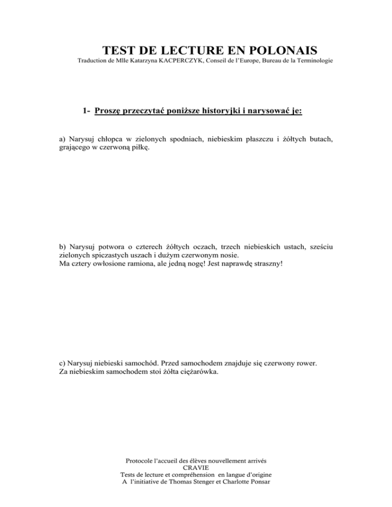 TEST DE LECTURE EN POLONAIS Traduction de Mlle Katarzyna KACPERCZYK, Conseil de l’Europe, Bureau de la Terminologie 1- Proszę przeczytać poniższe historyjki i narysować je: a) Narysuj chłopca w zielonych spodniach, niebieskim płaszczu i żółtych butach, grającego w czerwoną piłkę. b) Narysuj potwora o czterech żółtych oczach, trzech niebieskich ustach, sześciu zielonych spiczastych uszach i dużym czerwonym nosie. Ma cztery owłosione ramiona, ale jedną nogę! Jest naprawdę straszny! c) Narysuj niebieski samochód. Przed samochodem znajduje się czerwony rower. Za niebieskim samochodem stoi żółta ciężarówka. Protocole l’accueil des élèves nouvellement arrivés CRAVIE Tests de lecture et compréhension en langue d’origine A l’initiative de Thomas Stenger et Charlotte Ponsar 2 – Dobrze przeczytaj tekst: Pewnego pięknego majowego poranka dwa ślimaki decydują się na wyścig. „Do sałaty i z powrotem - mówi Hektor, szary ślimak. - Zgoda, odpowiada Nestor, biały ślimak, zaczynamy!” Nasi obaj przyjaciele ruszają powoli. Godziny mijają...Noc zapada. Kto wygrał wyścig? Nikt. Ślimaki zasnęły w sałacie! Przeczytaj pytania i zaznacz prawidłową odpowiedź: a) Jakiego koloru jest Nestor? 1 – Jest brunatny. 2 – Jest szary. 3 – Jest biały. 4 – Jest zielony. 5 – Nie wiem. b) Co chcą zrobić slimaki? 1 – Chcą zjeść sałatę. 2 – Chcą się umyć. 3 - Chcą się ścigać. 4 – Chcą się spotkać z przyjaciółmi. 5 – Nie wiem. c) Kto wygrał wyścig? 1 – Nestor. 2 – Hektor. 3 – Żaden z nich. 4 – Oba ślimaki. 5 – Nie wiem. d) Wybierz tytuł historyjki: 1 – Chory ślimak. 2 – Pies i ślimak. 3 – Wyścig ślimaków. 4 – Magiczna sałata. 5 – Nie wiem. Protocole l’accueil des élèves nouvellement arrivés CRAVIE Tests de lecture et compréhension en langue d’origine A l’initiative de Thomas Stenger et Charlotte Ponsar 3 – Dobrze przeczytaj poniższy tekst: Dzień jej narodzin był najszczęśliwszym dniem w życiu jej rodziców. „Jest wspaniała, mówi mama. - Oczywiście”, mówi tata. I była. Była perfekcyjna. „Jej imię powinno ją przypominać, mówi mama. - Jej imię powinno być perfekcyjne”, mówi tata. I było. Chryzantema. Rodzice nazwali ją Chryzantema. Chryzantema rośnie, rośnie i rośnie. Kiedy osiągnęła wiek, aby docenić swe imię, Chryzantema bardzo je polubiła. Uwielbiała je słyszeć, kiedy mama ją budziła. Uwielbiała je słyszeć, kiedy tata wołał ją na kolację. I uwielbiała szeptać je w łazience przed lustrem. Chryzantema, Chryzantema, Chryzantema... Chryzantema lubiła patrzeć na swoje imię napisane atramentem na kopercie i cukrem na cieście urodzinowym. Chryzantema, Chryzantema, Chryzantema. Chryzantema uważała, że jej imię jest perfekcyjne. Potem Chryzantema poszła do szkoly... (Fragment „Chryzantemy”, Kevin HENKES, Gallimard, 1998) Przeczytaj pytania i zaznacz prawidłową odpowiedź (odpowiedzi): a) Ile osób występuje w tekście? 1 – jedna 2 – dwie 3 – trzy 4 – cztery 5 – pięć 6 - Nie wiem. Protocole l’accueil des élèves nouvellement arrivés CRAVIE Tests de lecture et compréhension en langue d’origine A l’initiative de Thomas Stenger et Charlotte Ponsar b) Jaki był najszczęśliwszy dzień w życiu rodziców Chryzantemy? 1 – Dzień, w którym Chryzantema poszła do szkoły. 2 – Dzień jej urodzin. 3 – Dzień, w którym się urodziła. 4 – Dzień, w którym wyszła za mąż. 5 – Dzień, w którym nauczyła się pisać swoje imię. 6 – Nie wiem. c) W opisanej historyjce dwie rzeczy są perfekcyjne. Które? 1 – Tata i mama. 2 – Córka i mama. 3 - Córka i jej imię. 4 – Dzień narodzin i urodziny. 5 – Nie wiem. d) W opisanej historyjce Chryzantema lubi swoje imię napisane: 1 – piórem 2 – flamastrem 3 – atramentem 4 – cukrem 5 – pomarańczowym ołówkiem 6 – Nie wiem. e) Sposród następujących zdań wybierz najlepszy dalszy ciąg opowiadania: 1 – Chryzantema nauczyła się czytać, została wzorową uczennicą i miała wielu przyjaciół. 2 – Znalazła porzuconego psa, zaniosła go do domu i został jej przyjacielem. 3 – Od początku miała dużo niepowodzeń w szkole z powodu swego imienia. 4 – Nie potrafiła napisać swojego imienia i stała się złą uczennicą. 5 – Nie wiem. Protocole l’accueil des élèves nouvellement arrivés CRAVIE Tests de lecture et compréhension en langue d’origine A l’initiative de Thomas Stenger et Charlotte Ponsar