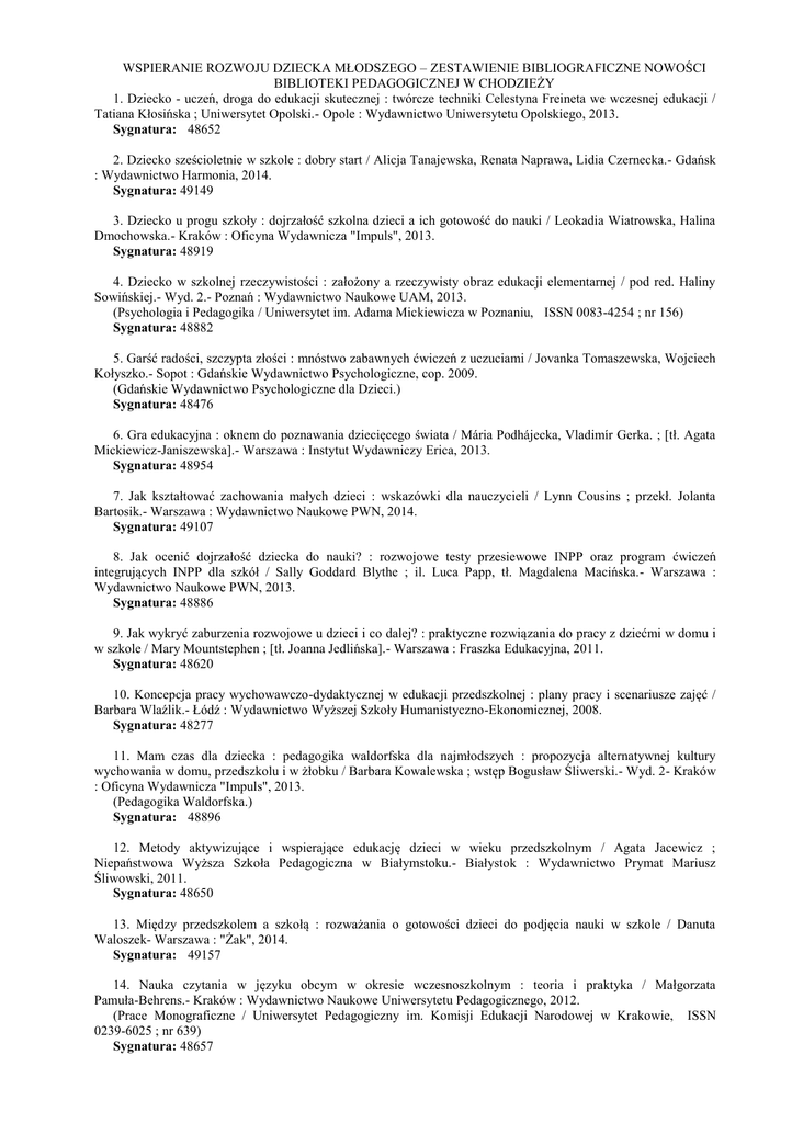 WSPIERANIE ROZWOJU DZIECKA MŁODSZEGO – ZESTAWIENIE BIBLIOGRAFICZNE NOWOŚCI BIBLIOTEKI PEDAGOGICZNEJ W CHODZIEŻY 1. Dziecko - uczeń, droga do edukacji skutecznej : twórcze techniki Celestyna Freineta we wczesnej edukacji / Tatiana Kłosińska ; Uniwersytet Opolski.- Opole : Wydawnictwo Uniwersytetu Opolskiego, 2013. Sygnatura: 48652 2. Dziecko sześcioletnie w szkole : dobry start / Alicja Tanajewska, Renata Naprawa, Lidia Czernecka.- Gdańsk : Wydawnictwo Harmonia, 2014. Sygnatura: 49149 3. Dziecko u progu szkoły : dojrzałość szkolna dzieci a ich gotowość do nauki / Leokadia Wiatrowska, Halina Dmochowska.- Kraków : Oficyna Wydawnicza "Impuls", 2013. Sygnatura: 48919 4. Dziecko w szkolnej rzeczywistości : założony a rzeczywisty obraz edukacji elementarnej / pod red. Haliny Sowińskiej.- Wyd. 2.- Poznań : Wydawnictwo Naukowe UAM, 2013. (Psychologia i Pedagogika / Uniwersytet im. Adama Mickiewicza w Poznaniu, ISSN 0083-4254 ; nr 156) Sygnatura: 48882 5. Garść radości, szczypta złości : mnóstwo zabawnych ćwiczeń z uczuciami / Jovanka Tomaszewska, Wojciech Kołyszko.- Sopot : Gdańskie Wydawnictwo Psychologiczne, cop. 2009. (Gdańskie Wydawnictwo Psychologiczne dla Dzieci.) Sygnatura: 48476 6. Gra edukacyjna : oknem do poznawania dziecięcego świata / Mária Podhájecka, Vladimír Gerka. ; [tł. Agata Mickiewicz-Janiszewska].- Warszawa : Instytut Wydawniczy Erica, 2013. Sygnatura: 48954 7. Jak kształtować zachowania małych dzieci : wskazówki dla nauczycieli / Lynn Cousins ; przekł. Jolanta Bartosik.- Warszawa : Wydawnictwo Naukowe PWN, 2014. Sygnatura: 49107 8. Jak ocenić dojrzałość dziecka do nauki? : rozwojowe testy przesiewowe INPP oraz program ćwiczeń integrujących INPP dla szkół / Sally Goddard Blythe ; il. Luca Papp, tł. Magdalena Macińska.- Warszawa : Wydawnictwo Naukowe PWN, 2013. Sygnatura: 48886 9. Jak wykryć zaburzenia rozwojowe u dzieci i co dalej? : praktyczne rozwiązania do pracy z dziećmi w domu i w szkole / Mary Mountstephen ; [tł. Joanna Jedlińska].- Warszawa : Fraszka Edukacyjna, 2011. Sygnatura: 48620 10. Koncepcja pracy wychowawczo-dydaktycznej w edukacji przedszkolnej : plany pracy i scenariusze zajęć / Barbara Wlaźlik.- Łódź : Wydawnictwo Wyższej Szkoły Humanistyczno-Ekonomicznej, 2008. Sygnatura: 48277 11. Mam czas dla dziecka : pedagogika waldorfska dla najmłodszych : propozycja alternatywnej kultury wychowania w domu, przedszkolu i w żłobku / Barbara Kowalewska ; wstęp Bogusław Śliwerski.- Wyd. 2- Kraków : Oficyna Wydawnicza "Impuls", 2013. (Pedagogika Waldorfska.) Sygnatura: 48896 12. Metody aktywizujące i wspierające edukację dzieci w wieku przedszkolnym / Agata Jacewicz ; Niepaństwowa Wyższa Szkoła Pedagogiczna w Białymstoku.- Białystok : Wydawnictwo Prymat Mariusz Śliwowski, 2011. Sygnatura: 48650 13. Między przedszkolem a szkołą : rozważania o gotowości dzieci do podjęcia nauki w szkole / Danuta Waloszek- Warszawa : "Żak", 2014. Sygnatura: 49157 14. Nauka czytania w języku obcym w okresie wczesnoszkolnym : teoria i praktyka / Małgorzata Pamuła-Behrens.- Kraków : Wydawnictwo Naukowe Uniwersytetu Pedagogicznego, 2012. (Prace Monograficzne / Uniwersytet Pedagogiczny im. Komisji Edukacji Narodowej w Krakowie, ISSN 0239-6025 ; nr 639) Sygnatura: 48657 15. Pokonywanie trudności w uczeniu się dzieci z dysleksją / Leokadia Wiatrowska.- Kraków : Oficyna Wydawnicza Impuls, 2013. Sygnatura: 48641 16. Pomysły na zabawy w przedszkolu / Martina Zeller ; il. Anja Rieger.- Kielce : Wydawnictwo Jedność, cop. 2013. Sygnatura: 48552 17. Rozwijanie kompetencji kluczowych uczniów w procesie edukacji wczesnoszkolnej / red. nauk. Janina Uszyńska-Jarmoc, Barbara Dudel, Małgorzata Głoskowska-Sołdatow.- Kraków : Oficyna Wydawnicza "Impuls" ; Białystok : Wydział Pedagogiki i Psychologii Uniwersytetu w Białymstoku, 2013. Sygnatura: 48907 18. Rozwijanie podstawowych form wypowiedzi ustnych i pisemnych ucznia szkoły podstawowej / Alicja Tanajewska, Iwona Kiełpińska, Dorota Kołodziejska.- Gdańsk : Wydawnictwo Harmonia, 2014. Sygnatura: 49211 19. Rozwój dziecka a metody nauczania czytania i pisania / Anna Jurek.- Gdańsk : Harmonia Universalis, 2012. Sygnatura: 48372 20. Sześciolatki w szkole / Dorota Smoleń, Karolina Piękoś.- Kraków : Centrum Edukacyjne Bliżej Przedszkola, 2013. Sygnatura: 48576 21. Trudności w czytaniu i pisaniu : rozważania teoretyczne i praktyczne / red. nauk. Izabela Pietras.- Warszawa : Difin, 2012. (Engram) Sygnatura: 48273 22. Wspomaganie rozwoju mowy i przygotowanie do nauki czytania i pisania / red. Krystyna Zielińska, Beata Krysiak.- Warszawa : Dr Josef Raabe, 2014. (Jak Wspomagać Rozwój Przedszkolaka) Sygnatura: 1 49164 23. Wspomaganie rozwoju myślenia dziecięcego i kompetencji matematycznych / red. Krystyna Zielińska, Beata Krysiak.- Warszawa : Dr Josef Raabe, 2014. (Jak Wspomagać Rozwój Przedszkolaka) Sygnatura: 49165 24. Wspomaganie rozwoju społeczno-emocjonalnego : jak wspomagać rozwój przedszkolaka / red. prowadząca Krystyna Zielińska, Beata Krysiak ; zespół aut. Beata Krysiak [et al.]. ; il. Lidia Nowak-Chomicz [et al.].Warszawa : Dr Josef Raabe Spółka Wydawnicza, cop. 2014. (Zajrzyj i znajdź) Sygnatura: 49166 25. Wychowanie i wspieranie rozwoju małych dzieci : dwulatki - program dla przedszkolnych grup żłobkowych, żłobków, klubów dziecięcych i domów / Anna Mikler-Chwastek.- Warszawa : Difin, 2013. Sygnatura: 106926 P, 39260, 32445, 48899, 64331 26. Wychowanie w szkole : wskazówki dla nauczycieli / Teresa Zubrzycka-Maciąg, Danuta Wosik-Kawala.Nowe wydanie.- Lublin : Wydawnictwo Uniwersytetu Marii Curie-Skłodowskiej, 2012. Sygnatura: 48006 27. Zabawy i zajęcia gimnastyczne w przedszkolu : podstawy teoretyczne, badania, praktyka / Agata Jacewicz ; Niepaństwowa Wyższa Szkoła Pedagogiczna w Białymstoku.- Białystok : Wydawnictwo Niepaństwowej Wyższej Szkoły Pedagogicznej, 2013. Sygnatura: 48776 28. Zestawy zadań do