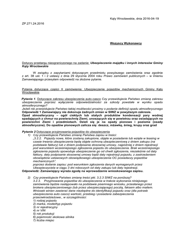 Kąty Wrocławskie, dnia 2016-04-19 ZP.271.24.2016 Wszyscy Wykonawcy Dotyczy przetargu nieograniczonego na zadanie: Ubezpieczenie majątku i innych interesów Gminy Kąty Wrocławskie W związku z zapytaniami dotyczącym przedmiotu powyższego zamówienia oraz zgodnie z art. 38 ust. 1 i 2 ustawy z dnia 29 stycznia 2004 roku Prawo zamówień publicznych – w imieniu Zamawiającego przesyłam odpowiedź na złożone pytanie. Pytania dotyczące części II zamówienia: Ubezpieczenie pojazdów mechanicznych Gminy Kąty Wrocławskie Pytanie 1. Dotyczące zakresu ubezpieczenia auto-casco Czy przewidujecie Państwo zmianę zakresu ubezpieczenia poprzez wyłączenie odpowiedzialności za szkody powstałe w wyniku opadu atmosferycznego? Jeżeli nie przewidujecie Państwo takiej możliwości prosimy o podanie definicji opadu atmosferycznego Odpowiedź 1 Zamawiający nie dokonuje żadnych zmian w SIWZ w powyższym zakresie. Opad atmosferyczny – ogół ciekłych lub stałych produktów kondensacji pary wodnej spadających z chmur na powierzchnię Ziemi, unoszących się w powietrzu oraz osiadających na powierzchni Ziemi i przedmiotach. Dzieli się je na opady pionowe i poziome (osady atmosferyczne). Do opadów pionowych zalicza się: deszcz, mżawkę, śnieg, krupy oraz grad Pytanie 2 Dotyczące przyjmowania pojazdów do ubezpieczenia 1) Czy przewidujecie Państwo zmianę Państwa zapisu w treści: „3.2.2. Pojazdy nowe, które zostaną zakupione, objęte w posiadanie lub wzięte w leasing w czasie trwania ubezpieczenia będą objęte ochroną ubezpieczeniową z dniem zakupu (na podstawie faktury) lub z dniem podpisania stosownej umowy, najpóźniej z dniem rejestracji pod warunkiem wcześniejszego zgłoszenia pojazdu do ubezpieczenia. Brak wcześniejszego zgłoszenia pojazdu spowoduje ubezpieczenie go od chwili zgłoszenia, niezależnie od daty faktury, daty podpisanie stosownej umowy bądź daty rejestracji pojazdu, z zastrzeżeniem obowiązków ustawowych obowiązkowego ubezpieczenia OC posiadaczy pojazdów mechanicznych”. poprzez dodanie zapisu: pod warunkiem zgłoszenia danych wymaganych przez Ubezpieczyciela w ciągu 3 dni roboczych od daty zakupu lub daty rejestracji. Odpowiedź: Zamawiający wyraża zgodę na wprowadzenie wnioskowanego zapisu. 2) Czy przewidujecie Państwo zmianę treści pkt. 3.2.3 SIWZ na poniższą? 3.2.3. Przyjmowanie pojazdów do ubezpieczenia w trakcie wykonania niniejszego zamówienia będzie następowało na podstawie pisemnego wniosku, przesłanego przez brokera ubezpieczeniowego (lub przez ubezpieczającego) pocztą, faksem albo mailem. Wniosek winien zawierać dane niezbędne do identyfikacji pojazdu oraz (dla potrzeb ubezpieczenia auto casco) wartość, przebieg i posiadane zabezpieczenia przeciwkradzieżowe., w szczególności: 1) rodzaj pojazdu 2) marka, model/typ pojazdu 3) nr rejestracyjny 4) nr VIN 5) rok produkcji 6) pojemność skokowa silnika 7) liczba miejsc 8) dopuszczalna masa całkowita (dotyczy pojazdów innych niż osobowe) 9) wartość pojazdu (przy Auto Casco) 10) ryzyka, w zakresie których ubezpieczany jest dany pojazd 11) okresy ubezpieczenia poszczególnych ryzyk 12) sumy ubezpieczenia danych ryzyk 13) urządzenia przeciwkradzieżowe oraz wyposażenie pojazdów, przy ubezpieczeniu AC. oraz, jeśli są dostępne to: 13) data pierwszej rejestracji 14) data ważności badania technicznego 15) przebieg 16) wykorzystanie pojazdu Odpowiedź: Zamawiający wyraża zgodę na wprowadzenie wnioskowanego zapisu. Pytanie 3 Dotyczące obligatoryjnych zasad likwidacji szkód 1) Czy przewidujecie Państwo zmianę treści pkt. 4.2. SIWZ na poniższą? W wypadku szkody komunikacyjnej dokonanie przez ubezpieczyciela lub na jego zlecenie oględzin pojazdu w ciągu 3 dni 4 dni roboczych od dnia skutecznego zgłoszenia szkody oraz przedstawienie kalkulacji kosztów naprawy w ciągu 2 dni 7 dni roboczych od dnia dokonania oględzin. W razie nie dokonania przez ubezpieczyciela lub na jego zlecenie oględzin w tym terminie, ubezpieczony ma prawo sam przekazać pojazd do warsztatu naprawczego, a ubezpieczycielowi dostarcza zdjęcia uszkodzonego pojazdu oraz kosztorys naprawy. Maksymalny termin akceptacji przez ubezpieczyciela kosztorysu, bez której warsztat nie może rozpocząć naprawy, wynosi 3 dni od jego skutecznego dostarczenia ubezpieczycielowi; po upływie tego terminu przyjmuje się akcept milczący. Ubezpieczyciel wypłaca odszkodowanie na podstawie faktur lub kosztorysu. Odpowiedź: Zamawiający wyraża zgodę na wprowadzenie wnioskowanego zapisu. 2) Czy przewidujecie Państwo zmianę treści pkt. 4.7. SIWZ na poniższą? 4.7. Przy ustalaniu kwoty odszkodowania nie będą miały zastosowania ustalone w OWU ubezpieczyciela ograniczenia, udziały własne bądź inne redukcje odszkodowania z tytułu wieku kierowcy oraz w przypadku popełnienia przez kierującego pojazdem wykroczenia drogowego, takiego jak: wymuszenie pierwszeństwa przejazdu, wyprzedzanie w miejscu niedozwolonym, wjazd na skrzyżowanie przy czerwonym świetle, przekroczenie dozwolonej prędkości, rozmowa kierującego w czasie jazdy przez telefon komórkowy, nieprzestrzeganie znaków drogowych STOP, zakaz ruchu, zakaz wjazdu, zakaz zatrzymywania się i postoju. Odpowiedź: Zamawiający nie dokonuje żadnych zmian w SIWZ w powyższym zakresie. 3) Czy przewidujecie Państwo zmianę treści pkt. 4.12. SIWZ na poniższą? W przypadku szkód o wartości nie przekraczających 2 000,00 zł Ubezpieczający/Ubezpieczony sam likwiduje szkodę przesyłając jednocześnie do Ubezpieczyciela pisemne zgłoszenie szkody, opis okoliczności szkody, dokumentację fotograficzną uszkodzonego mienia, zestawienie strat, kalkulacje, kosztorysy, kopie faktur zakupu utraconego mienia, kopie faktur naprawy maszyn, urządzeń lub sprzętu elektronicznego w przypadku szkód kradzieżowych dodatkowo poświadczenie z policji o wszczęciu dochodzenia. W przypadku szkód o wartości nie przekraczającej 2 000,00 zł 