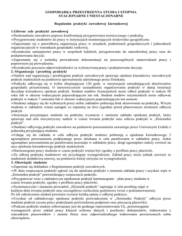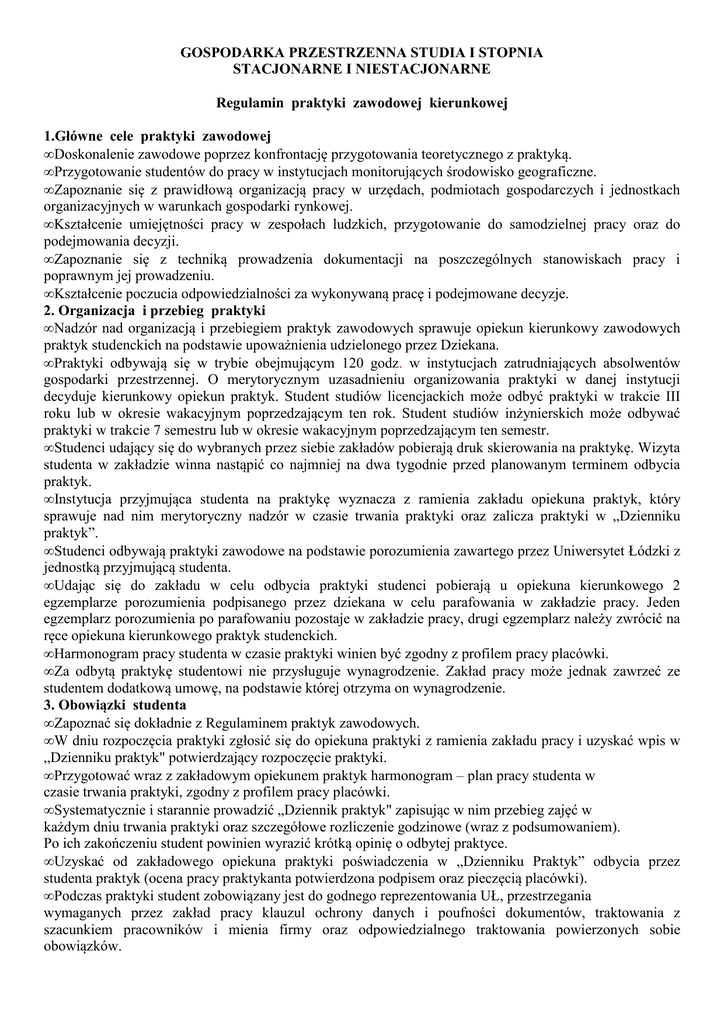 GOSPODARKA PRZESTRZENNA STUDIA I STOPNIA STACJONARNE I NIESTACJONARNE Regulamin praktyki zawodowej kierunkowej 1.Główne cele praktyki zawodowej • Doskonalenie zawodowe poprzez konfrontację przygotowania teoretycznego z praktyką. • Przygotowanie studentów do pracy w instytucjach monitorujących środowisko geograficzne. • Zapoznanie się z prawidłową organizacją pracy w urzędach, podmiotach gospodarczych i jednostkach organizacyjnych w warunkach gospodarki rynkowej. • Kształcenie umiejętności pracy w zespołach ludzkich, przygotowanie do samodzielnej pracy oraz do podejmowania decyzji. • Zapoznanie się z techniką prowadzenia dokumentacji na poszczególnych stanowiskach pracy i poprawnym jej prowadzeniu. • Kształcenie poczucia odpowiedzialności za wykonywaną pracę i podejmowane decyzje. 2. Organizacja i przebieg praktyki • Nadzór nad organizacją i przebiegiem praktyk zawodowych sprawuje opiekun kierunkowy zawodowych praktyk studenckich na podstawie upoważnienia udzielonego przez Dziekana. • Praktyki odbywają się w trybie obejmującym 120 godz. w instytucjach zatrudniających absolwentów gospodarki przestrzennej. O merytorycznym uzasadnieniu organizowania praktyki w danej instytucji decyduje kierunkowy opiekun praktyk. Student studiów licencjackich może odbyć praktyki w trakcie III roku lub w okresie wakacyjnym poprzedzającym ten rok. Student studiów inżynierskich może odbywać praktyki w trakcie 7 semestru lub w okresie wakacyjnym poprzedzającym ten semestr. • Studenci udający się do wybranych przez siebie zakładów pobierają druk skierowania na praktykę. Wizyta studenta w zakładzie winna nastąpić co najmniej na dwa tygodnie przed planowanym terminem odbycia praktyk. • Instytucja przyjmująca studenta na praktykę wyznacza z ramienia zakładu opiekuna praktyk, który sprawuje nad nim merytoryczny nadzór w czasie trwania praktyki oraz zalicza praktyki w „Dzienniku praktyk”. • Studenci odbywają praktyki zawodowe na podstawie porozumienia zawartego przez Uniwersytet Łódzki z jednostką przyjmującą studenta. • Udając się do zakładu w celu odbycia praktyki studenci pobierają u opiekuna kierunkowego 2 egzemplarze porozumienia podpisanego przez dziekana w celu parafowania w zakładzie pracy. Jeden egzemplarz porozumienia po parafowaniu pozostaje w zakładzie pracy, drugi egzemplarz należy zwrócić na ręce opiekuna kierunkowego praktyk studenckich. • Harmonogram pracy studenta w czasie praktyki winien być zgodny z profilem pracy placówki. • Za odbytą praktykę studentowi nie przysługuje wynagrodzenie. Zakład pracy może jednak zawrzeć ze studentem dodatkową umowę, na podstawie której otrzyma on wynagrodzenie. 3. Obowiązki studenta • Zapoznać się dokładnie z Regulaminem praktyk zawodowych. • W dniu rozpoczęcia praktyki zgłosić się do opiekuna praktyki z ramienia zakładu pracy i uzyskać wpis w „Dzienniku praktyk" potwierdzający rozpoczęcie praktyki. • Przygotować wraz z zakładowym opiekunem praktyk harmonogram – plan pracy studenta w czasie trwania praktyki, zgodny z profilem pracy placówki. • Systematycznie i starannie prowadzić „Dziennik praktyk" zapisując w nim przebieg zajęć w każdym dniu trwania praktyki oraz szczegółowe rozliczenie godzinowe (wraz z podsumowaniem). Po ich zakończeniu student powinien wyrazić krótką opinię o odbytej praktyce. • Uzyskać od zakładowego opiekuna praktyki poświadczenia w „Dzienniku Praktyk” odbycia przez studenta praktyk (ocena pracy praktykanta potwierdzona podpisem oraz pieczęcią placówki). • Podczas praktyki student zobowiązany jest do godnego reprezentowania UŁ, przestrzegania wymaganych przez zakład pracy klauzul ochrony danych i poufności dokumentów, traktowania z szacunkiem pracowników i mienia firmy oraz odpowiedzialnego traktowania powierzonych sobie obowiązków. 4. Działania placówki i opiekuna praktyk • Opiekun kierujący praktyką z ramienia placówki zapoznaje studenta z funkcjonowaniem placówki, jej zadaniami, celami, formami pracy, z pozostałymi pracownikami, dokumentacją, własnym warsztatem pracy, itp. • Opiekun wspólnie ze studentem ustala w pierwszych dniach praktyki jej plan, zgodnie z „Regulaminem praktyki zawodowej kierunkowej" oraz profilem działalności placówki. • Opiekun powinien umożliwić studentowi samodzielne przeprowadzenie zadań wynikających z ustalonego planu praktyki, a także omówić je ze studentem oraz ocenić. • Zajęcia realizowane przez studentów należy rozłożyć równomiernie w ciągu całego czasu trwania praktyki, tak by uniknąć ich spiętrzenia pod koniec praktyki. • Opiekun kierujący praktyką po jej zakończeniu omawia ze studentem osiągnięcia i trudności, jakie wystąpiły podczas trwania praktyki i poświadcza w „Dzienniku Praktyk” odbycie przez studenta praktyk oceniając działalność praktykanta stosując skalę od 2 do 5. W ocenie należy uwzględnić stopień przygotowania merytorycznego i stosunek studenta do obowiązków. 5. Zaliczenie praktyki zawodowej • Opiekun zakładowy kierujący praktyką po jej zakończeniu poświadcza w „Dzienniku Praktyk” odbycie przez studenta praktyk i ocenia działalność praktykanta stosując skalę ocen od 2 do 5. W ocenie należy uwzględnić stopień przygotowania merytorycznego i stosunek studenta do obowiązków. • Ocena wystawiona przez opiekuna w miejscu praktyki stanowi podstawę oceny z przedmiotu „Praktyka zawodowa". • Student, po zakończeniu praktyki, zobowiązany jest przedłożyć Kierunkowemu opiekunowi praktyk „Dziennik praktyk", nie później niż w ciągu 14 dni po zakończeniu praktyki (student studiów licencjackich do 31 maja na III roku studiów, a student studiów inżynierskich do 31 stycznia w 7 semestrze studiów). • Kierunkowy opiekun praktyk dokonuje odbioru oceny sporządzonej przez opiekuna praktyki z ramienia instytucji, potwierdzając ją wp