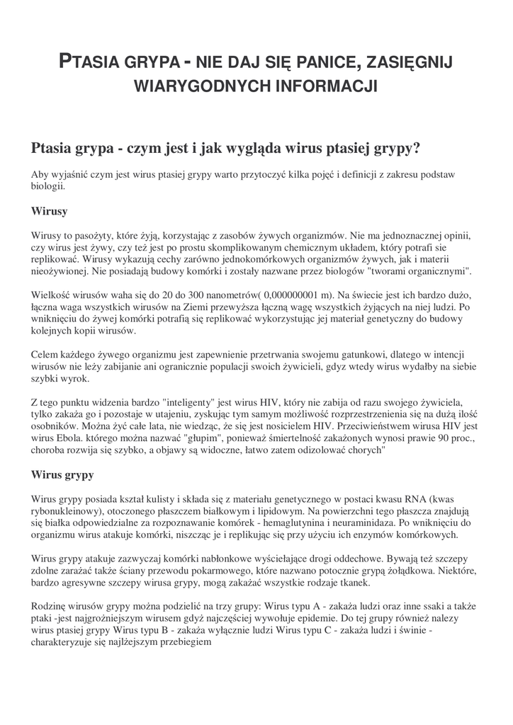 PTASIA GRYPA - NIE DAJ SI PANICE, ZASI GNIJ WIARYGODNYCH INFORMACJI Ptasia grypa - czym jest i jak wygl da wirus ptasiej grypy? Aby wyja ni czym jest wirus ptasiej grypy warto przytoczy kilka poj biologii. i definicji z zakresu podstaw Wirusy Wirusy to paso yty, które yj , korzystaj c z zasobów ywych organizmów. Nie ma jednoznacznej opinii, czy wirus jest ywy, czy te jest po prostu skomplikowanym chemicznym układem, który potrafi sie replikowa . Wirusy wykazuj cechy zarówno jednokomórkowych organizmów ywych, jak i materii nieo ywionej. Nie posiadaj budowy komórki i zostały nazwane przez biologów "tworami organicznymi". Wielko wirusów waha si do 20 do 300 nanometrów( 0,000000001 m). Na wiecie jest ich bardzo du o, ł czna waga wszystkich wirusów na Ziemi przewy sza ł czn wag wszystkich yj cych na niej ludzi. Po wnikni ciu do ywej komórki potrafi si replikowa wykorzystuj c jej materiał genetyczny do budowy kolejnych kopii wirusów. Celem ka dego ywego organizmu jest zapewnienie przetrwania swojemu gatunkowi, dlatego w intencji wirusów nie le y zabijanie ani ogranicznie populacji swoich ywicieli, gdyz wtedy wirus wydałby na siebie szybki wyrok. Z tego punktu widzenia bardzo "inteligenty" jest wirus HIV, który nie zabija od razu swojego ywiciela, tylko zaka a go i pozostaje w utajeniu, zyskuj c tym samym mo liwo rozprzestrzenienia si na du ilo osobników. Mo na y całe lata, nie wiedz c, e si jest nosicielem HIV. Przeciwie stwem wirusa HIV jest wirus Ebola. którego mo na nazwa "głupim", poniewa miertelno zaka onych wynosi prawie 90 proc., choroba rozwija si szybko, a objawy s widoczne, łatwo zatem odizolowa chorych" Wirus grypy Wirus grypy posiada kształ kulisty i składa si z materiału genetycznego w postaci kwasu RNA (kwas rybonukleinowy), otoczonego płaszczem białkowym i lipidowym. Na powierzchni tego płaszcza znajduj si białka odpowiedzialne za rozpoznawanie komórek - hemaglutynina i neuraminidaza. Po wnikni ciu do organizmu wirus atakuje komórki, niszcz c je i replikuj c si przy u yciu ich enzymów komórkowych. Wirus grypy atakuje zazwyczaj komórki nabłonkowe wy ciełaj ce drogi oddechowe. Bywaj te szczepy zdolne zara a tak e ciany przewodu pokarmowego, które nazwano potocznie gryp oł dkowa. Niektóre, bardzo agresywne szczepy wirusa grypy, mog zaka a wszystkie rodzaje tkanek. Rodzin wirusów grypy mo na podzieli na trzy grupy: Wirus typu A - zaka a ludzi oraz inne ssaki a tak e ptaki -jest najgro niejszym wirusem gdy najcz ciej wywołuje epidemie. Do tej grupy równie nalezy wirus ptasiej grypy Wirus typu B - zaka a wył cznie ludzi Wirus typu C - zaka a ludzi i winie charakteryzuje si najl ejszym przebiegiem Wirus ptasiej grypy Historia odkrycia ptasiej grypy si ga 1901 r. i odkryto go we Włoszech. Ptasi gryp wywołuje wirus o budowie podobnej do tego, który jest przyczyn "zwykłej" grypy. Wirus ptasiej grypy nale y do rodziny Orthmyxviridae, jest wirusem grypy typu A. Charakterystyczne dla wirusów grypy s dwa białka - hemaglutynina (H) i neuraminidaza (N). Ze wzgl du na obecno hemaglutynin (H) oraz neuraminidaz (N) wyró nia si 16 typów H, oraz 9 N, daje to 144 mo liwe kombinacje szczepów H i N, dla wirusa typy A. Do tej pory poznano 16 typów H i jedynie H5, H7 oraz H9 mog przenosi si pomi dzy organizmem ptaka a człowieka. Najbardziej znan i najbardziej patogenn odmian wirusa jest H5N1 - wirus ptasiej grypy. Jak zapobiega i strzec si przed ptasia gryp ? Ptasi gryp - według Organizacji Narodów Zjednoczonych ds. Wy ywienia i Rolnictwa (FAO) - mo na si zarazi poprzez kontakt z chorym ptactwem (dzikim lub hodowlanym) lub jego odchodami. Zainfekowane ptaki wydalaj wirusy wraz z odchodami, a pył z tych odchodów wdychaj ludzie. Wirus mo e by przenoszony m.in. na obuwiu, pojazdach, ubraniu, które znajdowały si na terenie targu zwierz cego lub ferm drobiu, i zostały ska one. Wirus mo e si te przenosi za po rednictwem ywno ci, np. drobiu mro onego. Bezpieczna jest tylko ywno poddana obróbce termicznej; pieczenie czy gotowanie niszczy wirusa, natomiast surowe jajka czy ółtka mog by niebezpieczne. Nie znaczy to jednak, e mo na je gotowane lub sma one mi so chorych lub podejrzanych o chorob ptaków; bezwzgl dnie powinno by ono zniszczone. Według FAO, nale y unika nie tylko kontaktu z zaka onym drobiem, ale nawet z klatkami i innymi przedmiotami, które mogły mie styczno z ptasimi odchodami. WHO zaleca, by jak najcz ciej my r ce mydłem lub innym detergentem; nie wystarczy bowiem mycie r k sam wod . Równie przy dezynfekcji przedmiotów i pomieszcze do zniszczenia wirusa potrzebna jest woda z dodatkiem detergentów. Sama czysta woda jest dobrym rodowiskiem dla wirusa, który pozostaje w niej aktywny przez dłu szy czas. Wskazówki dla hodowców przyzagrodowych: - karmienie i pojenie drobiu w pomieszczeniach zamkni tych, do których nie maj dost pu ptaki dzikie - przetrzymywanie drobiu w zamkni ciu lub na ogrodzonej przestrzeni, pod warunkiem uniemo liwienia kontaktów z dzikim ptactwem (siatki ochronne, zadaszenia - odizolowanie od innego drobiu kaczek i g si - przechowywanie paszy w pomieszczeniach zamkni tych lub pod szczelnym przykryciem - unikanie pojenia ptaków i czyszczenia kurników wod pochodz c spoza gospodarstwa (zbiorniki wodne i rzeki) - zgłaszanie lekarzowi weterynarii, wójtowi, burmistrzowi i innym organom władzy lokalnej przypadków padni drobiu - mycie r k wod z mydłem po ka dym kontakcie z drobiem lub ptakami dzikimi Wskazówki dla konsumentów: - jedz mi so drobiowe, przetwory drobiarskie i jaja tylko po ugotowaniu lub pieczeniu (temperatura minimum 70 stopni C) - myj dokładnie z u yciem detergentu deski, no e, talerze, na których przygotowywałe surowy drób; zamro enie mi sa nie niszczy wirusa ptasiej grypy - nie dotykaj, bez odpowiedniego zabezpieczenia, martwych lub sprawiaj cych wra enie chorych ptaków dzikich ani ubitego drobiu - zadbaj o to, aby dzieci unikały miejsc, gdzie bytuje dzikie ptactwo, ferm drobiu 