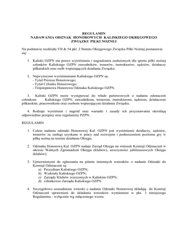 REGULAMIN NADAWANIA ODZNAK HONOROWYCH KALISKIEGO OKRĘGOWEGO ZWIĄZKU PIŁKI NOZNEJ Na podstawie rozdziału VII & 54 pkt. 2 Statutu Okręgowego Związku Piłki Nożnej postanawia się: 1. Kaliski OZPN ma prawo wyróżniania i nagradzania zasłużonych dla sportu piłki nożnej członków Kaliskiego OZPN zawodników, trenerów, instruktorów, sędziów, działaczy piłkarskich oraz osób wspierających działania Związku. 2. Najwyższymi wyróżnieniami Kaliskiego OZPN są: - Tytuł Prezesa Honorowego; - Tytuł Członka Honorowego; - Trójstopniowa Honorowa Odznaka Kaliskiego OZPN. 3. Kaliski OZPN może występować do władz państwowych o nadania odznaczeń członkom Kaliskiego OZPN, zawodnikom, trenerom, instruktorom, sędziom, działaczom piłkarskim, pracownikom oraz osobom wspierającym działania Związku. 4. Rodzaje wyróżnień i nagród oraz warunki i zasady ich przyznawania określają odpowiednie przepisy oraz regulaminy PZPN. REGULAMIN 1. Celem nadania odznaki Honorowej Kal. OZPN jest wyróżnienie działaczy, sędziów, trenerów za zasługi uzyskane w pracy nad rozwojem i podnoszeniem poziomu gry w piłkę nożną na terenie działania Okręgu. 2. Odznakę Honorową Kal. OZPN nadaje Zarząd Okręgu na wniosek Komisji Odznaczeń w okresie Walnych Zgromadzeń Okręgu (klubów), uroczystości jubileuszowych Okręgu (klubów). 3. Uprawnionymi do zgłaszania na piśmie imiennych wniosków o nadanie Odznaki do Komisji Odznaczeń są: a) Prezydium Kaliskiego OZPN; b) Wydziały Kaliskiego OZPN; c) Zarządy Klubów zrzeszonych w Kaliskim OZPN; d) członkowie Zarządu Kaliskiego OZPN. 4. Szczegółowo uzasadnione wnioski o nadanie Odznaki Honorowej składają do Komisji Odznaczeń uprawnieni do składania wniosków wymienieni w pkt. 3 niniejszego Regulaminu - wyłącznie wg załączonego wzoru. 5. Odznaka Honorowa kaliskiego OZPN jest odznaką trzystopniową: a) Brązową; b) Srebrną; c) Złotą. 6. Brązową Odznakę Honorową Kal. OZPN mogą otrzymać działacze, sędziowie, trenerzy i zawodnicy legitymujący się wieloletnim stażem pracy społecznej w OZPN lub klubach. 7. Srebrną Odznakę Honorową Kal. OZPN mogą otrzymać działacze, sędziowie, trenerzy i zawodnicy – aktywni i zasłużeni – posiadający Brązową Odznakę Honorową co najmniej od 3 lat. 8. Złotą Odznakę Honorową Kal. OZPN na wniosek Prezydium Kal. OZPN przyznawana jest uchwałą Walnego Zgromadzenia Delegatów i mogą otrzymywać działacze, sędziowie, trenerzy i zawodnicy szczególnie zasłużeni dla rozwoju i popularyzacji piłki nożnej, posiadający Srebrną Odznakę Honorową co najmniej od 3 lat. 9. Odznakę Honorową Kal. OZPN Brązową, Srebrną lub Złotą może być w uzasadnionych przypadkach nadana również osobą w kraju lub zagranicą, które położyły wybitne zasługi dla popularyzacji rozwoju sportu piłki nożnej na terenie działania Okręgu. 10. Osoby wyróżnione Odznaką Honorową Kal. OZPN otrzymują legitymację stwierdzającą nadanie Odznaki i prawo jej noszenia. 11. Nadanie Złotej Odznaki Honorowej uprawnia do bezpłatnego wstępu na wszystkie zawody piłkarskie rozgrywane na terenie działania Kal. OZPN. 12. Osoby, które w sposób oczywisty naruszają godność Obywatela RP lub postępują niezgodnie ze Statutem, czy łamią postanowienia albo przepisy Kal. OZPN i PZPN, tracą prawo do Odznaki. Decyzję w tej sprawie podejmuje Zarząd Kal. OZPN na wniosek Komisji Odznaczeń. 13. Komisja na wniosek Prezydium Zarządu przygotowuje i opiniuje wnioski o nadanie Odznaczeń przez Wielkopolski Związek Piłki Nożnej, Polski Związek Piłki Nożnej i Prezydenta RP. 14. Rejestr nadanych Odznak prowadzi Biuro Kaliskiego OZPN. 15. Regulamin niniejszy zatwierdzono Uchwałą Zarządu Kaliskiego OZPN w dniu 20 sierpnia 2012 r. ZARZĄD KALISKIEGO OKRĘGOWEGO ZWIĄZKU PIŁKI NOŻNEJ