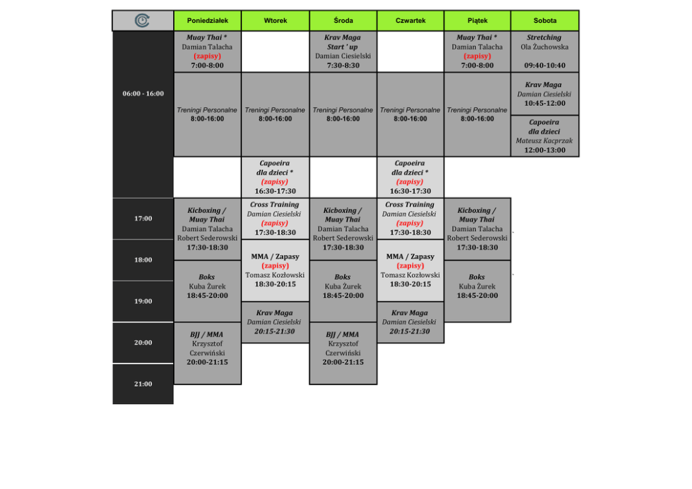 Poniedziałek Wtorek Muay Thai * Damian Talacha (zapisy) 7:00-8:00 Środa Czwartek Krav Maga Start ' up Damian Ciesielski 7:30-8:30 Piątek Sobota Muay Thai * Damian Talacha (zapisy) 7:00-8:00 Stretching Ola Żuchowska 09:40-10:40 Krav Maga Damian Ciesielski 10:45-12:00 06:00 - 16:00 Treningi Personalne 8:00-16:00 17:00 Kicboxing / Muay Thai Damian Talacha Robert Sederowski 17:30-18:30 18:00 19:00 20:00 21:00 Boks Kuba Żurek 18:45-20:00 BJJ / MMA Krzysztof Czerwiński 20:00-21:15 Treningi Personalne 8:00-16:00 Treningi Personalne Treningi Personalne Treningi Personalne 8:00-16:00 8:00-16:00 8:00-16:00 Capoeira dla dzieci * (zapisy) 16:30-17:30 Capoeira dla dzieci * (zapisy) 16:30-17:30 Cross Training Damian Ciesielski (zapisy) 17:30-18:30 MMA / Zapasy (zapisy) Tomasz Kozłowski 18:30-20:15 Krav Maga Damian Ciesielski 20:15-21:30 Kicboxing / Muay Thai Damian Talacha Robert Sederowski 17:30-18:30 Boks Kuba Żurek 18:45-20:00 BJJ / MMA Krzysztof Czerwiński 20:00-21:15 Cross Training Damian Ciesielski (zapisy) 17:30-18:30 MMA / Zapasy (zapisy) Tomasz Kozłowski 18:30-20:15 Krav Maga Damian Ciesielski 20:15-21:30 Capoeira dla dzieci Mateusz Kacprzak 12:00-13:00 Kicboxing / Muay Thai Damian Talacha Robert Sederowski ` 17:30-18:30 Boks Kuba Żurek 18:45-20:00 `