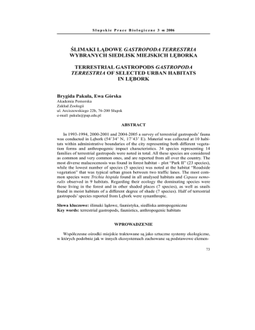 S ł u p s k i e P r a c e B i o l o g i c z n e 3 • 2006 ŚLIMAKI LĄDOWE GASTROPODA TERRESTRIA WYBRANYCH SIEDLISK MIEJSKICH LĘBORKA TERRESTRIAL GASTROPODS GASTROPODA TERRESTRIA OF SELECTED URBAN HABITATS IN LĘBORK Brygida Pakuła, Ewa Górska Akademia Pomorska Zakład Zoologii ul. Arciszewskiego 22b, 76-200 Słupsk e-mail: [email protected] ABSTRACT In 1993-1994, 2000-2001 and 2004-2005 a survey of terrestrial gastropods’ fauna was conducted in Lębork (54˚34’ N, 17˚43’ E). Material was collected at 10 habitats within administrative boundaries of the city representing both different vegetation forms and anthropogenic impact characteristics. 34 species representing 14 families of terrestrial gastropods were noted in total. All these species are considered as common and very common ones, and are reported from all over the country. The most diverse malacocenosis was found in forest habitat – plot “Park II” (23 species), while the lowest number of species (5 species) was noted at the habitat “Roadside vegetation” that was typical urban green between two traffic lanes. The most common species were Trichia hispida found in all analysed habitats and Cepaea nemoralis observed in 9 habitats. Regarding their ecology the dominating species were those living in the forest and in other shaded places (7 species), as well as snails found in moist habitats of a different degree of shade (7 species). Half of terrestrial gastropods’ species reported from Lębork were synanthropic. Słowa kluczowe: ślimaki lądowe, faunistyka, siedliska antropogeniczne Key words: terrestrial gastropods, faunistics, anthropogenic habitats WPROWADZENIE Współczesne ośrodki miejskie traktowane są jako sztuczne systemy ekologiczne, w których podobnie jak w innych ekosystemach zachowane są podstawowe elemen73 ty struktury i zasady funkcjonowania (Pisarski i Trojan 1976). Tworzą one bardziej od naturalnych złożony układ, co wynika z połączenia czynników biotycznych i środowiskowych ze strukturami ekonomiczno-techniczno-socjalnymi (Banaszak 1998). Badania nad ekologią zwierząt w środowiskach miejskich rozwijają się obecnie bardzo dynamicznie. Ciągle jednak znajomość fauny miast w porównaniu ze środowiskami naturalnymi jest niewielka. Do najlepiej poznanych grup zwierzęcych należą ptaki, ssaki i płazy wśród kręgowców oraz owady wśród bezkręgowców (Banaszak i Kasprzak 1978, Luniak 1998). Informacje dotyczące Gastropoda żyjących w miastach są stosunkowo nieliczne i często mają charakter fragmentaryczny ze względu na włączanie ich do grupy zwierząt glebowych. Istnieje zatem potrzeba uzupełniania wiedzy dotyczącej jakościowego oraz ilościowego występowania ślimaków w środowiskach miejskich. Celem badań było ustalenie listy gatunków ślimaków lądowych występujących w Lęborku oraz charakterystyka malakocenoz w różnych typach siedlisk tego miasta. MATERIAŁ I METODY BADAŃ Badania faunistyczne ślimaków lądowych miasta Lęborka prowadzono w trakcie sześciu sezonów wegetacyjnych obejmujących okres od maja do października, w latach 1993-1994, 2000-2001 i 2004-2005. Materiał zbierano w granicach administracyjnych miasta, w obrębie dziesięciu zróżnicowanych siedliskowo powierzchni zajmujących obszar od 100 do 300 m2. Przegląd i zwięzłą charakterystykę powierzchni wytypowanych do badań przedstawiono w tabeli 1. Każda z powierzchni była penetrowana co najmniej dwukrotnie w trakcie sezonu. Kontrole były przeprowadzane w ciepłe i wilgotne dni, najczęściej po opadach deszczu. Ślimaki oraz muszle wyszukiwano wzrokowo wśród roślinności, systemów korzeniowych, na powierzchni gleby, pod kamieniami, pod korą drzew. Wykonywano również przesiewki gleby i ściółki za pomocą sita. Duże okazy oznaczano bezpośrednio na miejscu, pozostałe ślimaki przenoszono w plastikowych pojemnikach do pracowni. Usypiano je eterem, a następnie konserwowano w alkoholu etylowym. Oznaczeń dokonywano w oparciu o klucze Urbańskiego (1957) i Wiktora (2004). Klasyfikację ekologiczną gatunków przeprowadzono na podstawie pracy Szybiak i in. (2005). Predyspozycję poszczególnych gatunków do synantropizacji podano za Riedlem (1988) i Wiktorem (2004). Gatunki najbardziej liczne wybrano na podstawie liczby zebranych osobników, natomiast za gatunki najczęstsze przyjęto te, których obecność stwierdzono w każdym sezonie badawczym na danej powierzchni. Analizy podobieństwa składu gatunkowego dokonano opierając się na indeksie Jaccarda (Dvořak i Čejka 2004) J=2c/(a+b)x100, gdzie a, b to liczby gatunków występujących w badanych ugrupowaniach, a c to liczba gatunków wspólnych w tych ugrupowaniach. 74 Tabela 1 Opis powierzchni objętych badaniami w Lęborku Table 1 Description of the study area in Lębork Nazwa powierzchni Charakterystyka Brzeg rzeki Strome zbocze nad rzeką Łebą, odznaczające się dużym stopniem wilgotności. Na powierzchni dominowała roślinność zielna oraz występowały pojedyncze drzewa. Park I Park śródmiejski stanowiący miejsce masowego wypoczynku mieszkańców. Wśród roślinności dominowały drzewa i krzewy liściaste poddawane regularnym zabiegom pielęgnacyjnym. 3 Park II Siedlisko w granicach Lasów Komunalnych Lęborka zlokalizowane na terenie kompleksu leśnego o charakterze lasu mieszanego świeżego. Charakteryzowało się obecnością gęstej warstwy podszytowej i znaczną wilgotnością podłoża. 4 Nasyp kolejowy Nasyp pełniący funkcję bocznicy kolejowej, o łagodnym nachyleniu oraz dużym nasłonecznieniu. Podłoże tej powierzchni badań było kamieniste i porośnięte skąpą roślinnością zielną. Lp. 1 2 5 Ogród 6 Cmentarz I 7 Cmentarz II 8 Łąka 9 Pas zieleni 10 Las Fragment działki uprawnej zlokalizowanej w obrębie kompleksu ogródków działkowych. Było to siedlisko o żyznej, próchniczej glebie poddawanej intensywnym zabiegom agrotechnicznym. Stanowiło miejsce uprawy rośli