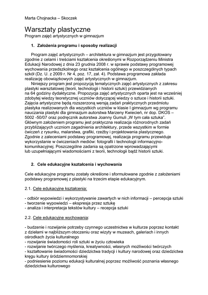 Marta Chojnacka – Skoczek Warsztaty plastyczne Program zajęć artystycznych w gimnazjum 1. Założenia programu i sposoby realizacji Program zajęć artystycznych – architektura w gimnazjum jest przygotowany zgodnie z celami i treściami kształcenia określonymi w Rozporządzeniu Ministra Edukacji Narodowej z dnia 23 grudnia 2008 r. w sprawie podstawy programowej wychowania przedszkolnego oraz kształcenia ogólnego w poszczególnych typach szkół (Dz. U. z 2009 r. Nr 4, poz. 17, zał. 4). Podstawa programowa zakłada realizację obowiązkowych zajęć artystycznych w gimnazjum. Niniejszy program jest propozycją tematycznych zajęć artystycznych z zakresu plastyki warsztatowej (teorii, technologii i historii sztuki) przewidzianych na 64 godziny dydaktyczne. Propozycja zajęć artystycznych oparta jest na wcześniej zdobytej wiedzy teoretycznej uczniów dotyczącej wiedzy o sztuce i historii sztuki. Zajęcia artystyczne będą rozszerzoną wersją zadań praktycznych przedmiotu plastyka realizowanych dla wszystkich uczniów w klasie I gimnazjum wg programu nauczania plastyki dla gimnazjum autorstwa Marzeny Kwiecień, nr dop. DKOS – 5002 -50/07 oraz podręcznik autorstwa Joanny Gumuli „W tym cała sztuka”. Głównym założeniem programu jest praktyczna realizacja różnorodnych zadań przybliżających uczniom zagadnienia architektury, przede wszystkim w formie ćwiczeń z rysunku, malarstwa, grafiki, rzeźby i projektowania plastycznego. Zgodnie z zaleceniami podstawy programowej, realizacja programu przewiduje wykorzystanie w ćwiczeniach mediów: fotografii i technologii informacyjnokomunikacyjnej. Poszczególne zadania są opatrzone wprowadzającymi lub uzupełniającymi wiadomościami z teorii, technologii bądź historii sztuki. 2. Cele edukacyjne kształcenia i wychowania Cele edukacyjne programu zostały określone i sformułowane zgodnie z założeniami podstawy programowej z plastyki na trzecim etapie edukacyjnym. 2.1. Cele edukacyjne kształcenia: - odbiór wypowiedzi i wykorzystywanie zawartych w nich informacji – percepcja sztuki - tworzenie wypowiedzi – ekspresja przez sztukę - analiza i interpretacja tekstów kultury – recepcja sztuki 2.2. Cele edukacyjne wychowania: - budzenie i rozwijanie potrzeby czynnego uczestnictwa w kulturze poprzez kontakt z dziełami w najbliższym otoczeniu oraz wizyty w muzeach, galeriach i innych ośrodkach życia kulturalnego - rozwijanie świadomości roli sztuki w życiu człowieka - rozwijanie twórczego myślenia, kreatywności, własnych możliwości twórczych - kształtowanie świadomości dziedzictwa tradycji i kultury narodowej oraz dziedzictwa kręgu kultury śródziemnomorskiej - podniesienie poziomu edukacji kulturalnej poprzez możliwość poznania własnego dziedzictwa kulturowego - dostrzeganie miejsca tradycji we współczesnej kulturze, poszanowanie i uznanie dla dorobku przeszłych pokoleń - kształtowanie tolerancji wobec odmienności innych kręgów kulturowych - podniesienie u uczniów własnej samooceny i wartości. 3. Treści nauczania 3.1. Odbiór wypowiedzi i wykorzystanie zawartych w nich informacji – percepcja sztuki Uczeń: - uczestniczy w percepcji dzieł sztuki poprzez wyszukiwanie w Internecie informacji o sztuce, zwiedzanie wirtualnych galerii sztuki i muzeów na świecie - ma świadomość różnorodności sztuki i jej związków z nowoczesnymi technologiami - potrafi formułować opinie, porównywać i wartościować szeroko rozumianą sztukę, a także działalność plastyczną rówieśników i własną - zna zasady prawa autorskiego dotyczące ochrony własności intelektualnej. 3.2. Tworzenie wypowiedzi – ekspresja przez sztukę Uczeń: - poszukuje różnorodnych możliwości ekspresji we własnych działaniach artystycznych - świadomie stosuje środki wyrazu plastycznego we własnych działaniach artystycznych - wykazuje się umiejętnością twórczego myślenia, kreatywnością, realizuje oryginalne projekty - tworzy różnorodne prace plastyczne, wykorzystując różne technologie, np. fotografię, graficzne programy komputerowe - realizuje i przedstawia własne projekty artystyczne za pomocą różnych nośników, np. prezentacji multimedialnych, fotografii - wykazuje się wiedzą na temat szeroko rozumianej sztuki oraz otaczającej współczesnego człowieka rzeczywistości wizualnej. 3.3. Analiza i interpretacja tekstów kultury – recepcja sztuki Uczeń: - rozróżnia style i kierunki sztuk plastycznych i architektury oraz umieszcza je w odpowiednim porządku chronologicznym - rozpoznaje najważniejsze dzieła sztuki europejskiej i polskiej; zna związki kultury danej epoki z przemianami społecznymi, polityką - dostrzega i analizuje różne konteksty dzieł kultury - odnajduje w stylu lub kierunku danej epoki inspiracje sztuką poprzednich epok - wykazuje się umiejętnością analizy dzieła sztuki – dostrzega poszczególne elementy dzieła, porównuje, znajduje wzajemne związki i podsumowuje zebrane informacje - zna podstawowe pojęcia i terminy związane ze sztuką - wyszukuje potrzebne informacje zawarte w tekstach kultury 4. Formy realizacji programu - Warsztaty rysunkowe - Warsztaty graficzne - Warsztaty malarskie - Warsztaty rzeźbiarskie - Warsztaty projektowania plastycznego - Warsztaty technik alternatywnych - Pogranicza sztuki - Muzealnictwo i konserwacja dzieł sztuki Zajęcia artystyczne „Warsztaty plastyczne” będą miały charakter zajęć dotykających swą istotą pełnego zakresu zagadnień związanych z wieloma obszarami sztuki. Warsztaty będą podzielone na grupy ze względu na dziedzinę i technikę wykonywanych prac. W trakcie rocznego kursu proponowane też są cztery wyjścia do galerii, muzeum lub pracowni plastycznej. Cykl zajęć zakończy wystawa końcoworoczna prezentująca najciekawsze prace powstałe w ciągu roku szkolnego. Szczegółowy wykaz ćwiczeń wraz z opisem: 1. Warsztaty rysunkowe: a. „Papier” – wykonanie ozdobneg