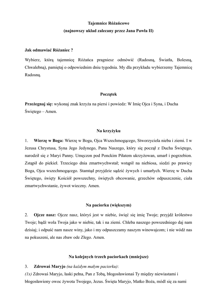 Tajemnice Różańcowe (najnowszy układ zalecany przez Jana Pawła II) Jak odmawiać Różaniec ? Wybierz, którą tajemnicę Różańca pragniesz odmówić (Radosną, Światła, Bolesną, Chwalebną), pamiętaj o odpowiednim dniu tygodnia. My dla przykładu wybierzemy Tajemnicę Radosną. Początek Przeżegnaj się: wykonaj znak krzyża na piersi i powiedz: W Imię Ojca i Syna, i Ducha Świętego – Amen. Na krzyżyku 1. Wierzę w Boga: Wierzę w Boga, Ojca Wszechmogącego, Stworzyciela nieba i ziemi. I w Jezusa Chrystusa, Syna Jego Jedynego, Pana Naszego, który się począł z Ducha Świętego, narodził się z Maryi Panny. Umęczon pod Ponckim Piłatem ukrzyżowan, umarł i pogrzebion. Zstąpił do piekieł. Trzeciego dnia zmartwychwstał; wstąpił na niebiosa, siedzi po prawicy Boga, Ojca wszechmogącego. Stamtąd przyjdzie sądzić żywych i umarłych. Wierzę w Ducha Świętego, święty Kościół powszechny, świętych obcowanie, grzechów odpuszczenie, ciała zmartwychwstanie, żywot wieczny. Amen. Na paciorku (większym) 2. Ojcze nasz: Ojcze nasz, któryś jest w niebie, święć się imię Twoje; przyjdź królestwo Twoje; bądź wola Twoja jako w niebie, tak i na ziemi. Chleba naszego powszedniego daj nam dzisiaj; i odpuść nam nasze winy, jako i my odpuszczamy naszym winowajcom; i nie wódź nas na pokuszeni, ale nas zbaw ode Złego. Amen. Na kolejnych trzech paciorkach (mniejsze) 3. Zdrowaś Maryjo (na każdym małym paciorku): (1x) Zdrowaś Maryjo, łaski pełna, Pan z Tobą, błogosławionaś Ty między niewiastami i błogosławiony owoc żywota Twojego, Jezus. Święta Maryjo, Matko Boża, módl się za nami grzesznymi teraz i w godzinę śmierci naszej. Amen. (2x) Zdrowaś Maryjo, łaski pełna, Pan z Tobą, błogosławionaś Ty między niewiastami i błogosławiony owoc żywota Twojego, Jezus. Święta Maryjo, Matko Boża, módl się za nami grzesznymi teraz i w godzinę śmierci naszej. Amen. (3x) Zdrowaś Maryjo, łaski pełna, Pan z Tobą, błogosławionaś Ty między niewiastami i błogosławiony owoc żywota Twojego, Jezus. Święta Maryjo, Matko Boża, módl się za nami grzesznymi teraz i w godzinę śmierci naszej. Amen. Przed dużym paciorkiem 4. Chwała Ojcu: Chwała Ojcu i Synowi, i Duchowi Świętemu. Jak była na początku, teraz i zawsze, i na wieki wieków. Amen. Teraz możemy rozpocząć odmawianie kolejnych dziesiątek Różańca oraz rozważać jego tajemnice. Tajemnica 1 "Zwiastowanie Maryi, iż jest matką Syna Bożego" Tajemnice wypowiadamy przed dużym paciorkiem. Odmawiamy jedną dziesiątkę Różańca czyli: 1 x Ojcze Nasz (duży paciorek) 10 x Zdrowaś Maryjo (małe paciorki) 1 x Chwała Ojcu (przed dużym paciorkiem) Tajemnica 2 "Nawiedzenie świętej Elżbiety" Tajemnice wypowiadamy przed dużym paciorkiem. Odmawiamy jedną dziesiątkę Różańca czyli: 1 x Ojcze Nasz (duży paciorek) 10 x Zdrowaś Maryjo (małe paciorki) 1 x Chwała Ojcu (przed dużym paciorkiem) Tajemnica 3 "Narodzenie Pana Jezusa" Tajemnice wypowiadamy przed dużym paciorkiem. Odmawiamy jedną dziesiątkę Różańca czyli: 1 x Ojcze Nasz (duży paciorek) 10 x Zdrowaś Maryjo (małe paciorki) 1 x Chwała Ojcu (przed dużym paciorkiem) Tajemnica 4 "Ofiarowanie Jezusa w świątyni" Tajemnice wypowiadamy przed dużym paciorkiem. Odmawiamy jedną dziesiątkę Różańca czyli: 1 x Ojcze Nasz (duży paciorek) 10 x Zdrowaś Maryjo (małe paciorki) 1 x Chwała Ojcu (przed dużym paciorkiem) Tajemnica 5 "Odnalezienie Pana Jezusa wśród uczonych w świątyni" Tajemnice wypowiadamy przed dużym paciorkiem. Odmawiamy jedną dziesiątkę Różańca czyli: 1 x Ojcze Nasz (duży paciorek) 10 x Zdrowaś Maryjo (małe paciorki) 1 x Chwała Ojcu (przed dużym paciorkiem) Na zakończenie Odmawiamy Pod Twoją obronę: Pod Twoją obronę uciekamy się, święta Boża Rodzicielko, naszymi prośbami racz nie gardzić w potrzebach naszych, ale od wszelakich złych przygód racz nas zawsze wybawiać. Panno chwalebna i błogosławiona. O Pani nasza, Orędowniczko nasza, Pocieszycielko nasza. Z Synem swoim nas pojednaj, Synowi swojemu nas polecaj, swojemu Synowi nas Oddawaj. Przeżegnaj się: wykonaj znak krzyża na piersi i powiedz: W Imię Ojca i Syna, i Ducha Świętego - Amen. W ten sposób odmówisz kolejne części Modlitwy Różańcowej. Życzymy powodzenia w odmawianiu Twojej pierwszej Pełnej Modlitwy Różańcowej!
